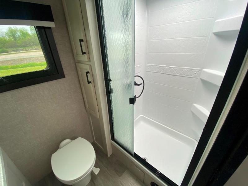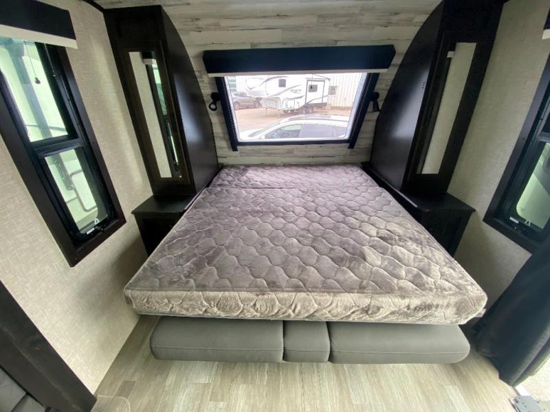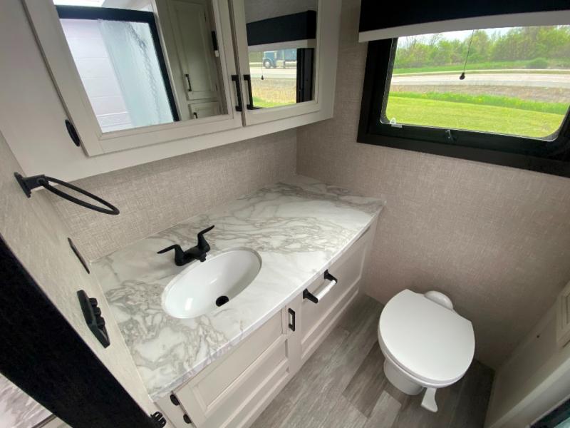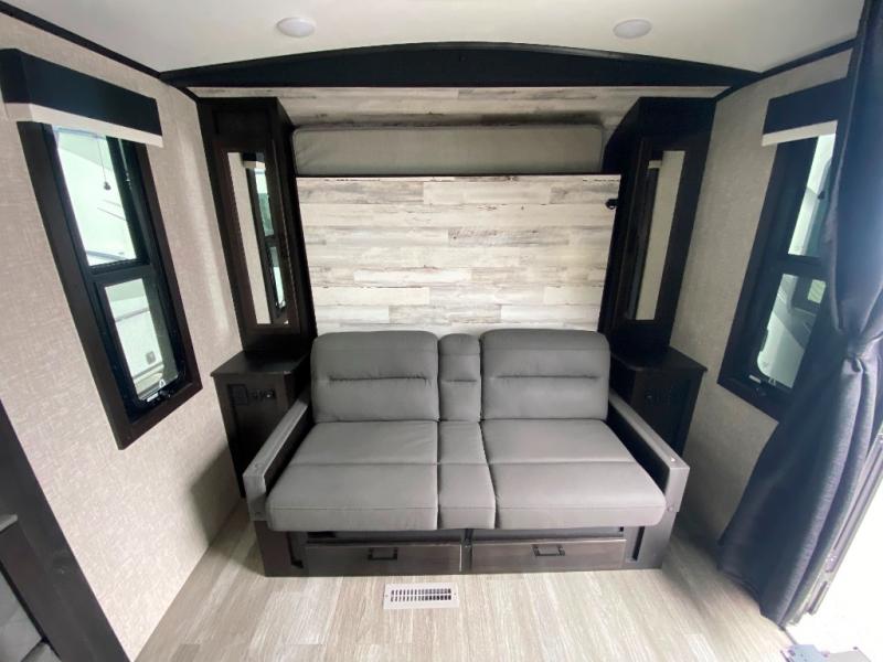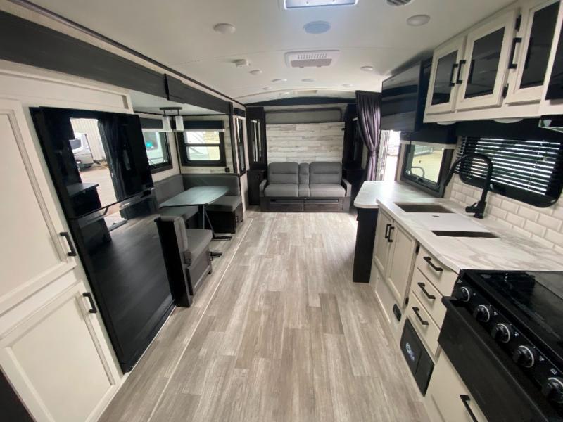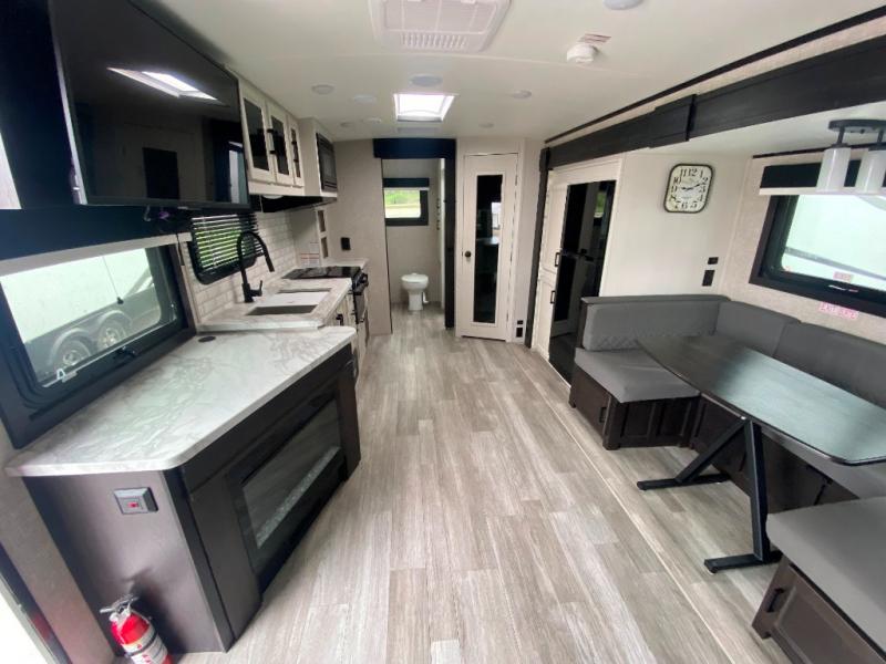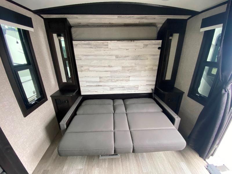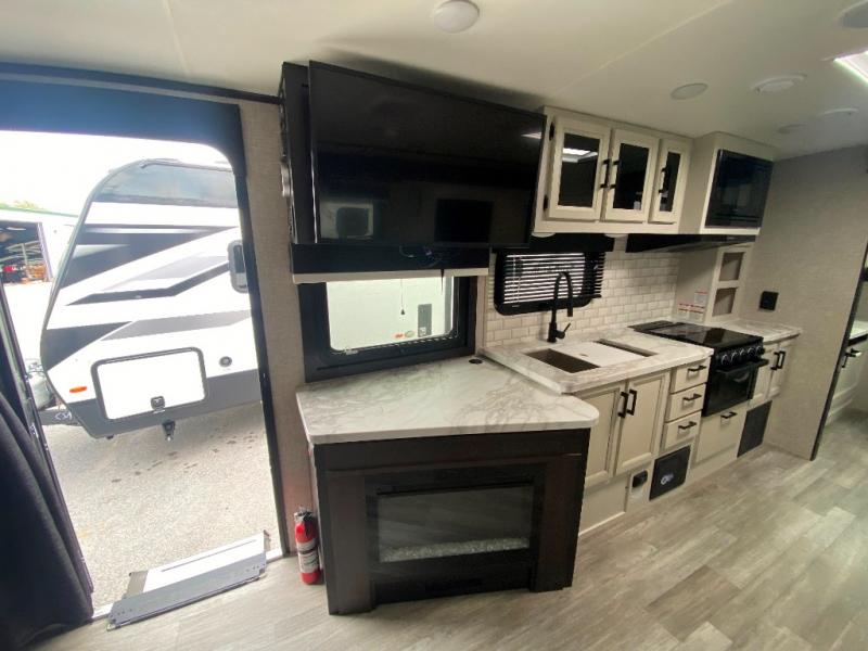 This versatile travel trailer is perfect for your family of four. The Murphy bed will provide comfortable sleeping space at night, and the jack-knife sofa will give you a place to relax during the day. Your crew can gather around the U-shaped dinette across from the fireplace, plus there is an LED TV here for movie night. This model also includes an outside kitchen under the 19' awning for an inviting outdoor living space, and two pass-through storage compartments for all your gear. And don't forget about the spacious full rear bath with plenty of counterspace, a medicine cabinet and a linen closet for clean towels!