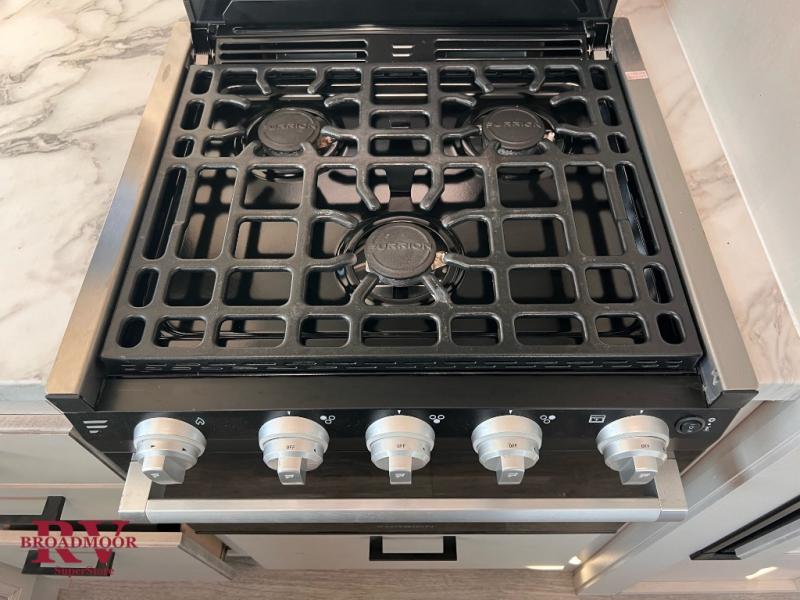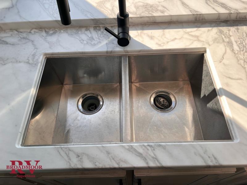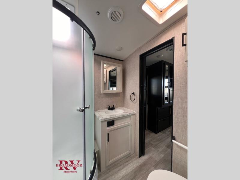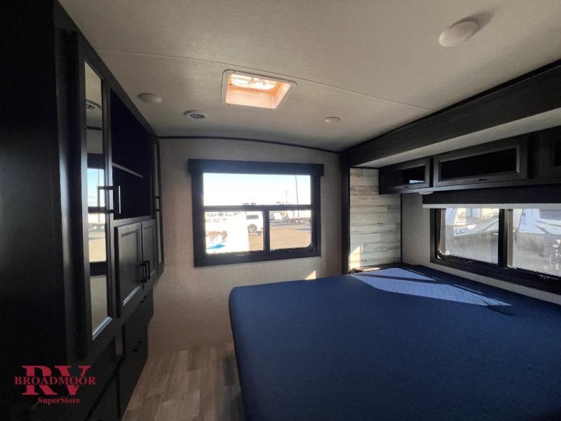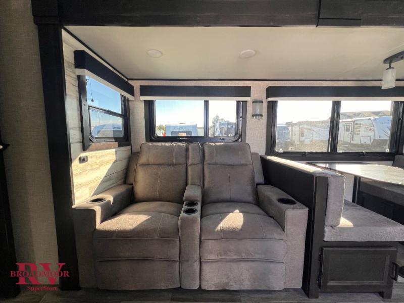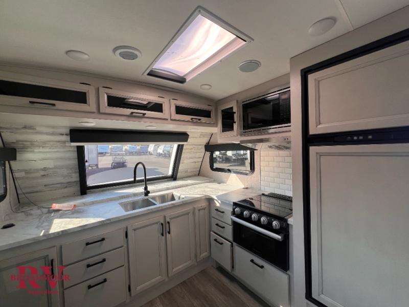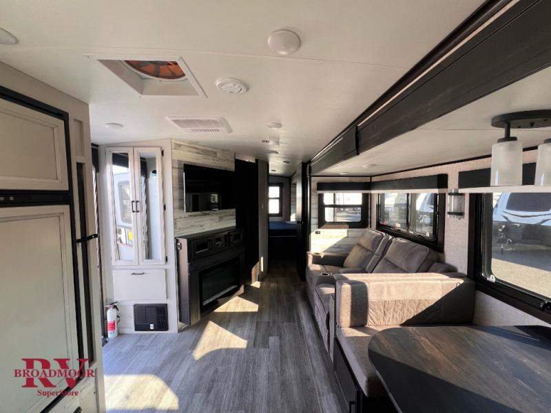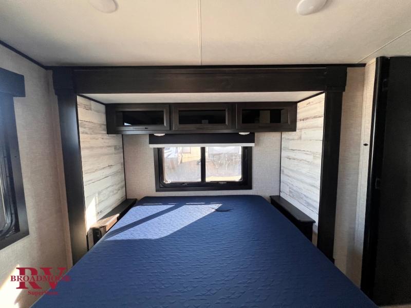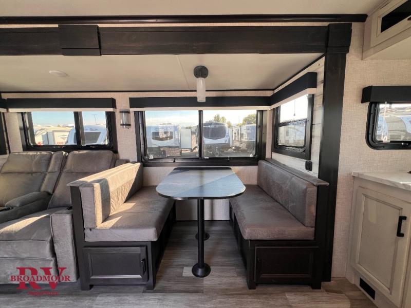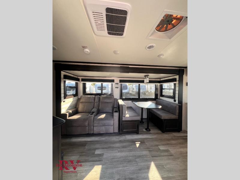You will experience a smooth flow of traffic in and out of this travel trailer with dual entry doors! The rear private bedroom has one of the entrance/exit doors so you can sneak out for an early morning fishing trip, a queen bed slide for more space, and a wardrobe for your clothes. The full bathroom has a radius shower to clean up in and handy storage areas like a linen closet, a medicine cabinet, and a shelf. Grab a snack from one of the two pantries and head to the theater seating with swivel tables across from the entertainment center for a relaxing movie night. The chef will love cooking in the front kitchen with all of the countertop space and three burner cooktop. It comes standard with a booth dinette, but you can switch it out for the optional table and two chairs with ottoman or the optional table and four chairs.