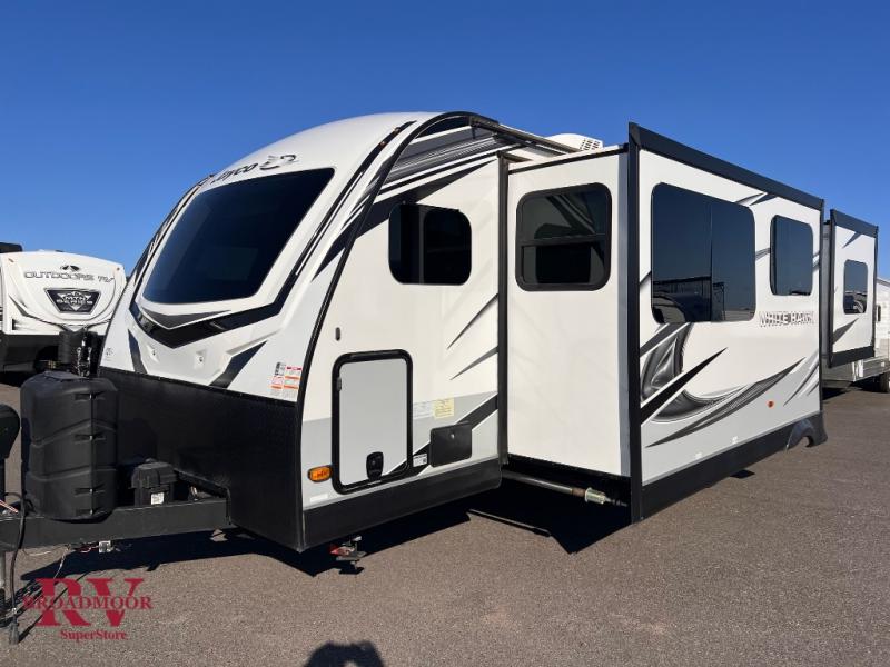 The lightweight White Hawk travel trailers by Jayco will blow you away with their roomy interiors, luxurious amenities, and durable construction. The Magnum Truss Roof System can withstand 50% more weight than the competition, and the Stronghold VBL lamination is the lightest, yet strongest in the industry. Each model includes the JAYCOMMAND "Smart RV" system with a tire pressure monitor system, plus American-made Goodyear tires for maximum durability and carrying capacity. You will love the sleek look of the front molded fiberglass cap with an automotive windshield and blue LED accent lighting, along with the frameless windows and automotive-style aluminum rims. The White Hawk travel trailers also include an arched interior ceiling, a kitchen skylight with a shade, residential vinyl flooring with cold crack resistance, and an electric fireplace.