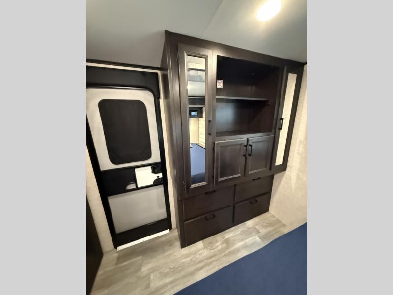 You will experience a smooth flow of traffic in and out of this travel trailer with dual entry doors! The rear private bedroom has one of the entrance/exit doors so you can sneak out for an early morning fishing trip, a queen bed slide for more space, and a wardrobe for your clothes. The full bathroom has a radius shower to clean up in and handy storage areas like a linen closet, a medicine cabinet, and a shelf. Grab a snack from one of the two pantries and head to the theater seating with swivel tables across from the entertainment center for a relaxing movie night. The chef will love cooking in the front kitchen with all of the countertop space and three burner cooktop. It comes standard with a booth dinette, but you can switch it out for the optional table and two chairs with ottoman or the optional table and four chairs.