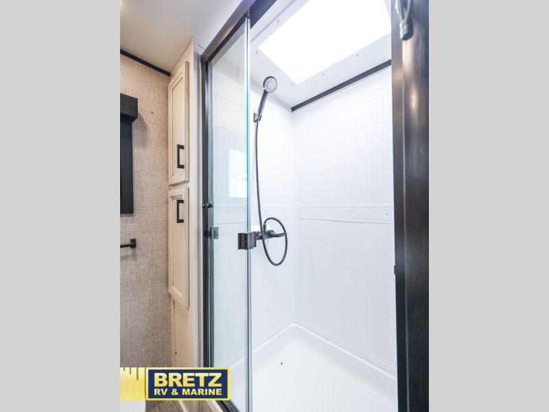 Your family will love camping every other weekend in this spacious travel trailer. The full rear bath is tucked away in the back for privacy, and there are dual entry doors for convenience. When you're not outside cooking on the outdoor kitchen, gather around the U-shaped dinette for game night. You'll find the LED TV and fireplace will make this area feel more like home, and there are two pantries to store snacks and dry goods. When it comes time to call it a night, head to the front private bedroom for a great night's rest on the queen bed, and you'll find two wardrobes plus a closet to keep your clothes tidy.