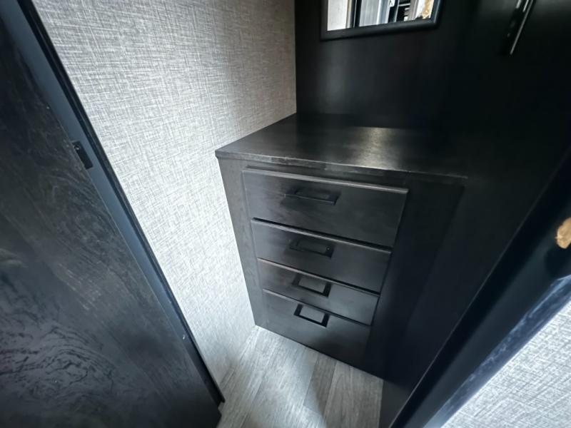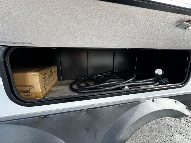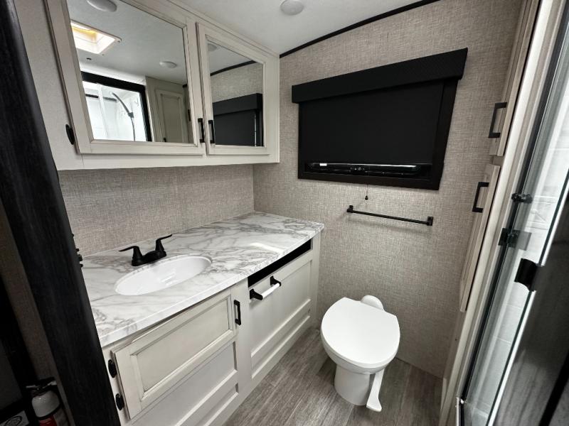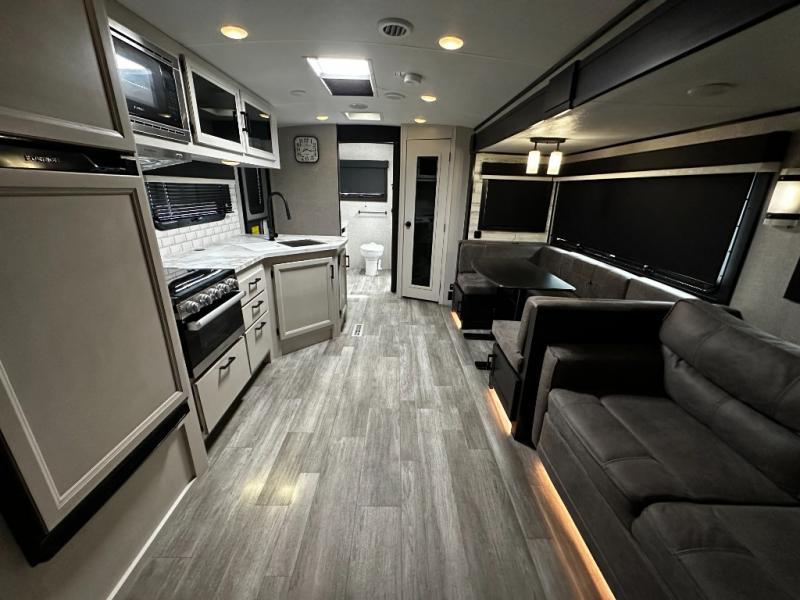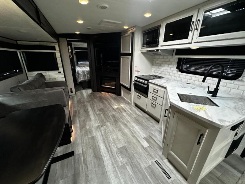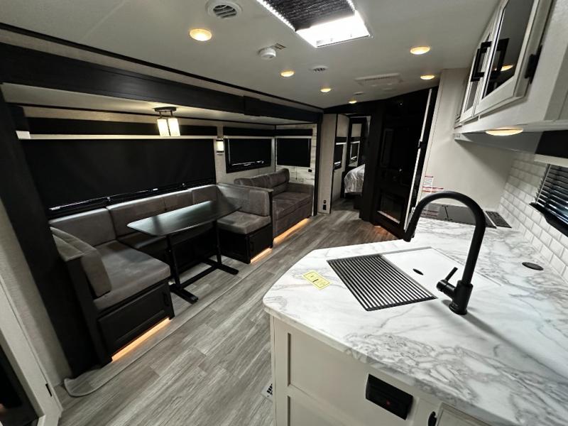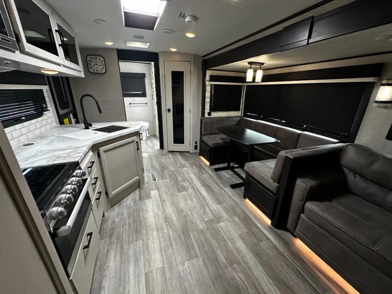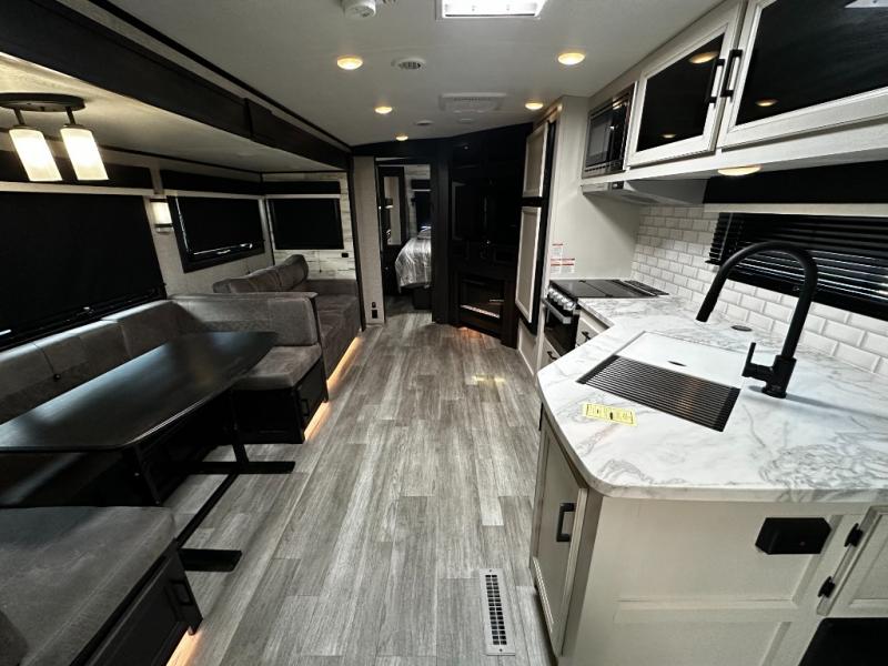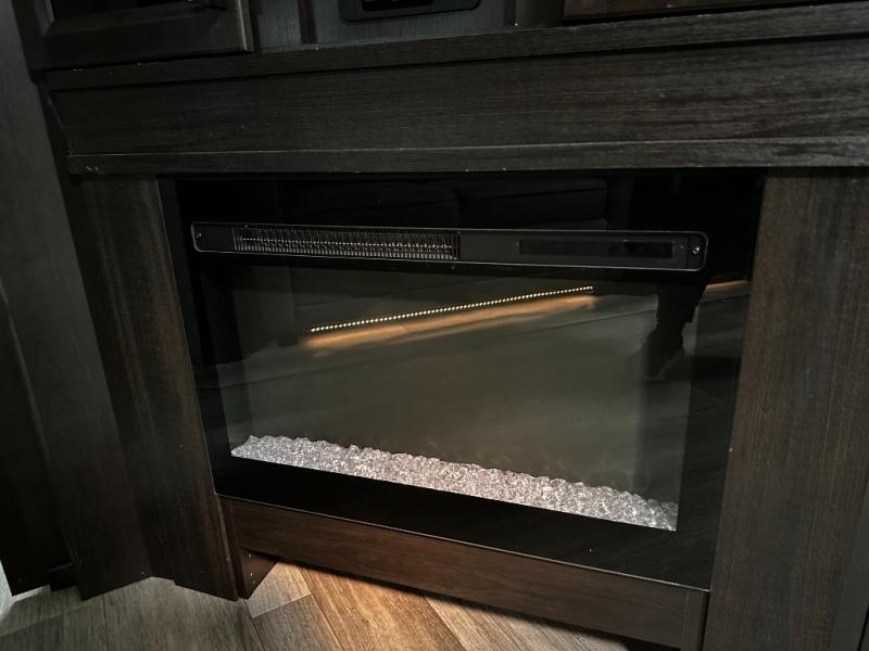 Your family will love camping every other weekend in this spacious travel trailer. The full rear bath is tucked away in the back for privacy, and there are dual entry doors for convenience. When you're not outside cooking on the outdoor kitchen, gather around the U-shaped dinette for game night. You'll find the LED TV and fireplace will make this area feel more like home, and there are two pantries to store snacks and dry goods. When it comes time to call it a night, head to the front private bedroom for a great night's rest on the queen bed, and you'll find two wardrobes plus a closet to keep your clothes tidy.