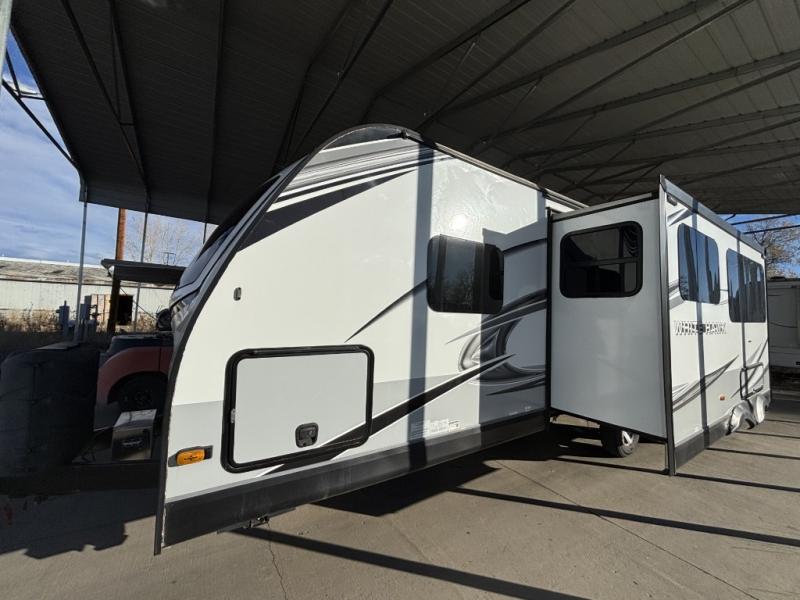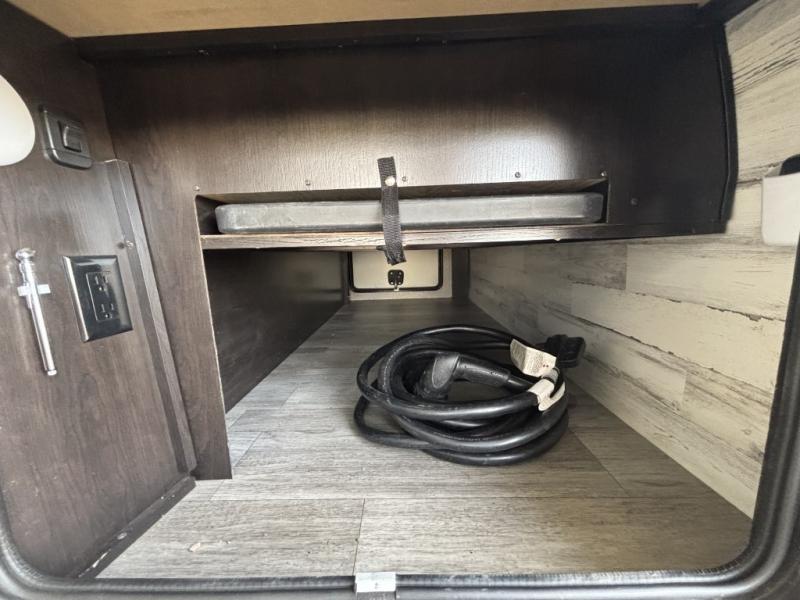 Your family will love camping every other weekend in this spacious travel trailer. The full rear bath is tucked away in the back for privacy, and there are dual entry doors for convenience. When you're not outside cooking on the outdoor kitchen, gather around the U-shaped dinette for game night. You'll find the LED TV and fireplace will make this area feel more like home, and there are two pantries to store snacks and dry goods. When it comes time to call it a night, head to the front private bedroom for a great night's rest on the queen bed, and you'll find two wardrobes plus a closet to keep your clothes tidy.