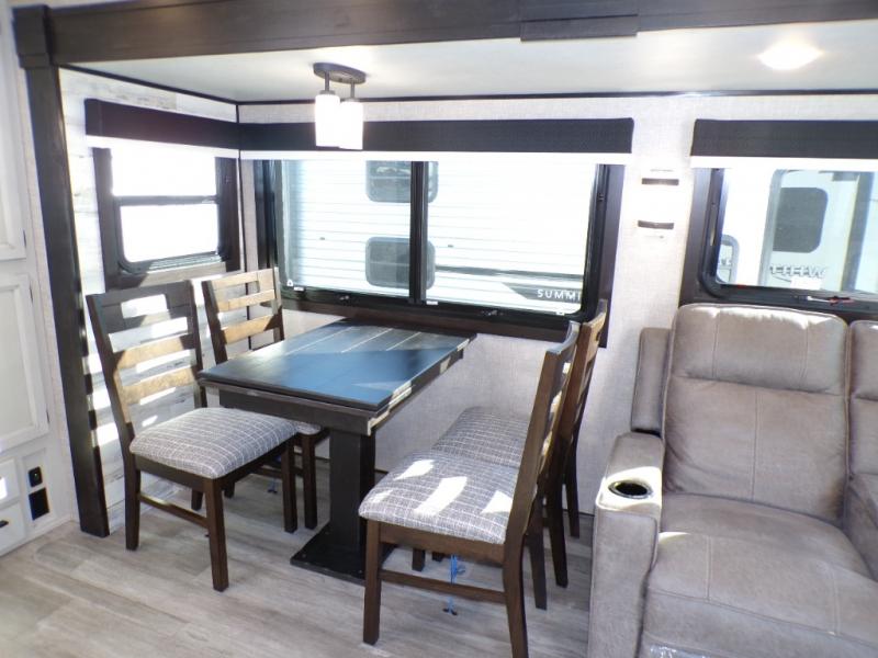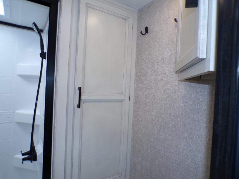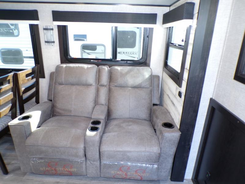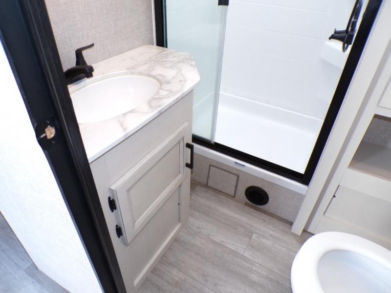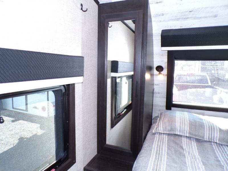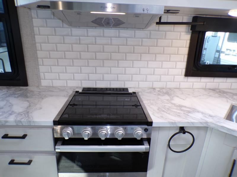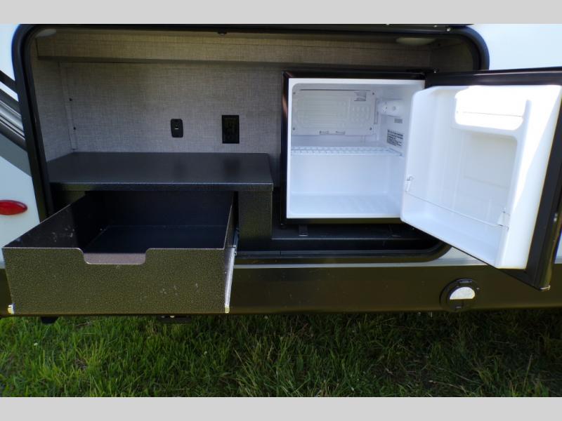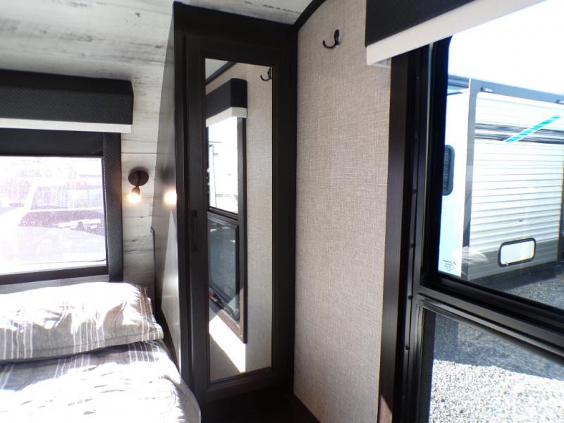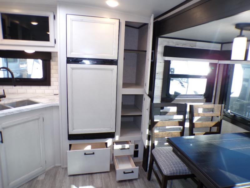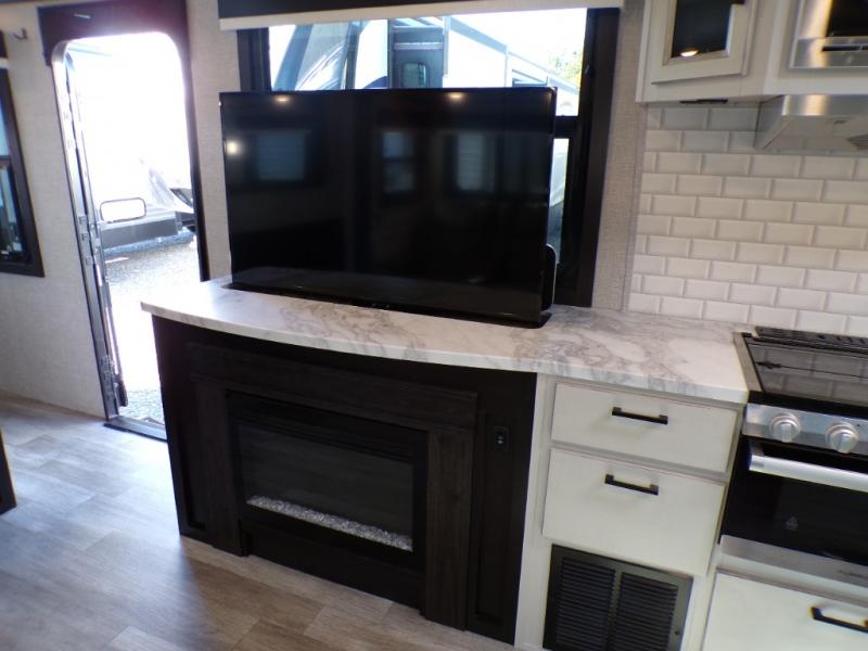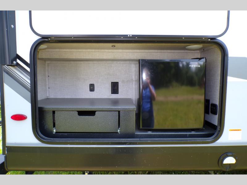 Step inside this rear kitchen travel trailer for fun family vacations. The large slide will provide the chef space to cook, while the kids watch a movie on the TV on lift. If the weather is just right, you will probably want to cook on the outside kitchen while the kids ride their bikes around the campsite. This model includes a tri-fold sofa and a booth dinette that will be perfect for meal times, relaxing, and sleeping space at night. You and your spouse can take the front private bedroom with a queen bed and dual wardrobes for your things, and the full bath is centrally located for easy access!