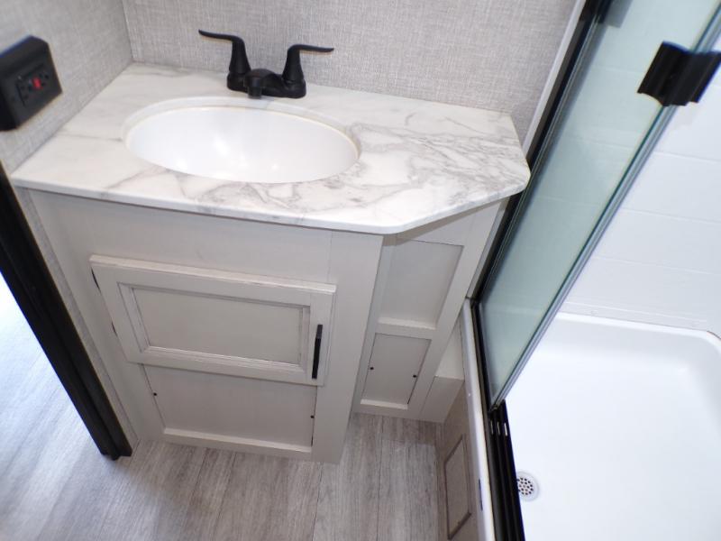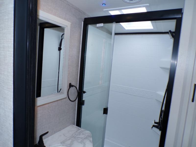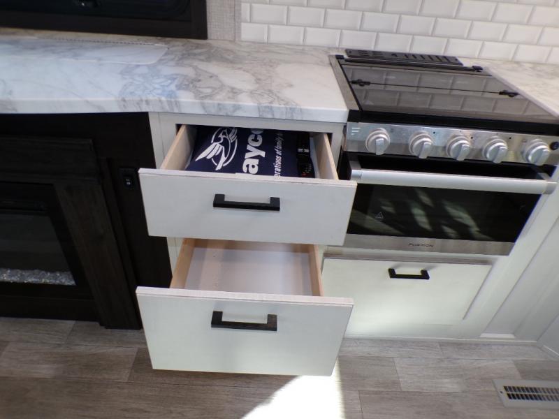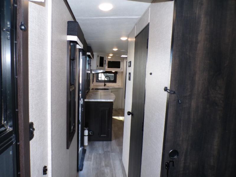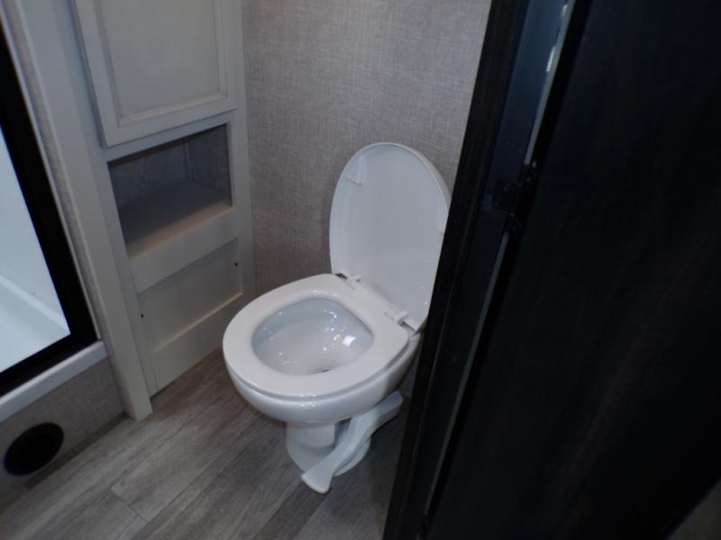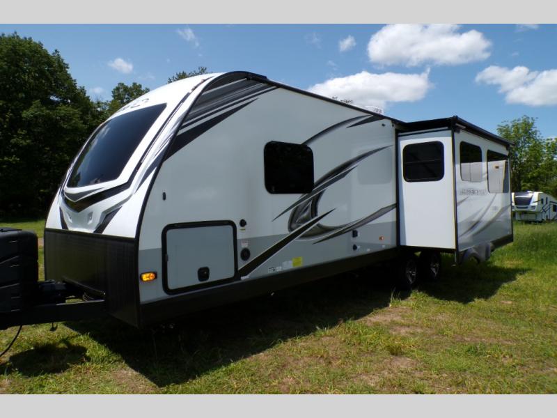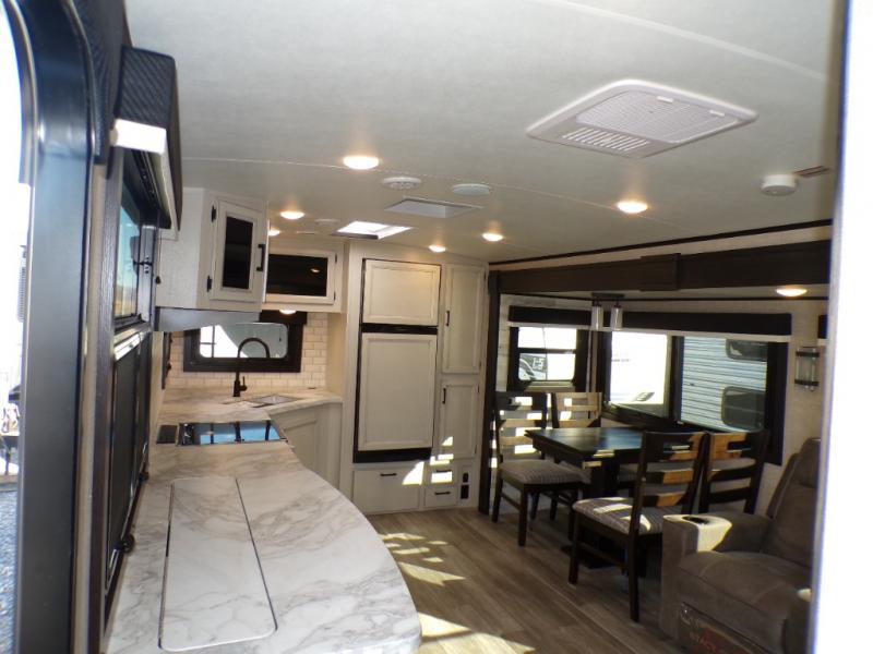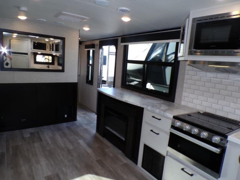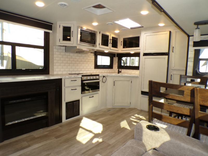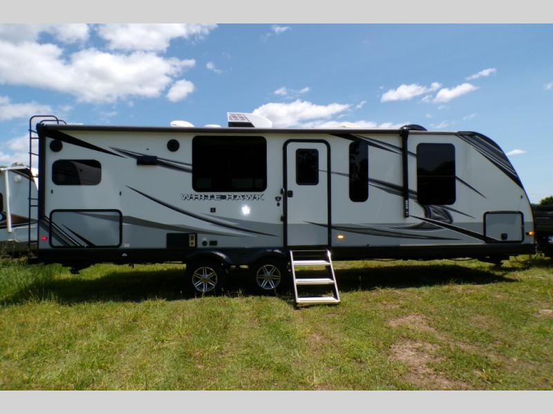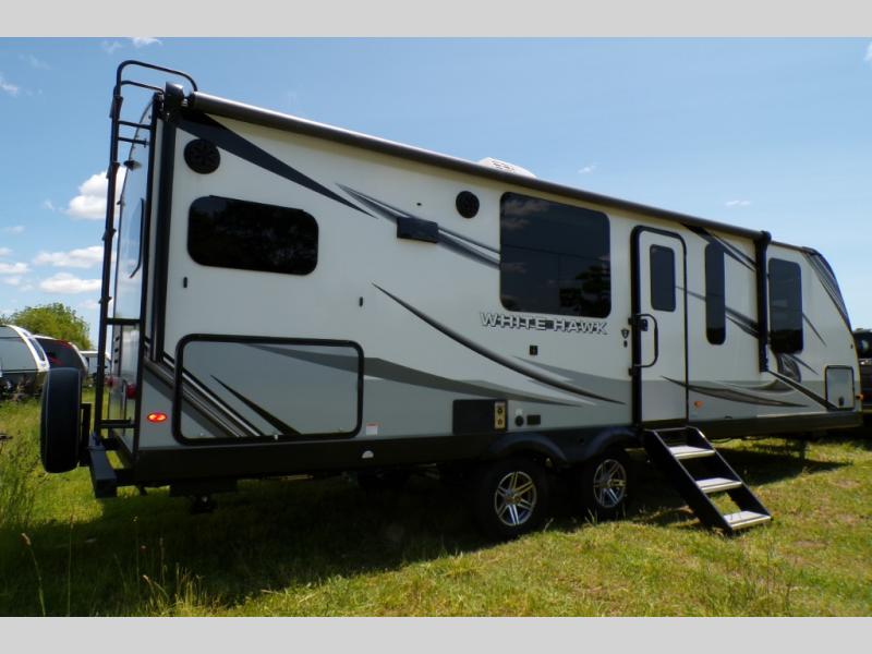 The lightweight White Hawk travel trailers by Jayco will blow you away with their roomy interiors, luxurious amenities, and durable construction. The Magnum Truss Roof System can withstand 50% more weight than the competition, and the Stronghold VBL lamination is the lightest, yet strongest in the industry. Each model includes the JAYCOMMAND "Smart RV" system with a tire pressure monitor system, plus American-made Goodyear tires for maximum durability and carrying capacity. You will love the sleek look of the front molded fiberglass cap with an automotive windshield and blue LED accent lighting, along with the frameless windows and automotive-style aluminum rims. The White Hawk travel trailers also include an arched interior ceiling, a kitchen skylight with a shade, residential vinyl flooring with cold crack resistance, and an electric fireplace.