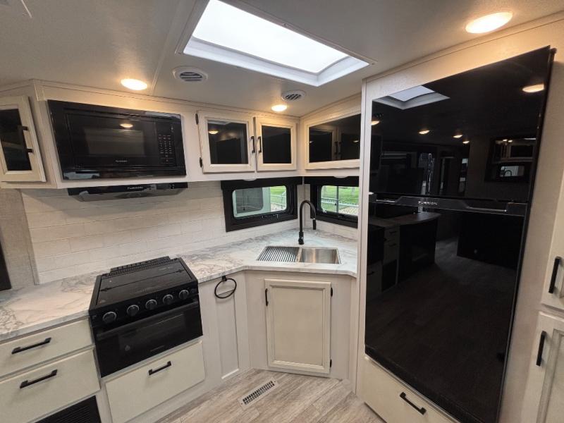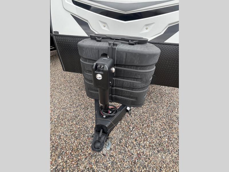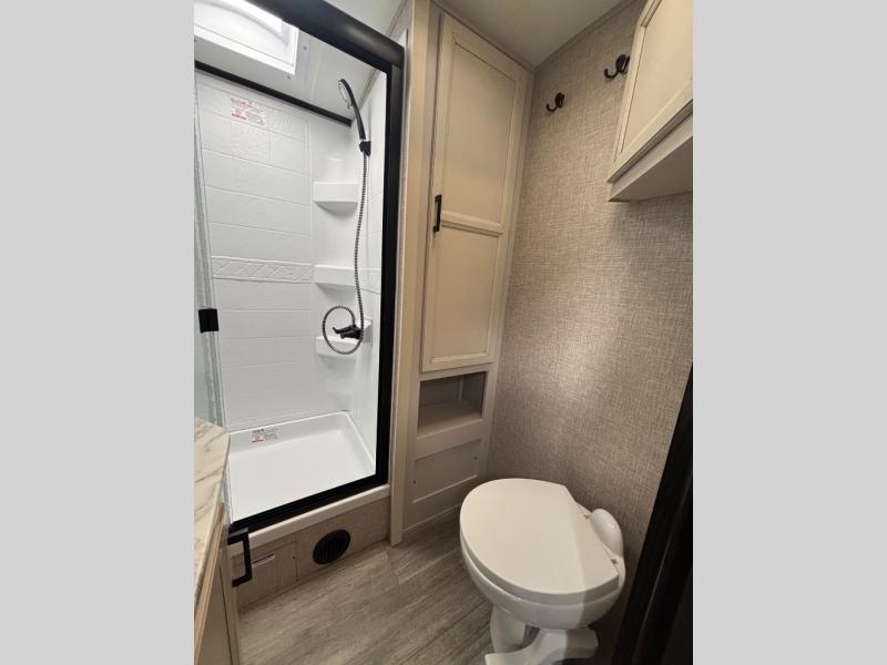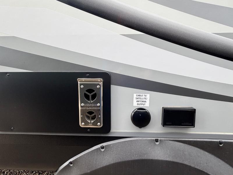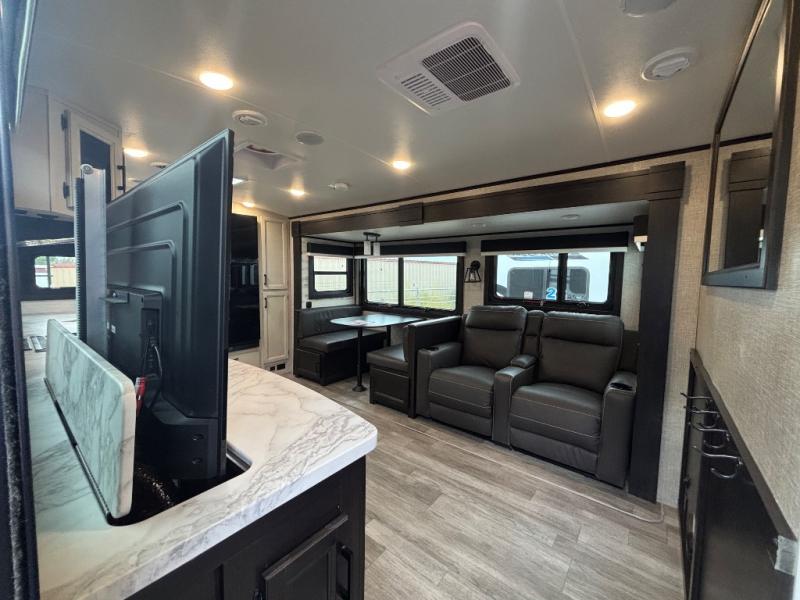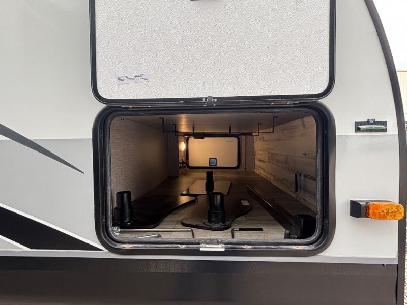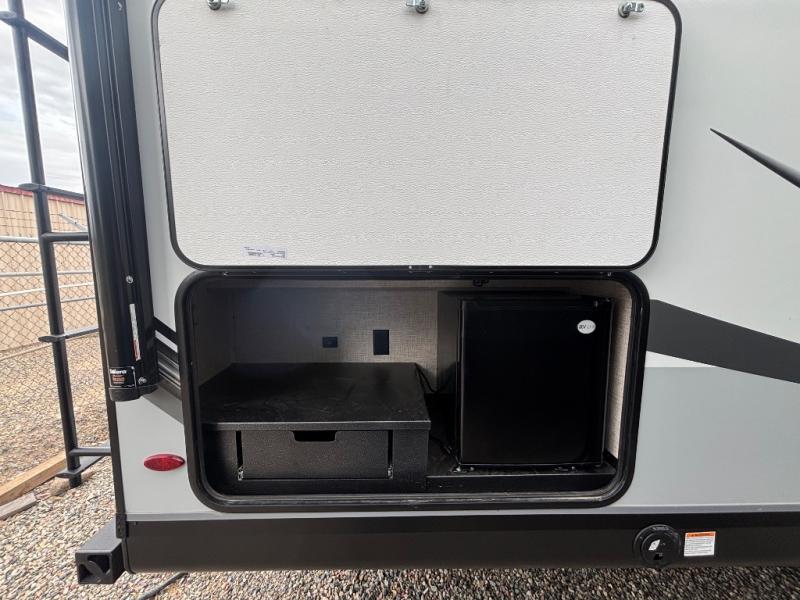 Step inside this rear kitchen travel trailer for fun family vacations. The large slide will provide the chef space to cook, while the kids watch a movie on the TV on lift. If the weather is just right, you will probably want to cook on the outside kitchen while the kids ride their bikes around the campsite. This model includes a tri-fold sofa and a booth dinette that will be perfect for meal times, relaxing, and sleeping space at night. You and your spouse can take the front private bedroom with a queen bed and dual wardrobes for your things, and the full bath is centrally located for easy access!