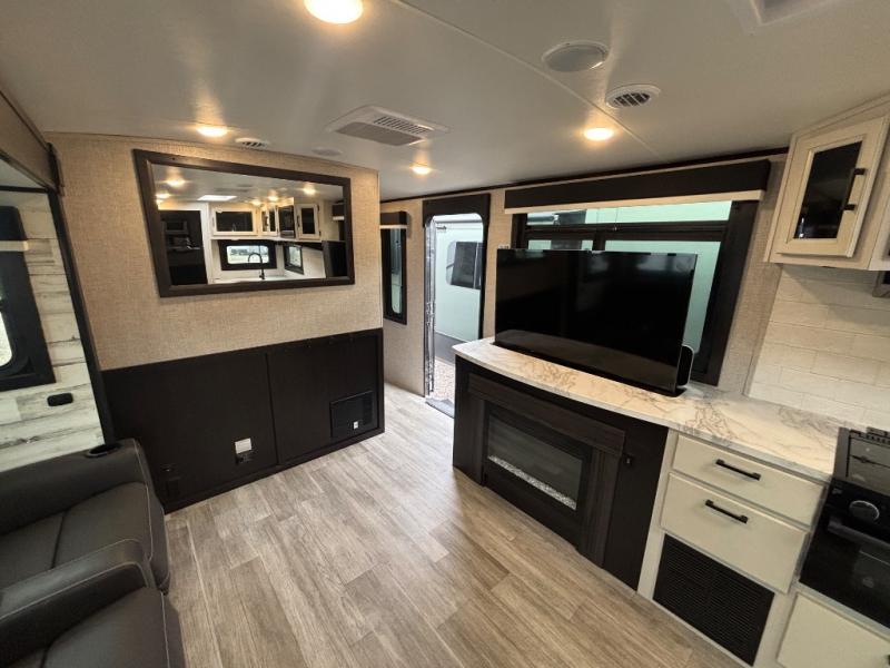 The lightweight White Hawk travel trailers by Jayco will blow you away with their roomy interiors, luxurious amenities, and durable construction. The Magnum Truss Roof System can withstand 50% more weight than the competition, and the Stronghold VBL lamination is the lightest, yet strongest in the industry. Each model includes the JAYCOMMAND "Smart RV" system with a tire pressure monitor system, plus American-made Goodyear tires for maximum durability and carrying capacity. You will love the sleek look of the front molded fiberglass cap with an automotive windshield and blue LED accent lighting, along with the frameless windows and automotive-style aluminum rims. The White Hawk travel trailers also include an arched interior ceiling, a kitchen skylight with a shade, residential vinyl flooring with cold crack resistance, and an electric fireplace.