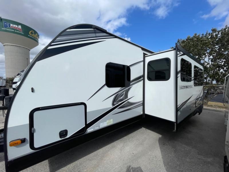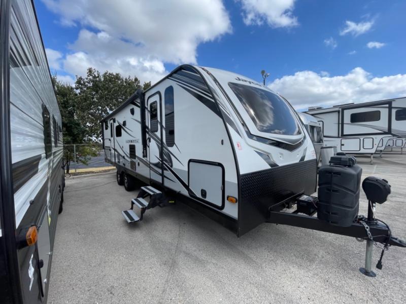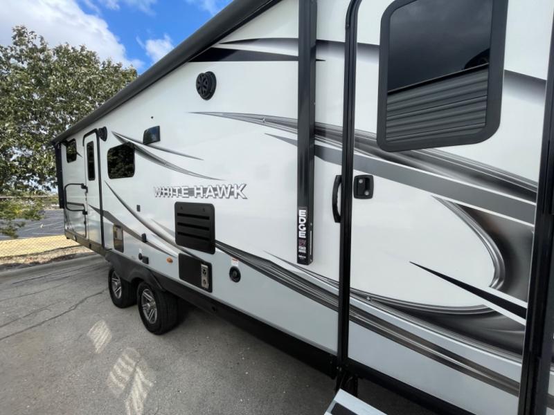 The lightweight White Hawk travel trailers by Jayco will blow you away with their roomy interiors, luxurious amenities, and durable construction. The Magnum Truss Roof System can withstand 50% more weight than the competition, and the Stronghold VBL lamination is the lightest, yet strongest in the industry. Each model includes the JAYCOMMAND "Smart RV" system with a tire pressure monitor system, plus American-made Goodyear tires for maximum durability and carrying capacity. You will love the sleek look of the front molded fiberglass cap with an automotive windshield and blue LED accent lighting, along with the frameless windows and automotive-style aluminum rims. The White Hawk travel trailers also include an arched interior ceiling, a kitchen skylight with a shade, residential vinyl flooring with cold crack resistance, and an electric fireplace.