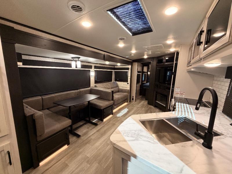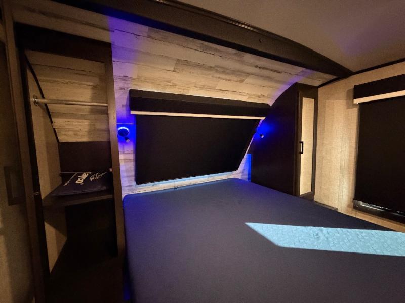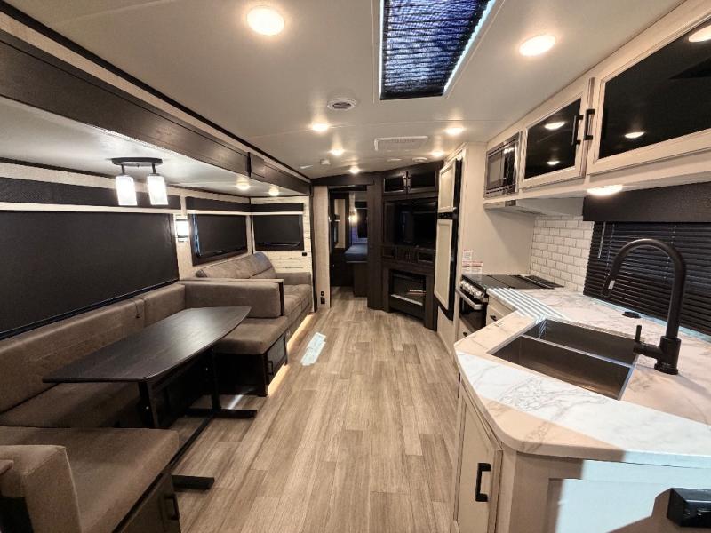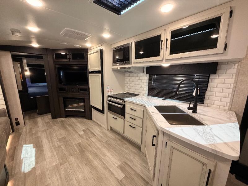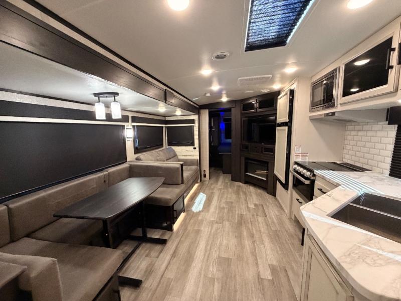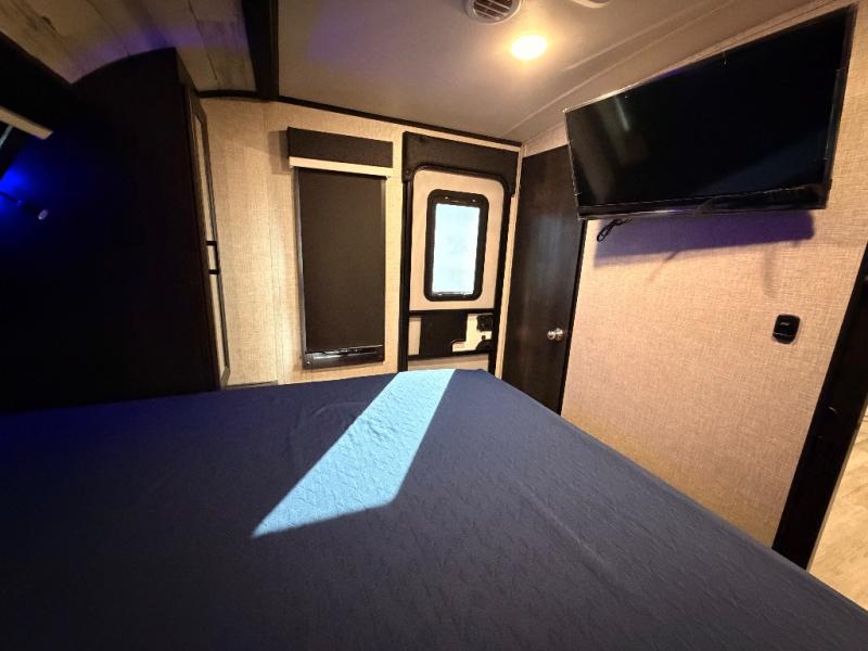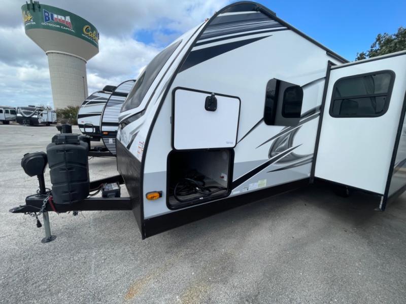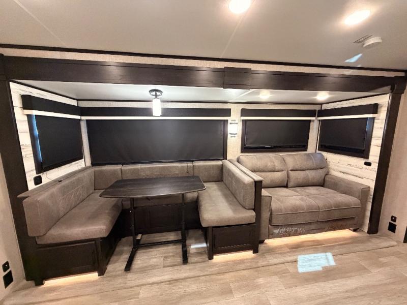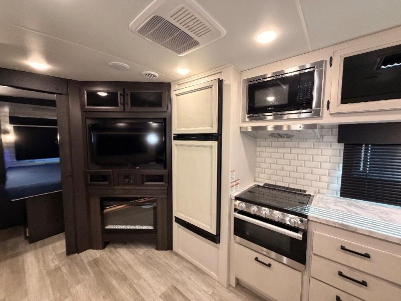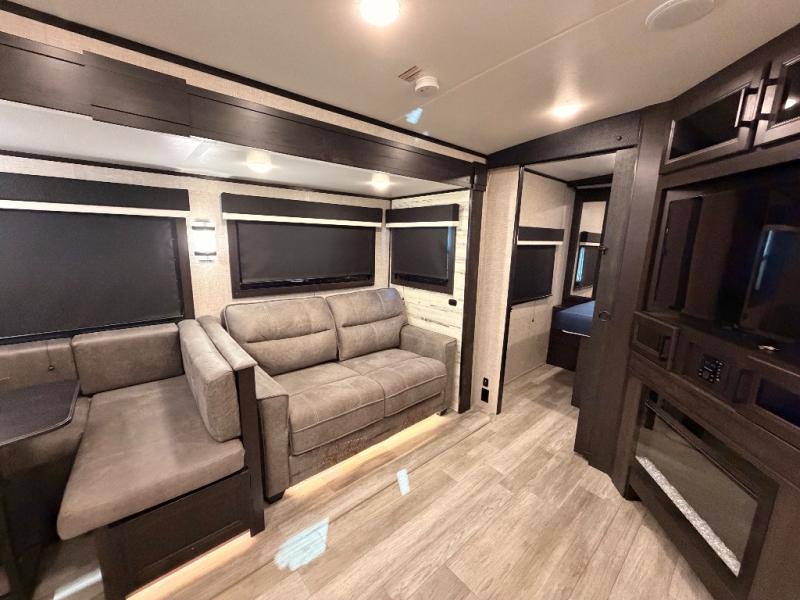 Bring the whole family along in this spacious travel trailer. You will love visiting outside while the chef of your group prepares breakfast on the outdoor kitchen, plus there is a 21' power awning to shade you from the sun. If the weather isn't cooperating, head inside and dine around the U-shaped dinette. There is also a tri-fold sofa here, a fireplace, and an LED TV for movies. This model conveniently has dual entry doors so you can enter in through the main living area, or into the front private bedroom. The bedroom also features a queen bed, dual wardrobes, and a closet to keep your items organized. Start camping today!