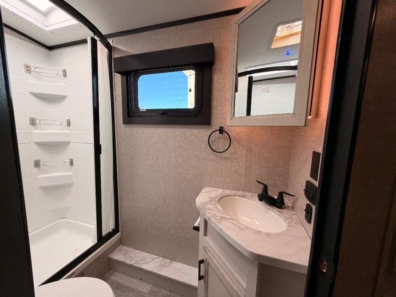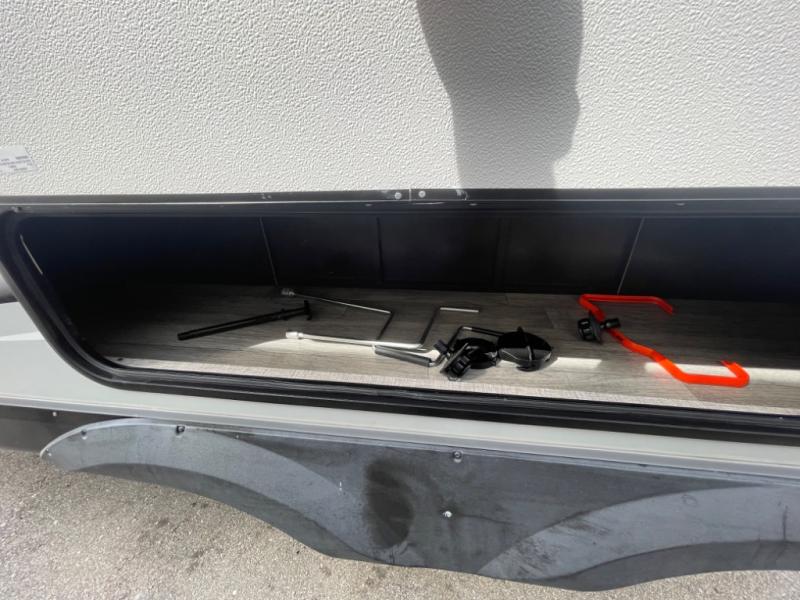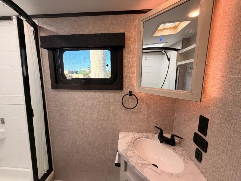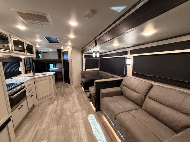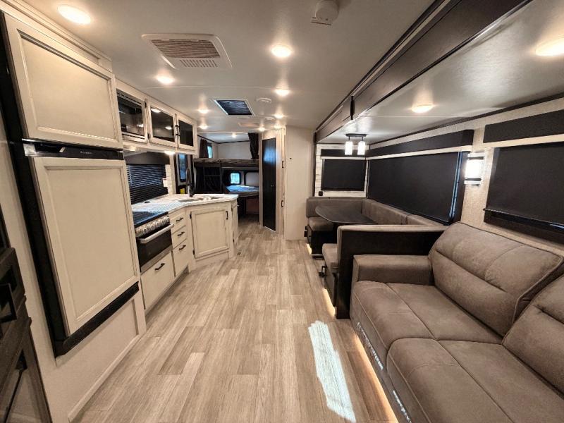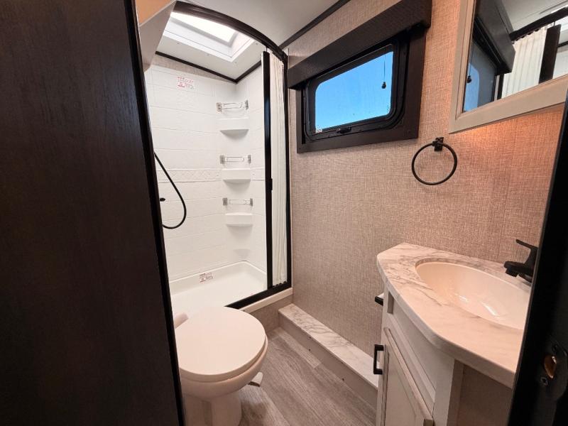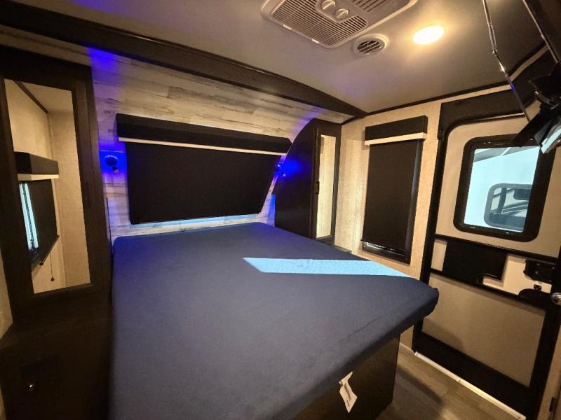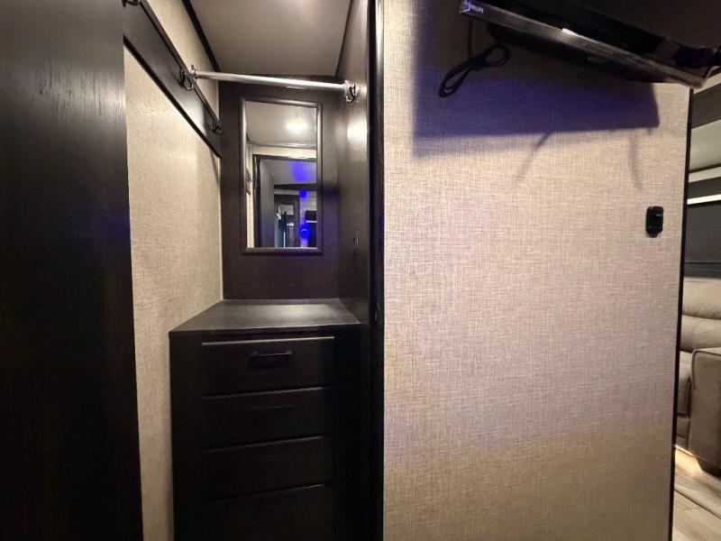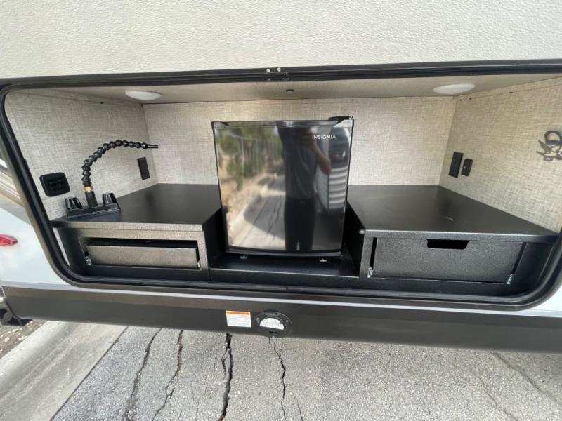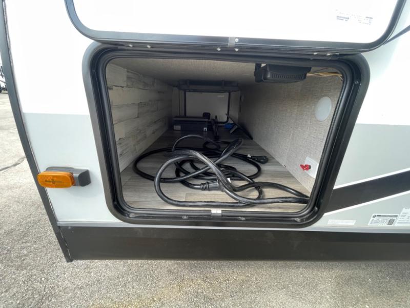 Bring the whole family along in this spacious travel trailer. You will love visiting outside while the chef of your group prepares breakfast on the outdoor kitchen, plus there is a 21' power awning to shade you from the sun. If the weather isn't cooperating, head inside and dine around the U-shaped dinette. There is also a tri-fold sofa here, a fireplace, and an LED TV for movies. This model conveniently has dual entry doors so you can enter in through the main living area, or into the front private bedroom. The bedroom also features a queen bed, dual wardrobes, and a closet to keep your items organized. Start camping today!
