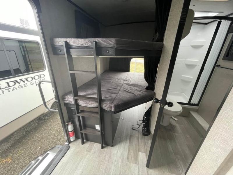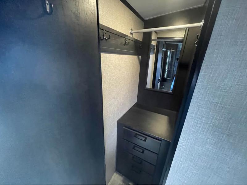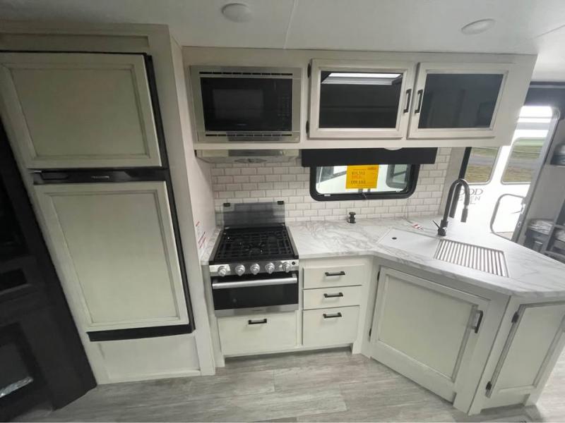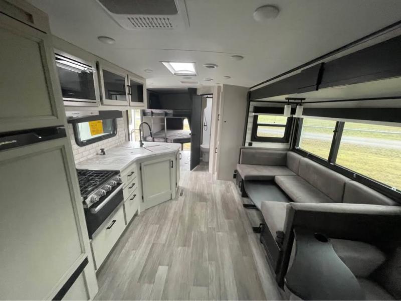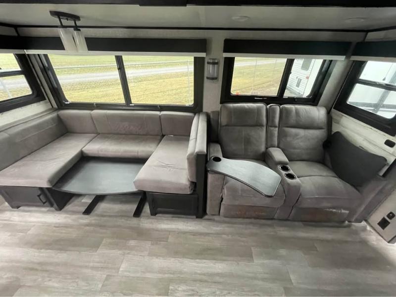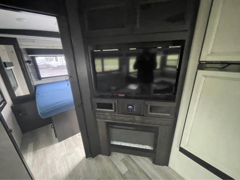 Bring the whole family along in this spacious travel trailer. You will love visiting outside while the chef of your group prepares breakfast on the outdoor kitchen, plus there is a 21' power awning to shade you from the sun. If the weather isn't cooperating, head inside and dine around the U-shaped dinette. There is also a tri-fold sofa here, a fireplace, and an LED TV for movies. This model conveniently has dual entry doors so you can enter in through the main living area, or into the front private bedroom. The bedroom also features a queen bed, dual wardrobes, and a closet to keep your items organized. Start camping today!