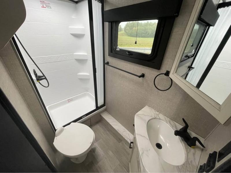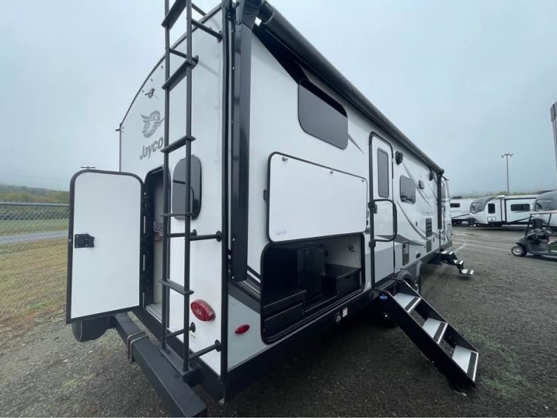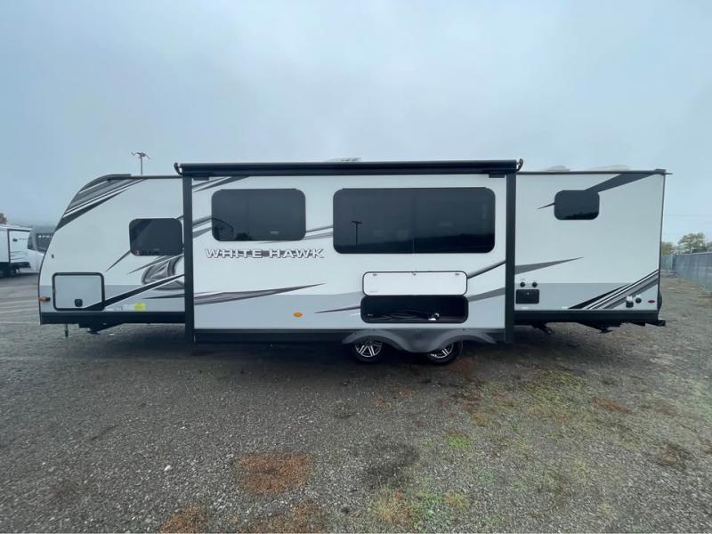 The lightweight White Hawk travel trailers by Jayco will blow you away with their roomy interiors, luxurious amenities, and durable construction. The Magnum Truss Roof System can withstand 50% more weight than the competition, and the Stronghold VBL lamination is the lightest, yet strongest in the industry. Each model includes the JAYCOMMAND "Smart RV" system with a tire pressure monitor system, plus American-made Goodyear tires for maximum durability and carrying capacity. You will love the sleek look of the front molded fiberglass cap with an automotive windshield and blue LED accent lighting, along with the frameless windows and automotive-style aluminum rims. The White Hawk travel trailers also include an arched interior ceiling, a kitchen skylight with a shade, residential vinyl flooring with cold crack resistance, and an electric fireplace.