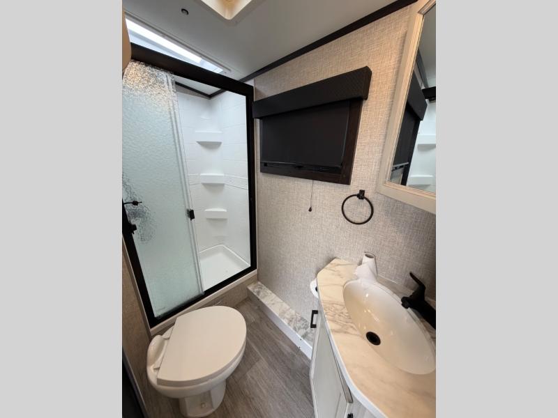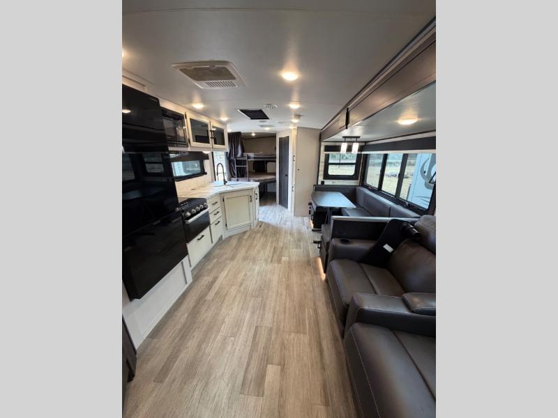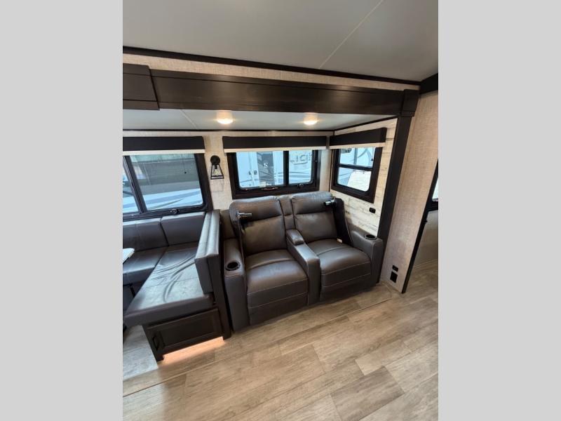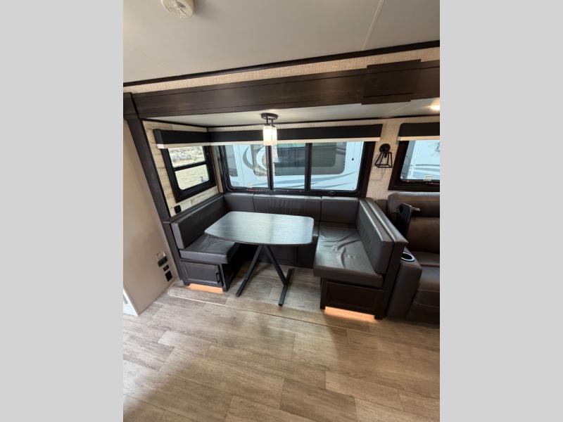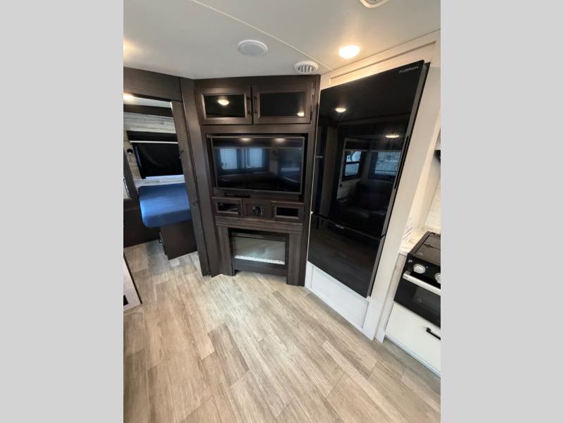 Bring the whole family along in this spacious travel trailer. You will love visiting outside while the chef of your group prepares breakfast on the outdoor kitchen, plus there is a 21' power awning to shade you from the sun. If the weather isn't cooperating, head inside and dine around the U-shaped dinette. There is also a tri-fold sofa here, a fireplace, and an LED TV for movies. This model conveniently has dual entry doors so you can enter in through the main living area, or into the front private bedroom. The bedroom also features a queen bed, dual wardrobes, and a closet to keep your items organized. Start camping today!