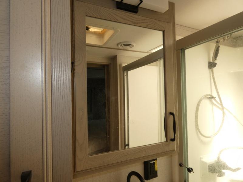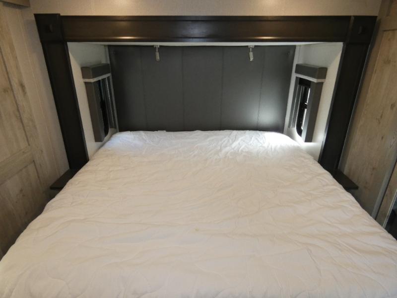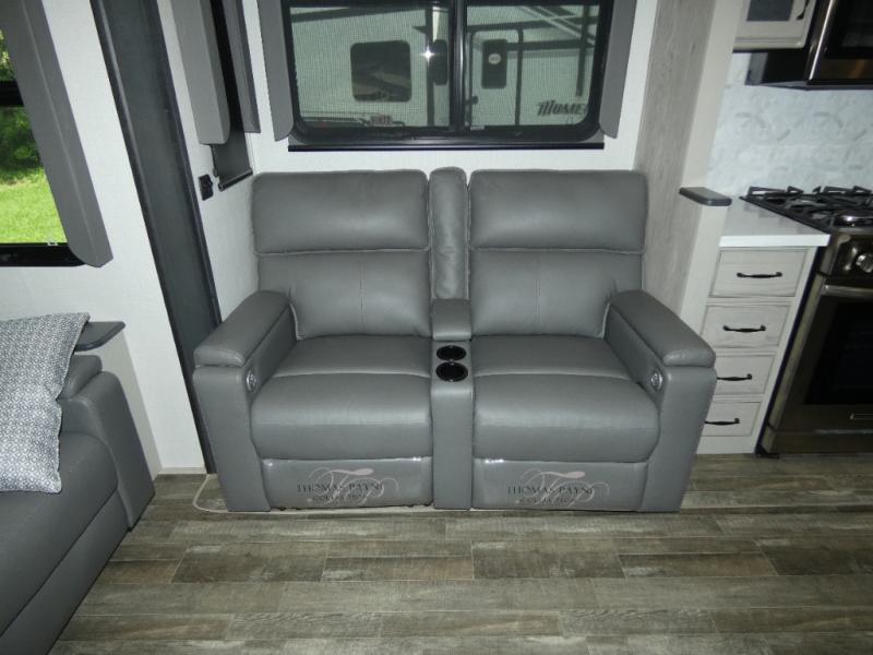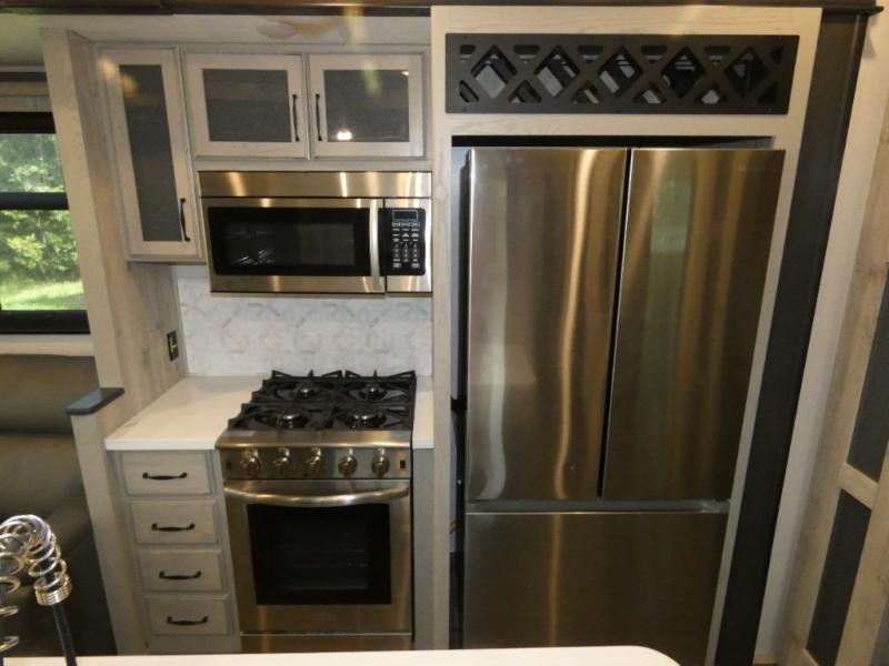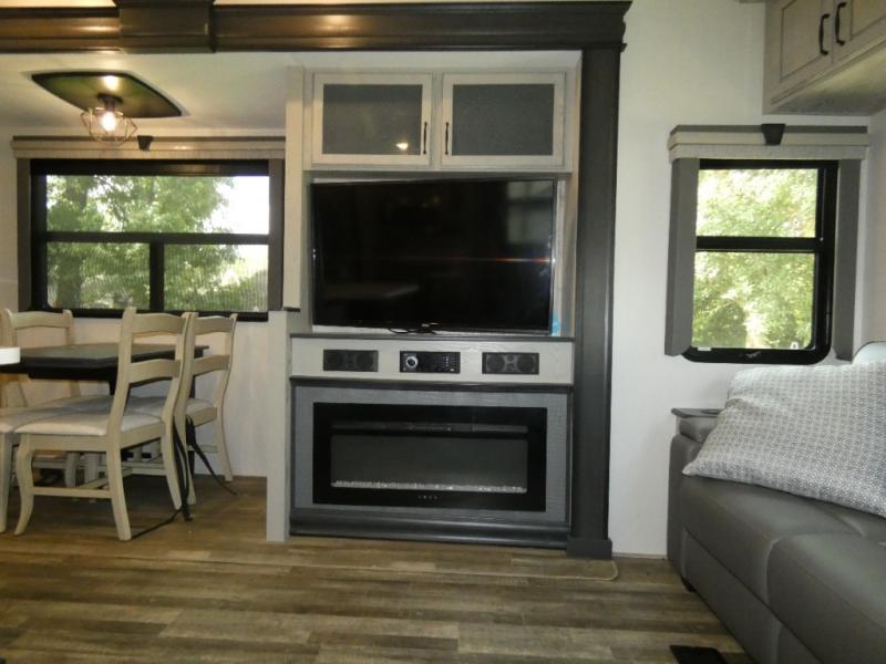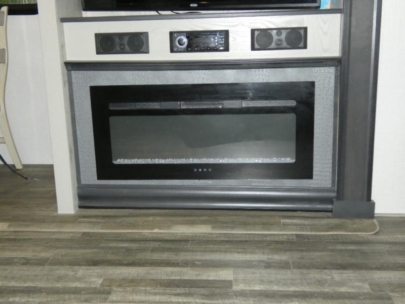 A great coach for an adventurous couple that loves to travel. This Alpine fifth wheel features wide open spaces thanks to triple slides with dual opposing slides in the main combined living and kitchen area. A center island with sink is great for prep work. You can easily entertain and have overnight guests with a hide-a-bed sofa sleeper. There is an entertainment center with fireplace to enjoy when inside, and theater seating opposite for movie night. For the cook, an 18 cu. ft. refrigerator with optional residential refrigerator including an ice maker if you like. There is also a convection microwave oven above the stove, a large walk-in pantry, and a free standing dinette within the curbside slide. Head up to the master suite which features a dual entry bath including a linen cabinet and large shower, plus a king bed that slides out and includes storage space underneath for extra blankets as well as a large master closet with washer and dryer. There is also a chest of drawers for your clothing and a bench seat for putting on your shoes. On the outside, a grill-n-chill outside kitchen plus refrigerator for entertaining and dining beneath one of two awnings that provide extra living space and protection from the elements.