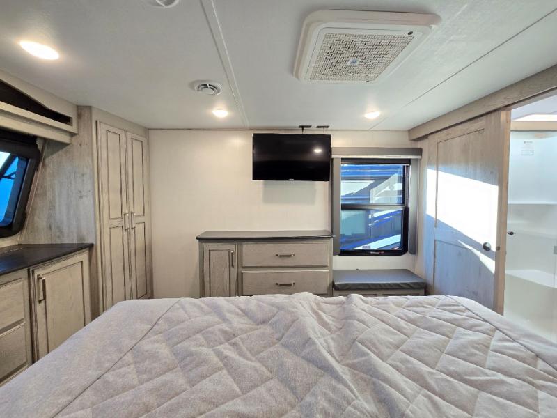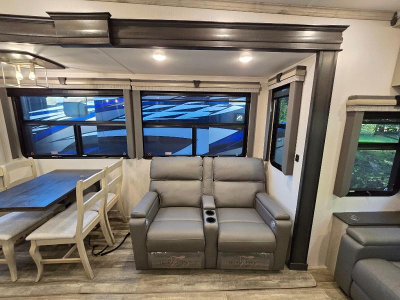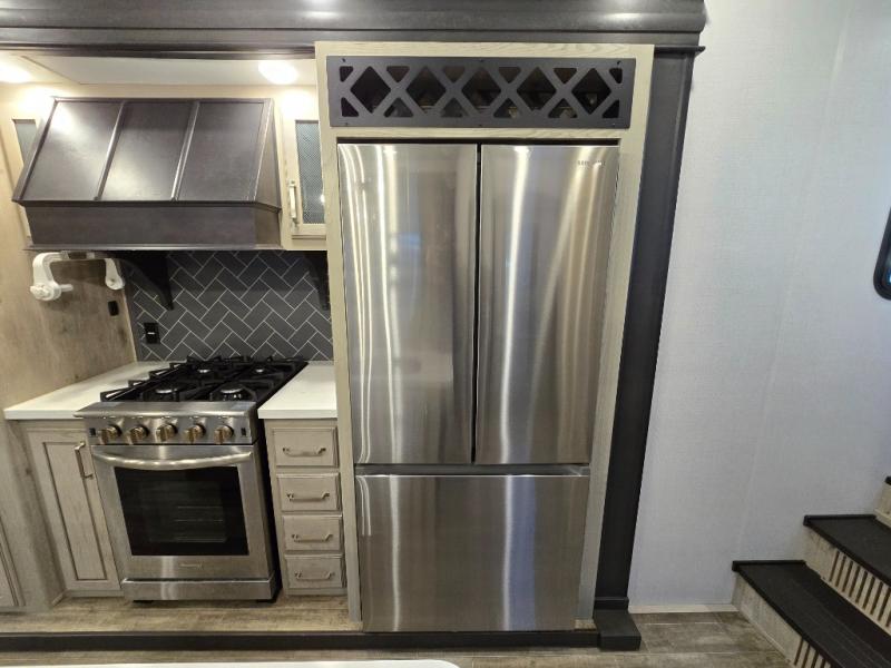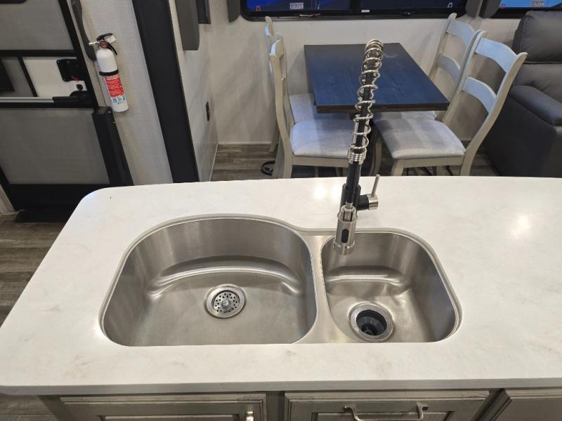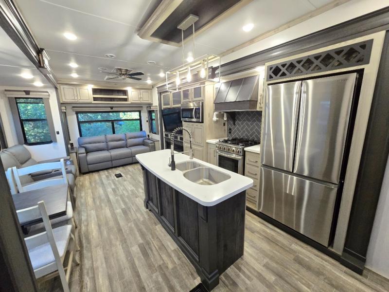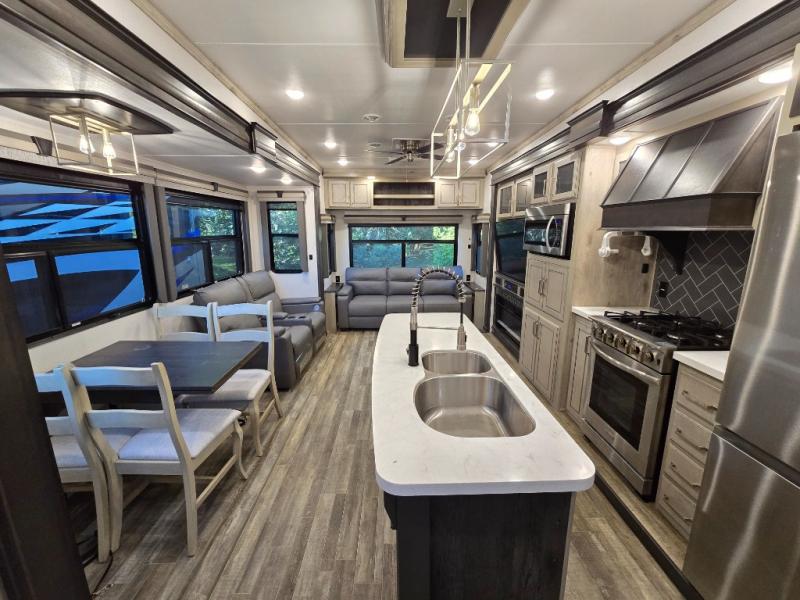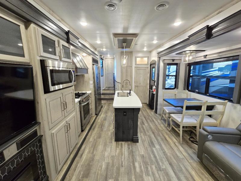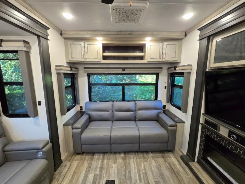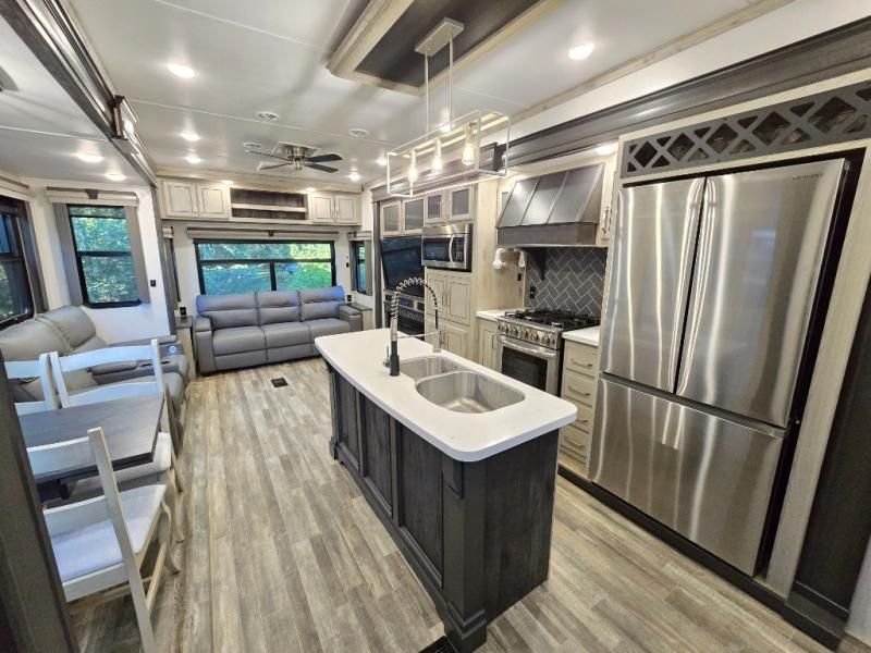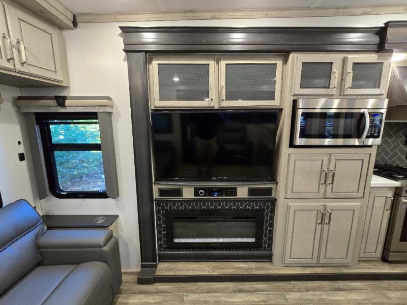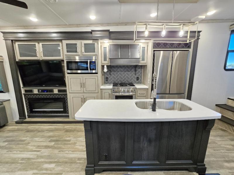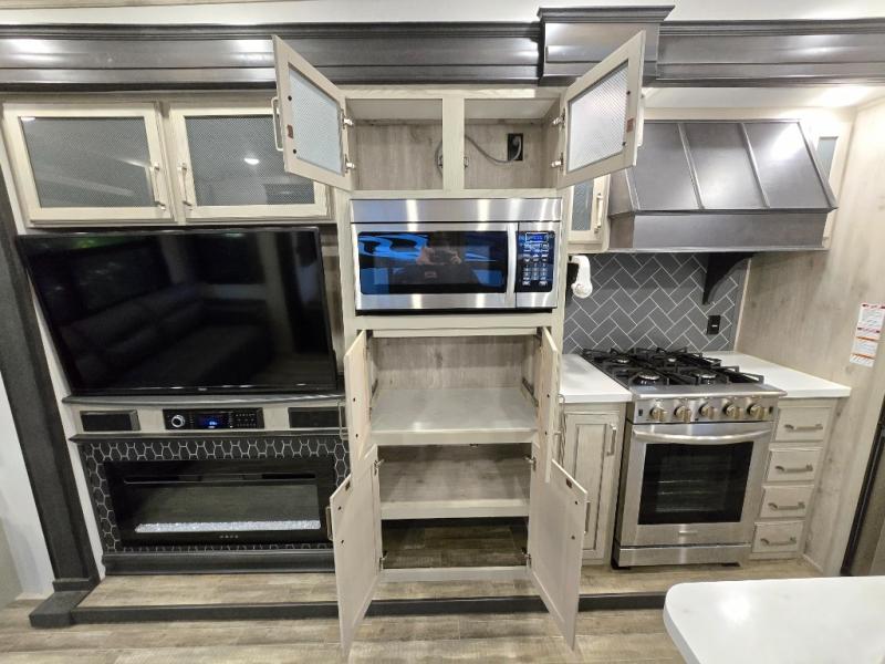 Start camping in true luxury with this fifth wheel! The rear living area has a tri-fold sofa sleeper, Thomas Payne theater seating with heat, massage, LED Lights, and a USB charging station across from an entertainment center with a 40" fireplace and 50" TV for a comfortable place to socialize and relax after a fun day. The kitchen is decked out in features you will appreciate like the appliance garage below the convection microwave, the range hood above the three burner cooktop, the 18 cu. ft. gas/electric refrigerator, an island with two sinks for easy clean up, and the pantry next to an area prepped to add an optional stackable washer and dryer. The front private bedroom has a king bed slide with storage underneath across from a bench and chest with TV, a front chest with wardrobes on either side, and an entrance into the dual entry bathroom which will come in handy at night!