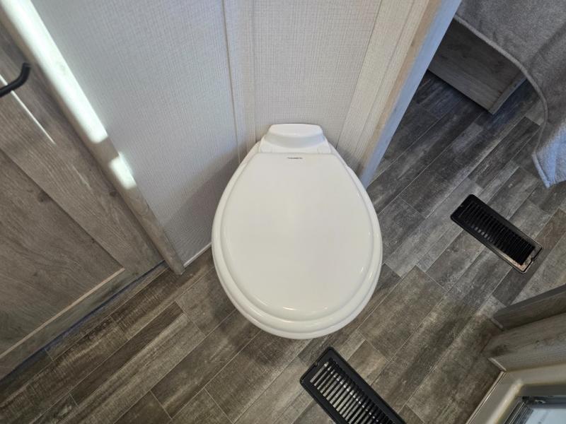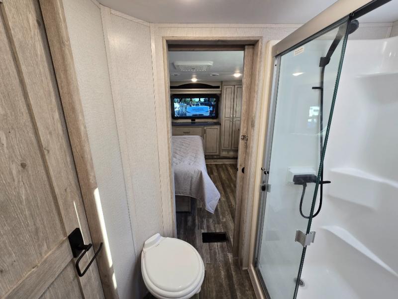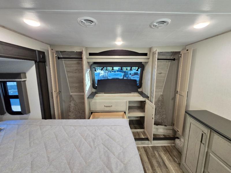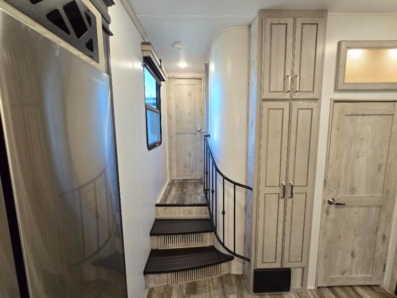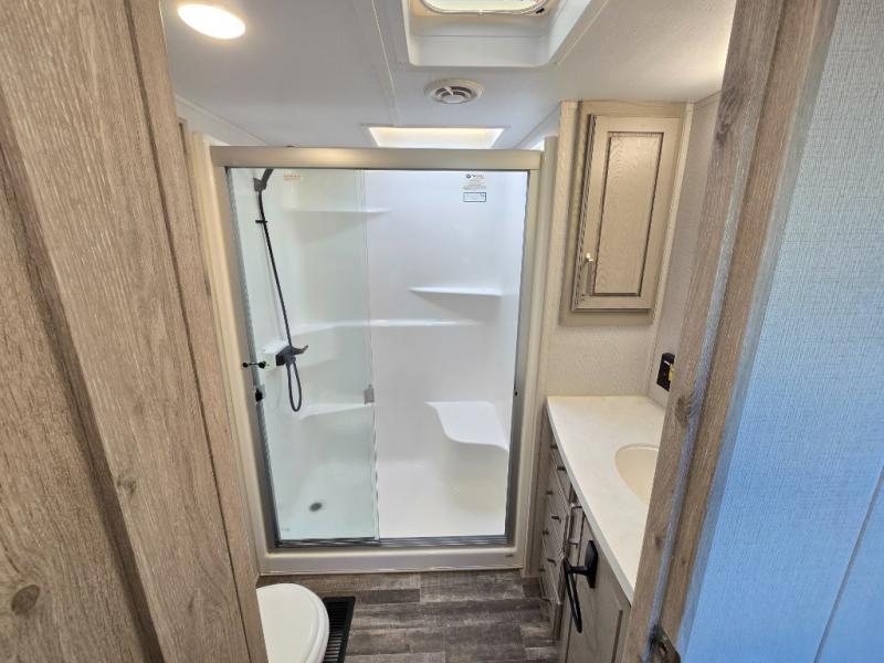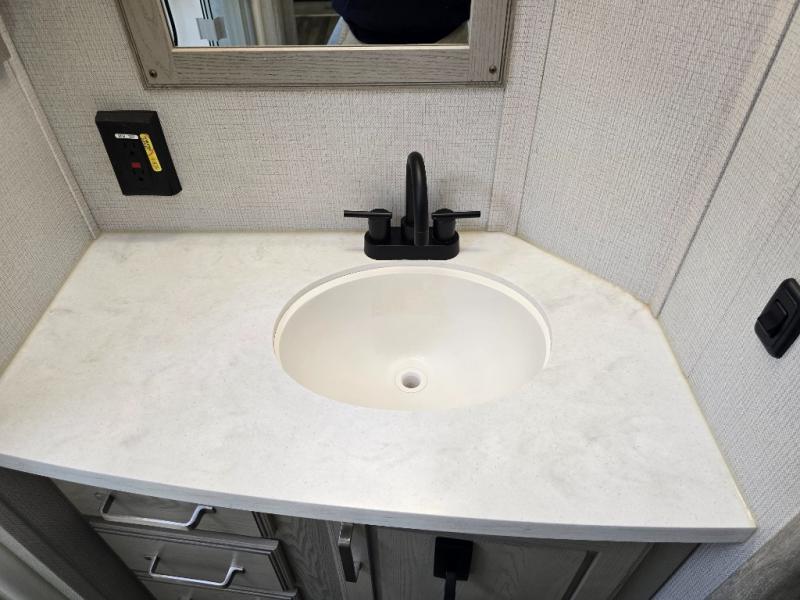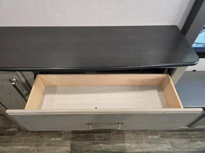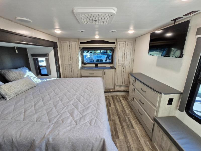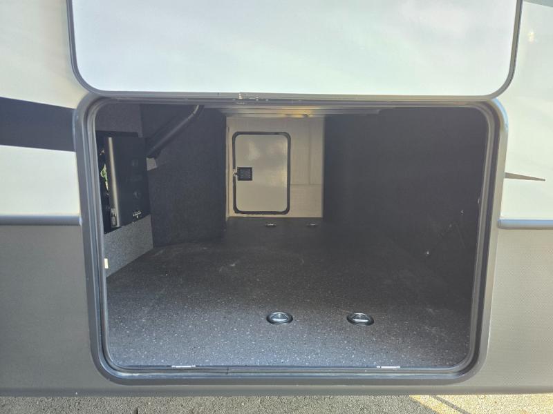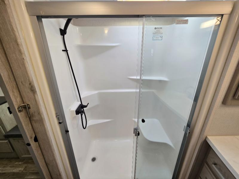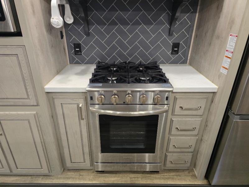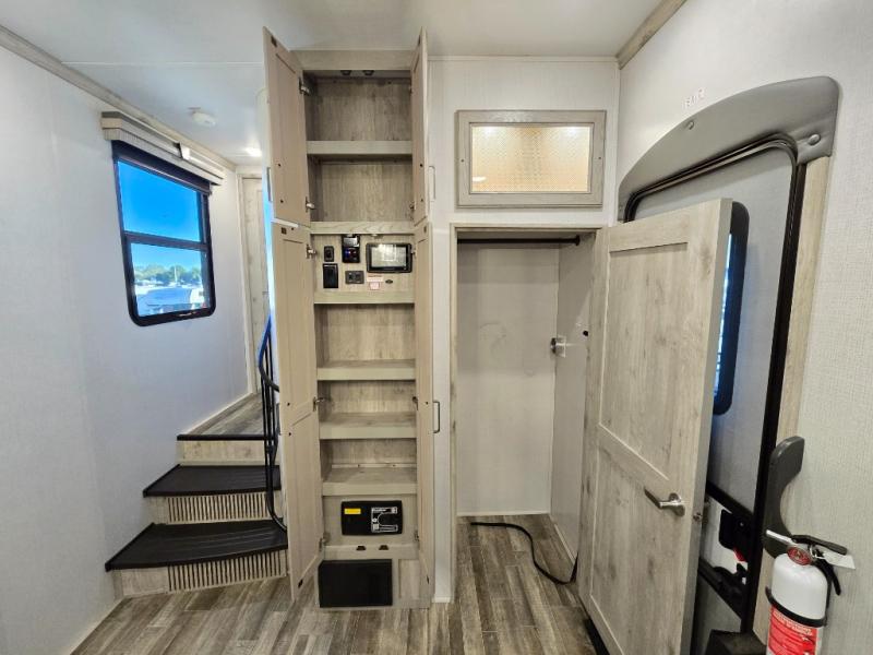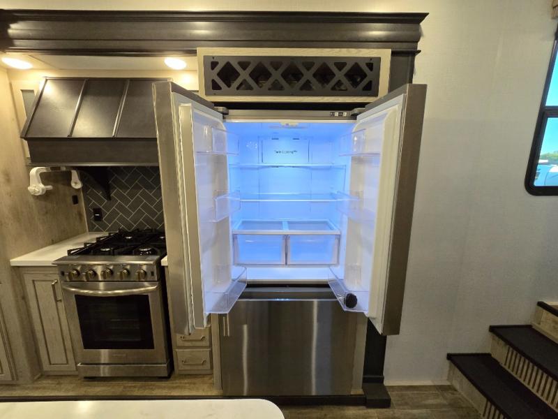 Start camping in true luxury with this fifth wheel! The rear living area has a tri-fold sofa sleeper, Thomas Payne theater seating with heat, massage, LED Lights, and a USB charging station across from an entertainment center with a 40" fireplace and 50" TV for a comfortable place to socialize and relax after a fun day. The kitchen is decked out in features you will appreciate like the appliance garage below the convection microwave, the range hood above the three burner cooktop, the 18 cu. ft. gas/electric refrigerator, an island with two sinks for easy clean up, and the pantry next to an area prepped to add an optional stackable washer and dryer. The front private bedroom has a king bed slide with storage underneath across from a bench and chest with TV, a front chest with wardrobes on either side, and an entrance into the dual entry bathroom which will come in handy at night!