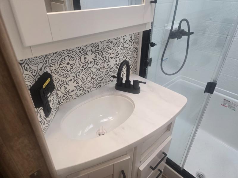 This fifth wheel is both spacious and easy to tow; so come take a look! When you arrive at the campground you can set up the 20' electric awning, then stretch your legs on a trail or two. The full bath will be waiting for you when you return, and you'll enjoy a large shower here with a glass door and a skylight for added light. Head to the full kitchen to prepare dinner on the three burner cooktop, or use the microwave oven here. There is also a high-rise chef's faucet and sprayer here and a 10 cu. ft. 12V "solar friendly" refrigerator with dent resistant doors. Your crew can dine around the U-shaped dinette with the fireplace close by, plus this model includes theater seating for all-around comfort! After a long day, the queen bed in the front bedroom will be calling your name, while your guests sleep on the rear dinette.
