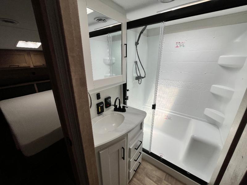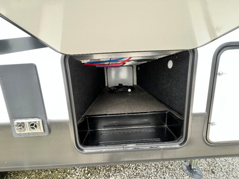 Pack your bags and head to the Grand Canyon or the beach in this spacious travel trailer. Once you arrive at the campground, you can enter in through the Curt entry steps and relax on the theater seating or U-shaped dinette. There is a fireplace here for a more at-home feel and plenty of space to move about thanks to the slide out. This model includes a microwave oven and a 21" Furrion range with a Piezo ignition to prepare meals each day, plus a pantry and a 10 cu. ft. 12V "Solar Friendly" refrigerator to store your perishables. The full bath includes a large shower with a glass door and a skylight for more standing space, and the front private bedroom includes a queen bed for a great night's rest. You'll also find a wardrobe slide here and an end table with an outlet and a USB port to charge your electronics.