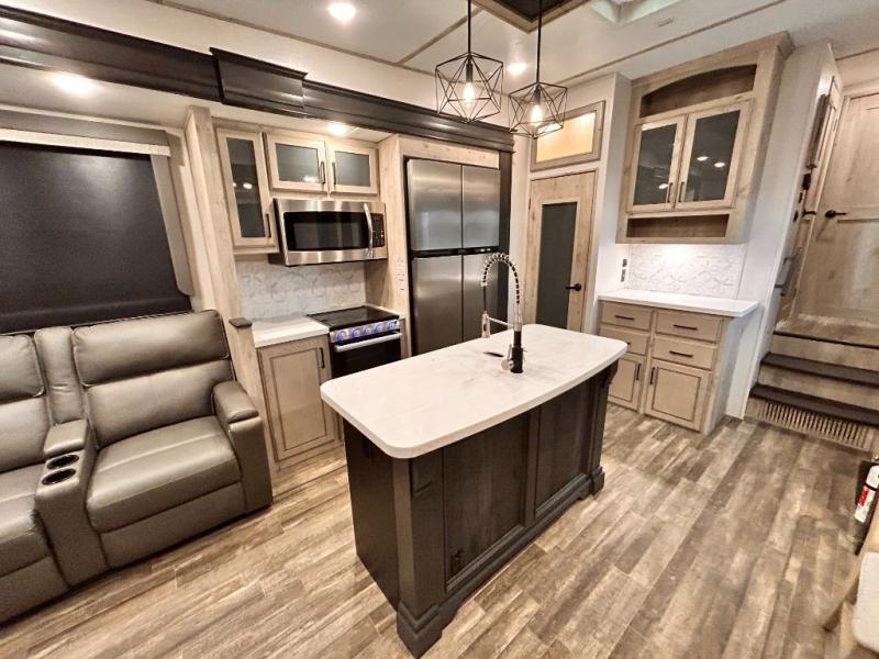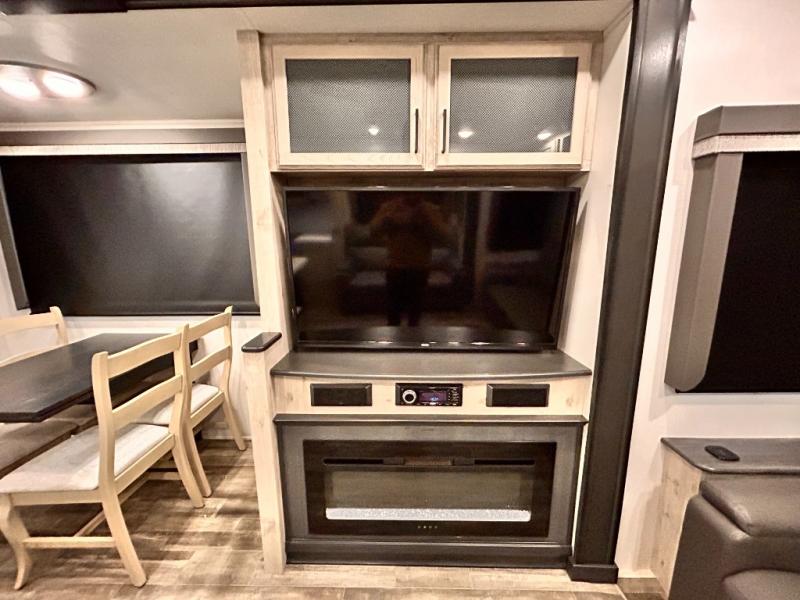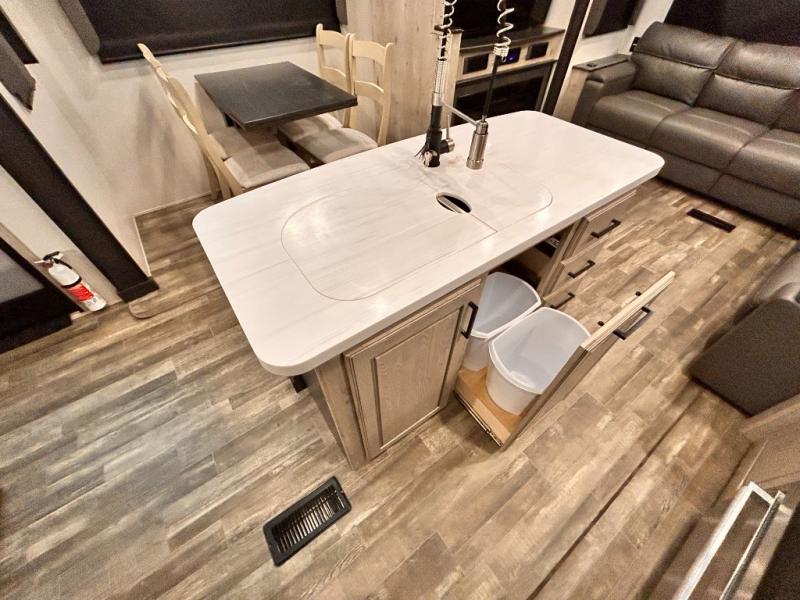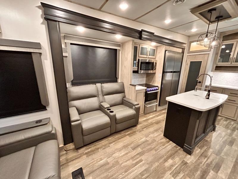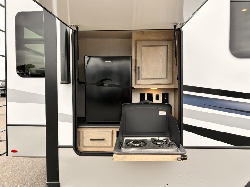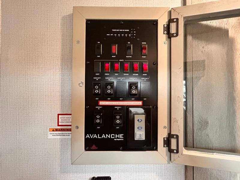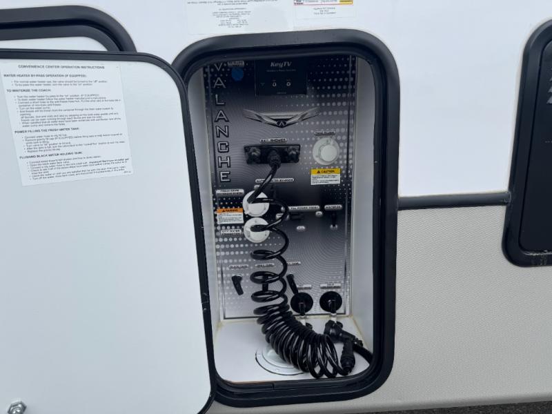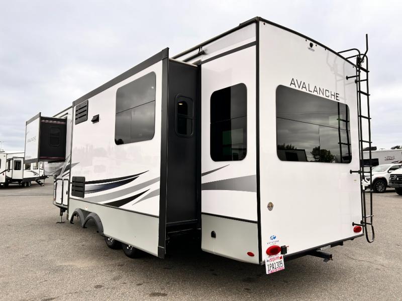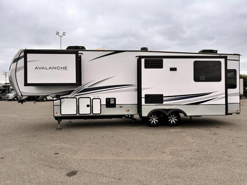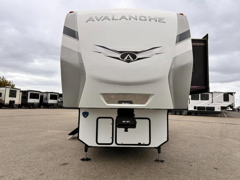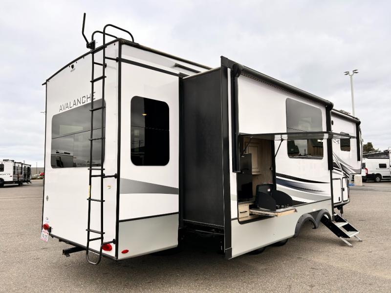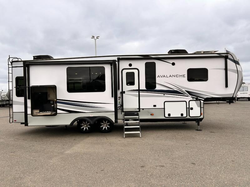 For the couple that enjoys entertaining, this Avalanche fifth wheel is sure to catch your eye! Triple slides open up the interior to create an inviting place to call home while on the road. The main combined living and kitchen area features dual opposing slides, which really maximizes this already 100" wide unit before the slides are opened. You will enjoy entertaining friends in the RV park, or even friends that come and stay a night or two since you have a hide-a-bed sofa sleeper for two! Theater seating opposite the entertainment center with 50" LED TV and fireplace makes it a cozy evening inside. The kitchen island with prep space and double sink makes it easy to be part of the conversation when prepping dinner with your guests, and you will love the 18 cu. ft. gas/electric refrigerator to keep your perishables fresh, along with a curio cabinet for storage and a pantry for your dry goods and snacks. You can even cook outside under the 11' Carefree awning protected from the elements at the Grill-N-Chill outside kitchen. Back inside and up the steps, you will find a front private bedroom and bath with dual entry. A king bed slide with storage beneath offers ample room for sleeping and a place to store extra blankets and things when not in use. You might choose the optional stackable washer and dryer if you enjoy long term or full-time RVing.