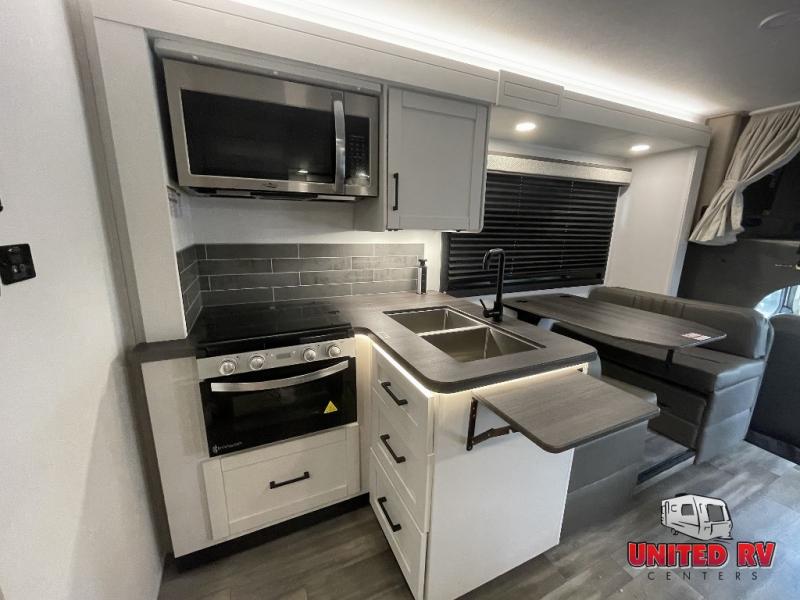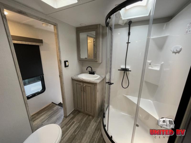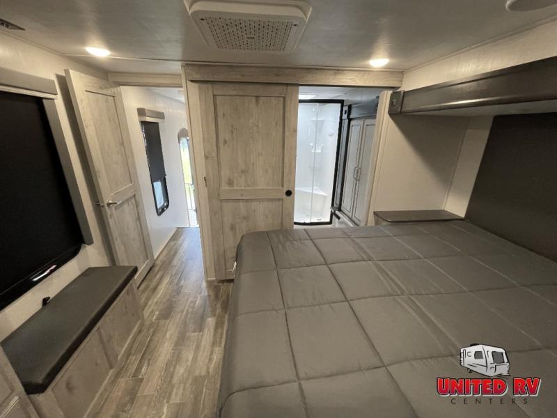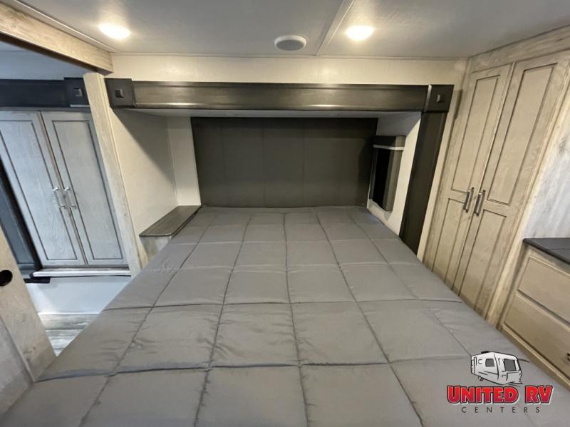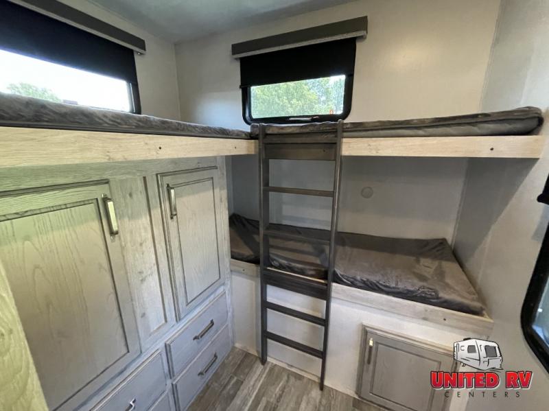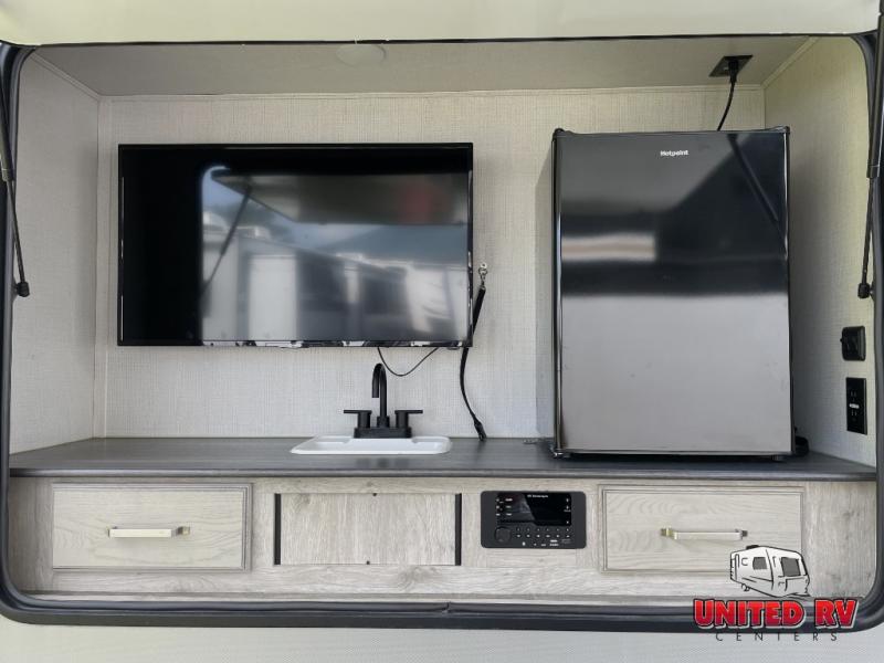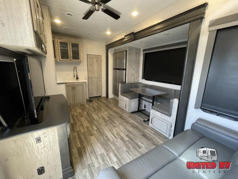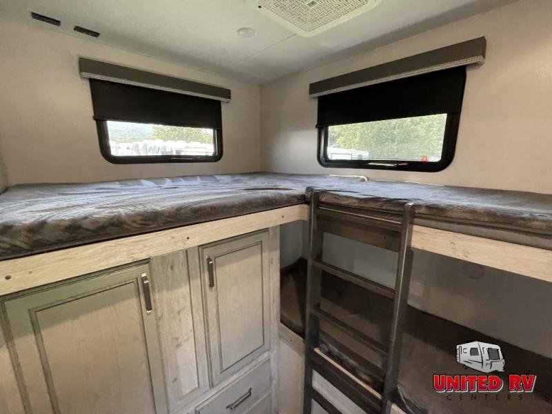 Get ready for lots of relaxation and fun with your favorite people when you stay in this fifth wheel! From the rear private bunkhouse with triple bunks and king-size bed in the front private bedroom, to the furniture that doubles as sleeping space, you can easily sleep eight to nine in this RV! The cook will love the kitchen amenities including the L-shaped corner countertop and the 18 cu. ft. refrigerator, plus the choice to make meals outside on the Grill-N-Chill outside kitchen which includes a TV for outdoor entertainment. The 18' awning offers protection from the elements and a great outdoor living area, just add your camping chairs. There is much more to love such as the fireplace for a cozy evening inside, the U-shaped dinette that offers an indoor dining and gaming area, as well as the tri-fold sofa sleeper. And the master suite will seal the deal with abundant storage, a bench seat, and access to the full bathroom.