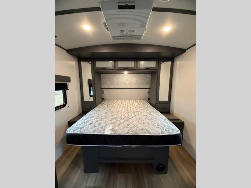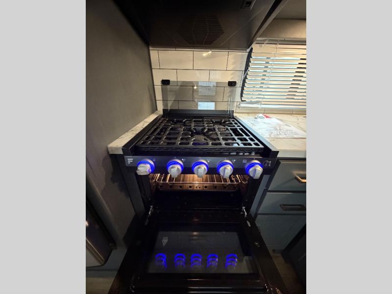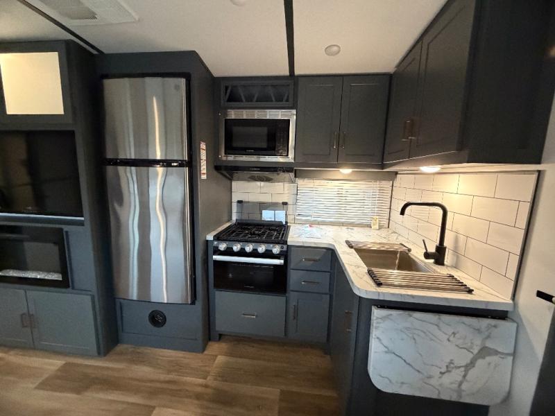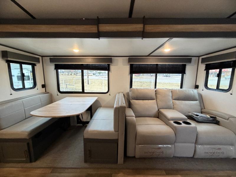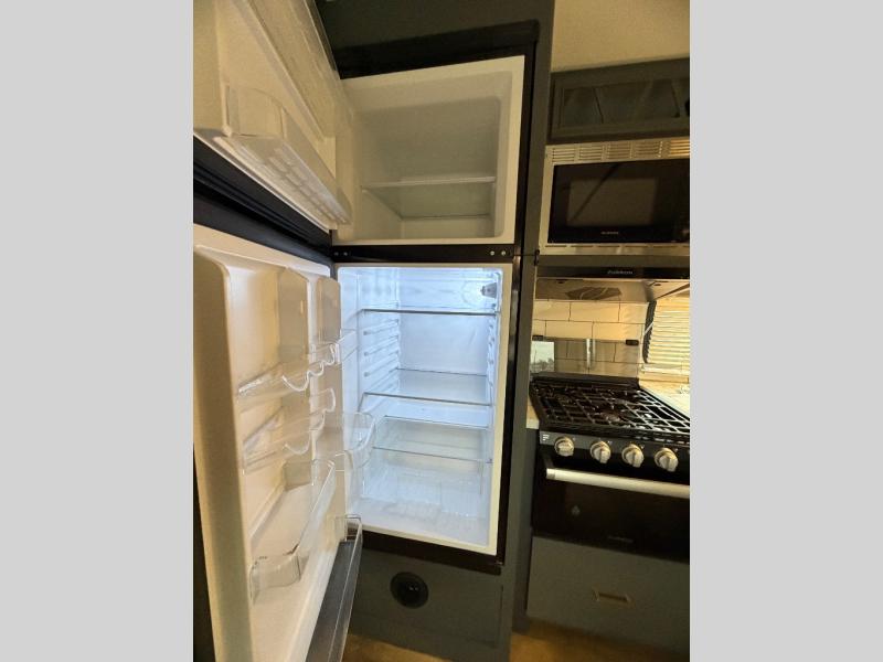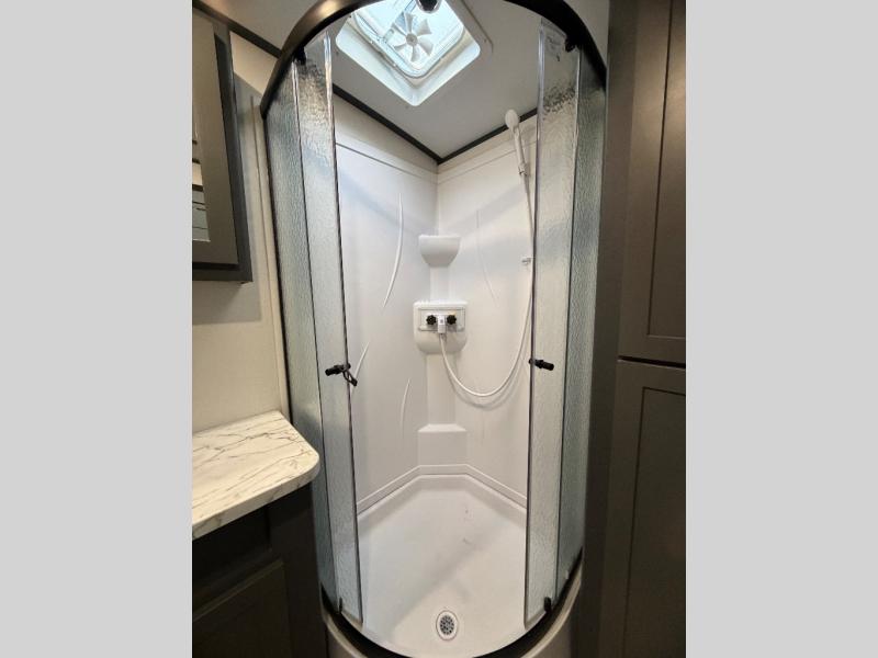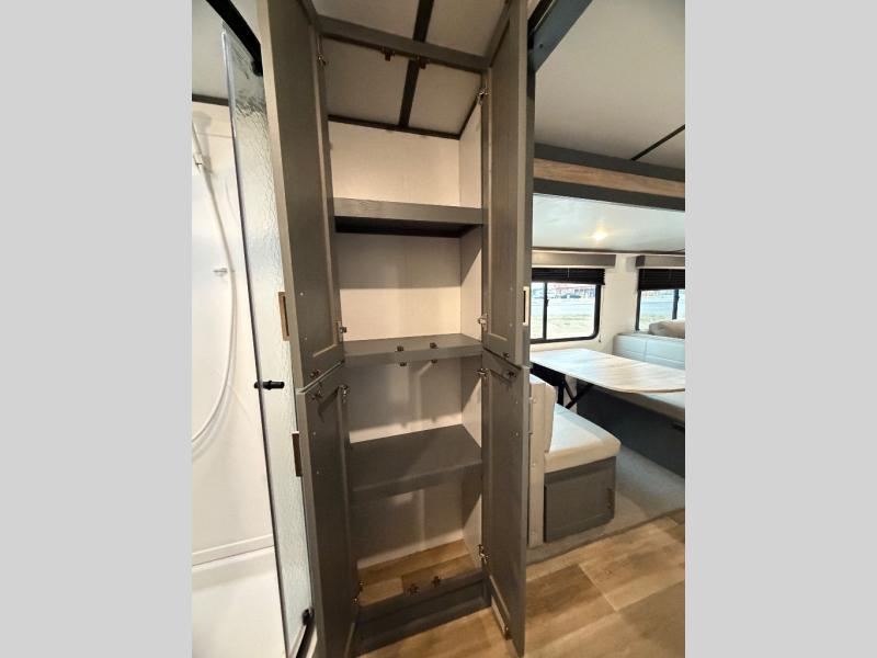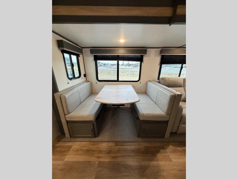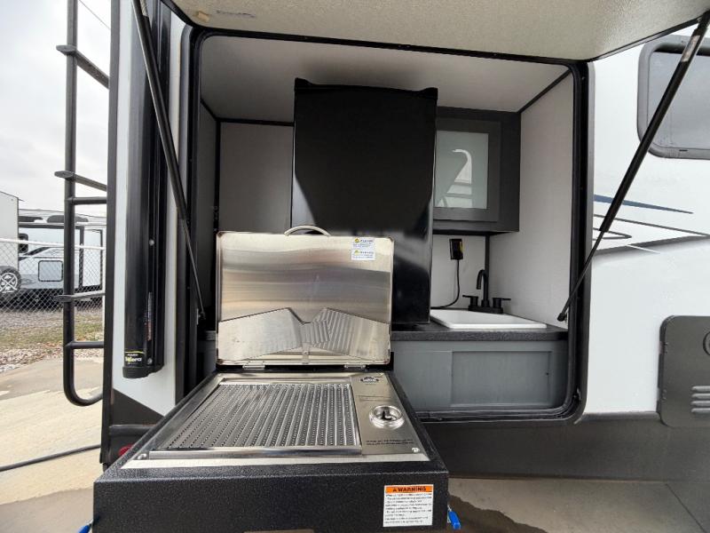 Enjoy camping with your family in this Bullet travel trailer that is perfect for a couple or a family of four. You will appreciate the private bedroom with wide entry including space saving sliding doors. The bedroom features a queen bed, wardrobes on either side, plus a laundry chute. There is also a large pass-through storage compartment beneath the front bedroom for your outdoor gear and more. A large slide features a Dream dinette and 68" tri-fold sofa that is great for relaxing during the day, and can easily be transformed for more sleeping space at night. Even the Dream dinette can serve as additional sleeping space if needed. Or, you could opt. for the free standing dinette with chairs if you do not prefer booth style seating and/or do not need the added option of more sleeping space. A large rear bath features a radius shower and linen storage, plus a vanity with sink and toilet. And, the chef can choose to cook inside or outside with the outdoor kitchen that includes a Capital grill, 4.4 cu. ft. refrigerator as well as a sink all tucked under the 21' awning.