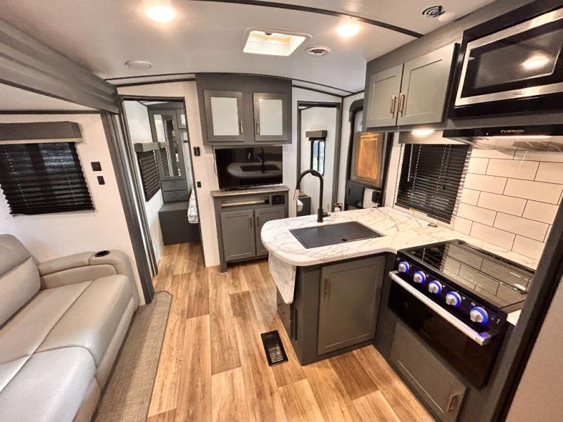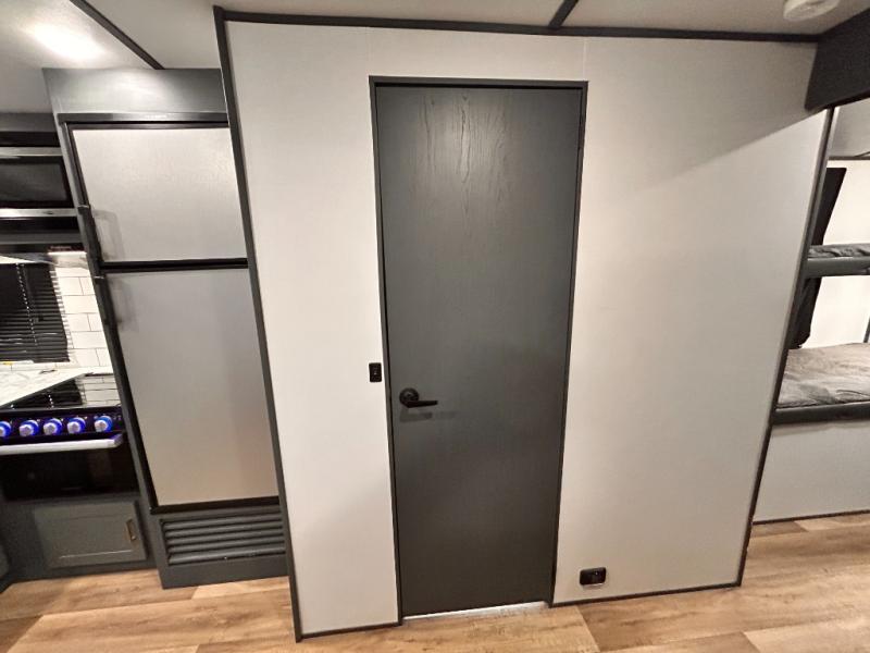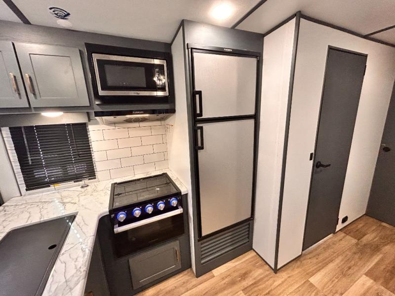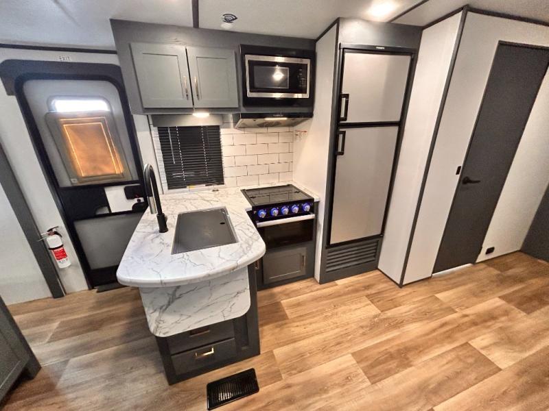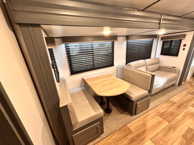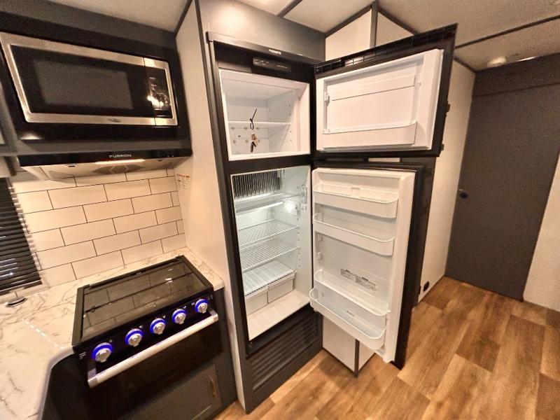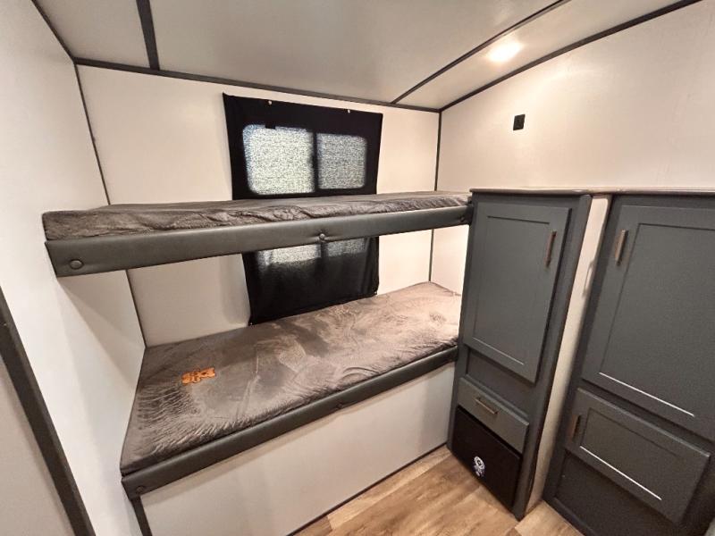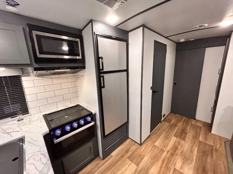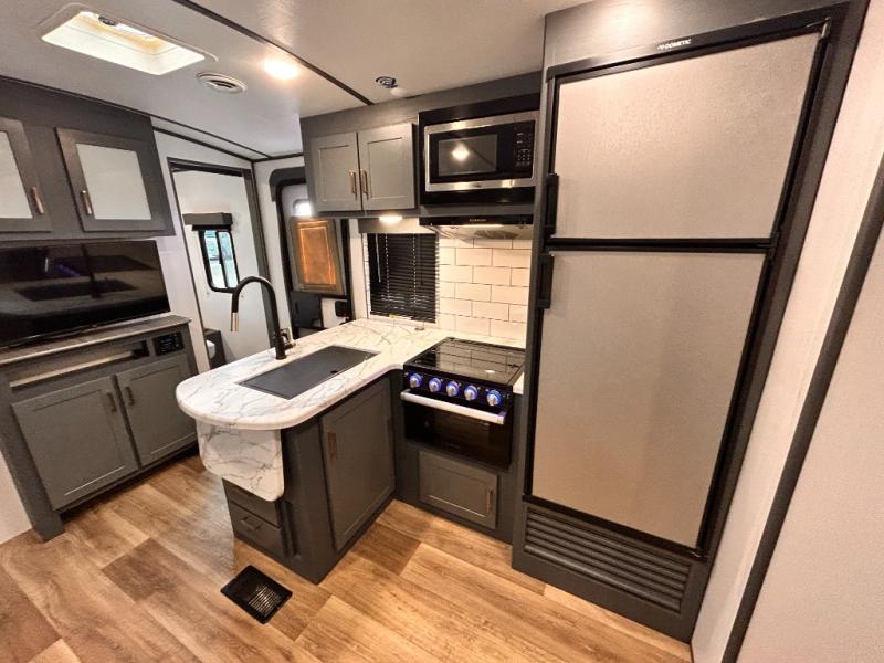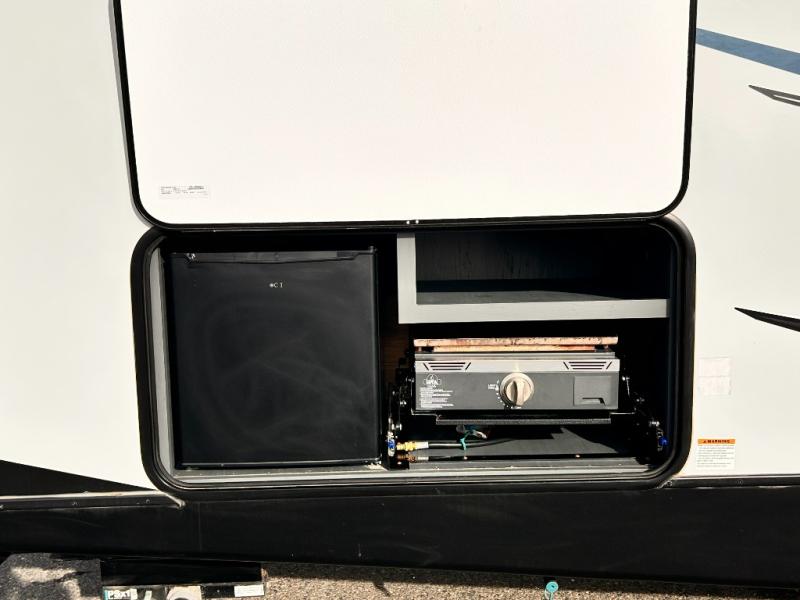 Get ready for family fun with this trailer at a local RV spot, your land, or a national park! The kids will love the private bunkhouse with triple bunks and a dinette to play at, plus they will have a wardrobe to place their things. You will have a queen-size bed in the front bedroom with dual access and two wardrobes, plus a laundry chute. Everyone can relax and dine at the Dream dinette and tri-fold sofa which are within the large slide. The cook will love the Furrion appliances and the 8 cu. ft. refrigerator when cooking, plus the pantry for storage. There is a single basin stainless steel sink and high rise faucet that will make cleaning up easy. And along the exterior, the outside kitchen is available for meals, plus the 15' electric awning gives you an outdoor living area protected from the elements.