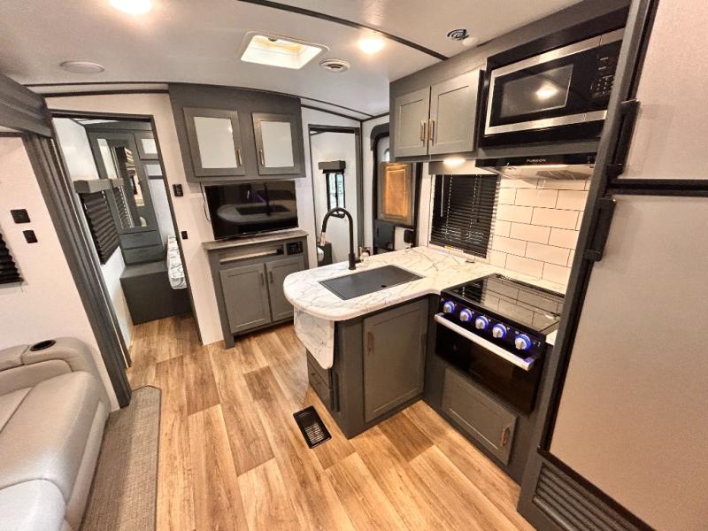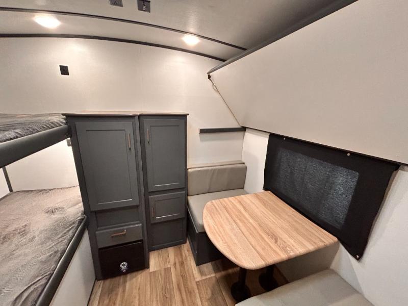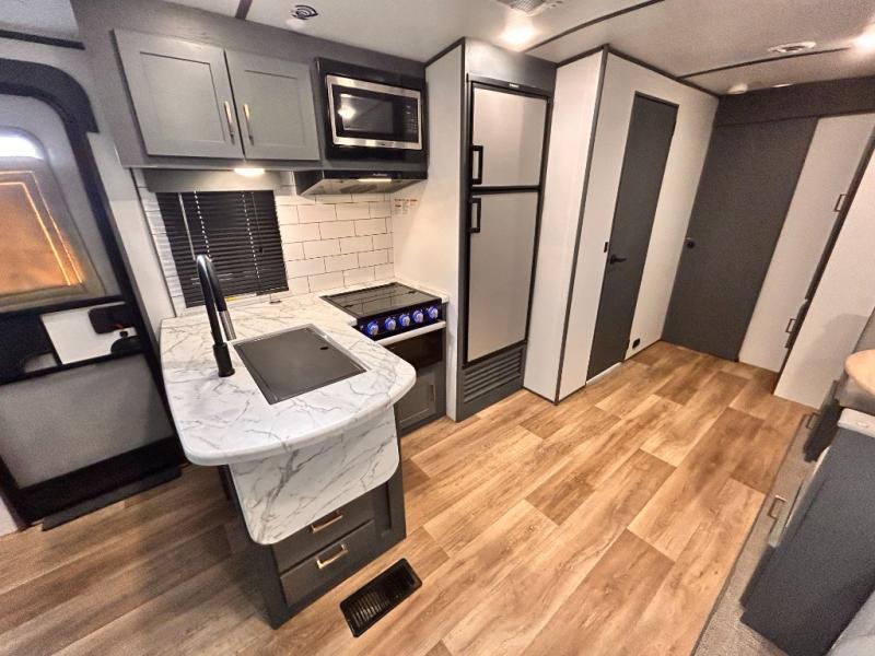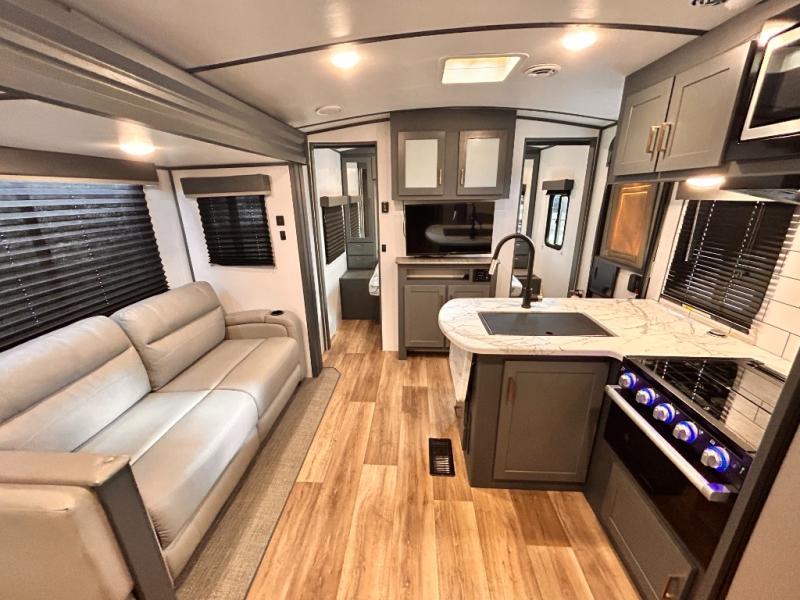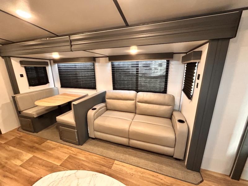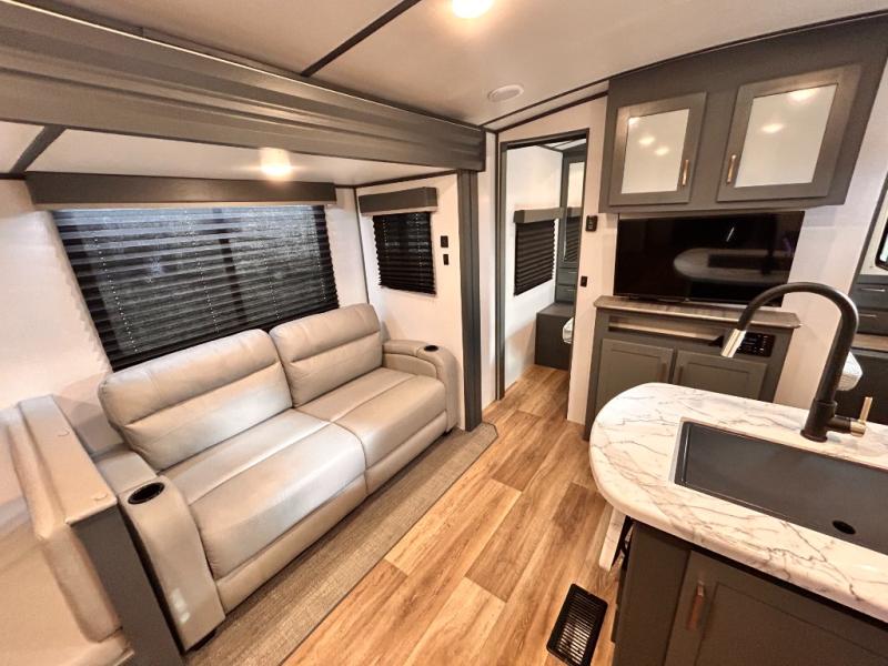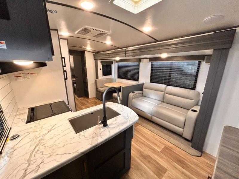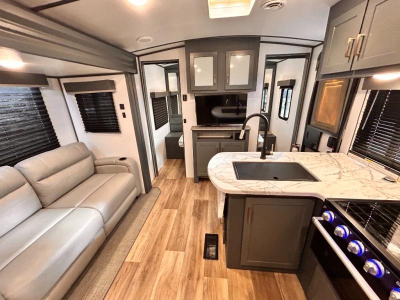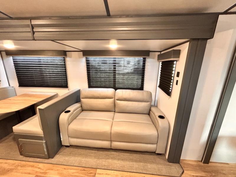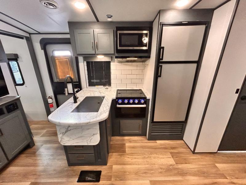 Get ready for family fun with this trailer at a local RV spot, your land, or a national park! The kids will love the private bunkhouse with triple bunks and a dinette to play at, plus they will have a wardrobe to place their things. You will have a queen-size bed in the front bedroom with dual access and two wardrobes, plus a laundry chute. Everyone can relax and dine at the Dream dinette and tri-fold sofa which are within the large slide. The cook will love the Furrion appliances and the 8 cu. ft. refrigerator when cooking, plus the pantry for storage. There is a single basin stainless steel sink and high rise faucet that will make cleaning up easy. And along the exterior, the outside kitchen is available for meals, plus the 15' electric awning gives you an outdoor living area protected from the elements.