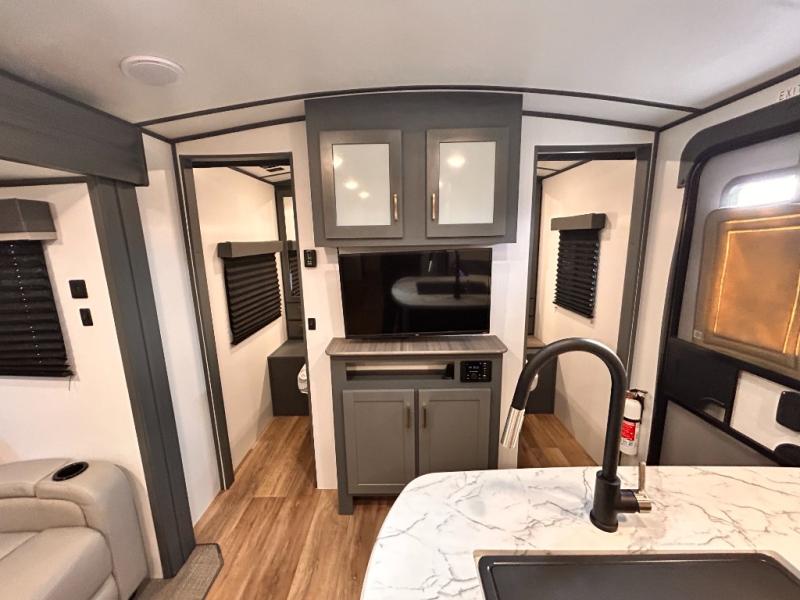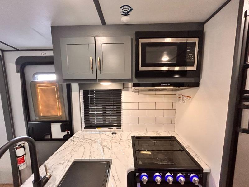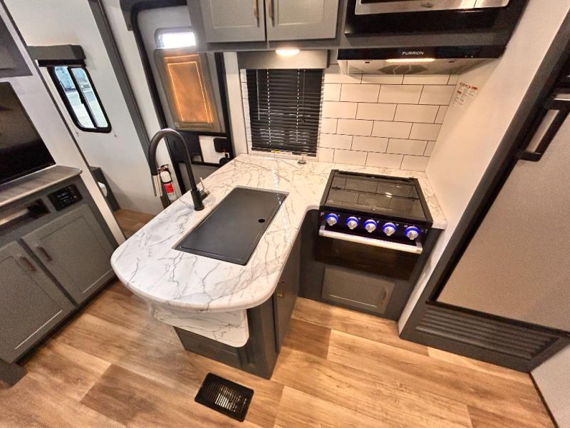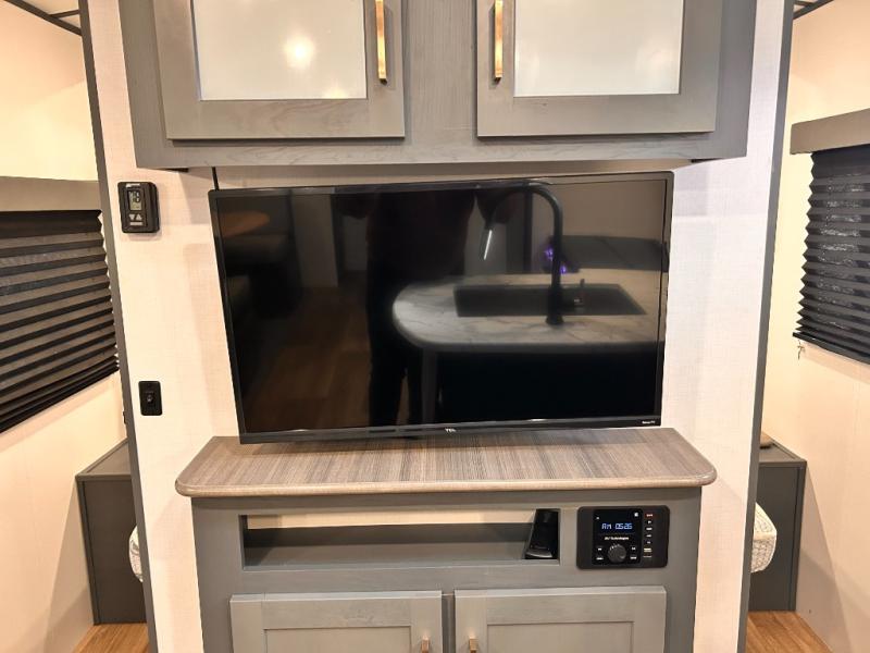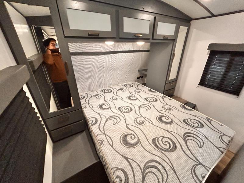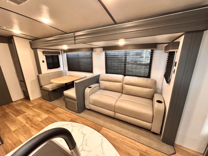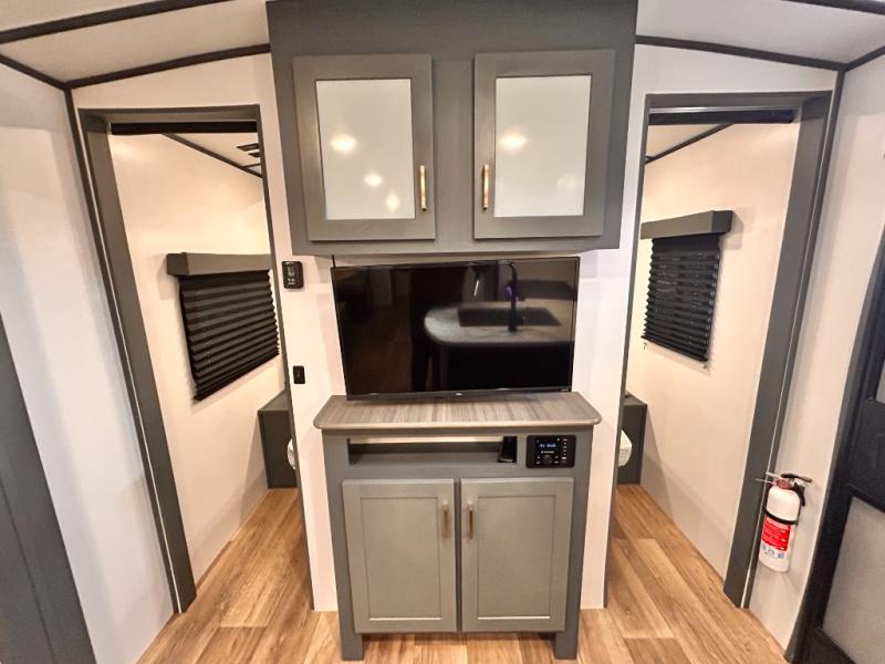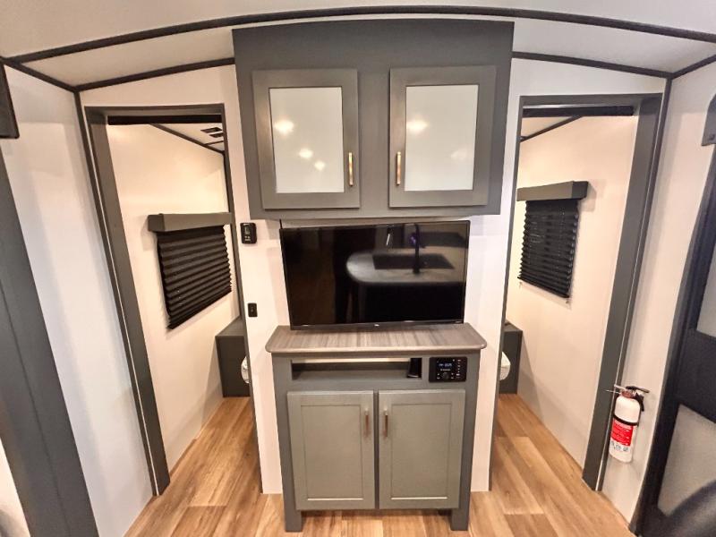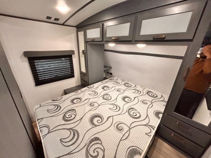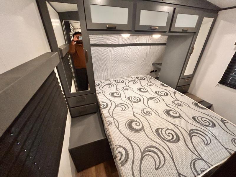 Get ready for family fun with this trailer at a local RV spot, your land, or a national park! The kids will love the private bunkhouse with triple bunks and a dinette to play at, plus they will have a wardrobe to place their things. You will have a queen-size bed in the front bedroom with dual access and two wardrobes, plus a laundry chute. Everyone can relax and dine at the Dream dinette and tri-fold sofa which are within the large slide. The cook will love the Furrion appliances and the 8 cu. ft. refrigerator when cooking, plus the pantry for storage. There is a single basin stainless steel sink and high rise faucet that will make cleaning up easy. And along the exterior, the outside kitchen is available for meals, plus the 15' electric awning gives you an outdoor living area protected from the elements.