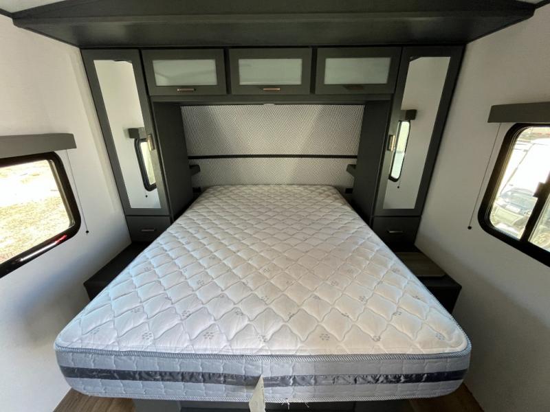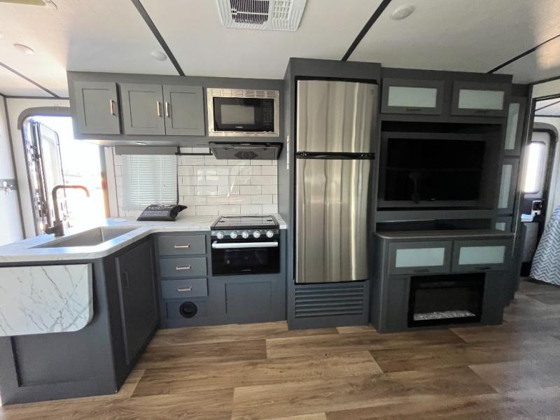 Indoor full kitchen amenities, an outside kitchen, an exterior and interior entry into the full bathroom and a space saving sliding door into the front bedroom are a few reasons you will love this trailer that accommodates nine at night. Yet the double-size bunks with privacy curtain and ladder, plus the slide out with a tri-fold sofa and Dream dinette might be the reason you choose this RV. The cook will love the Furrion appliances, the 8 cu. ft. refrigerator and the single basin stainless steel sink to make meals for everyone, plus the outside kitchen gives them more choices. And you can sleep like a queen in the bedroom which also includes dual wardrobes and a laundry chute.
