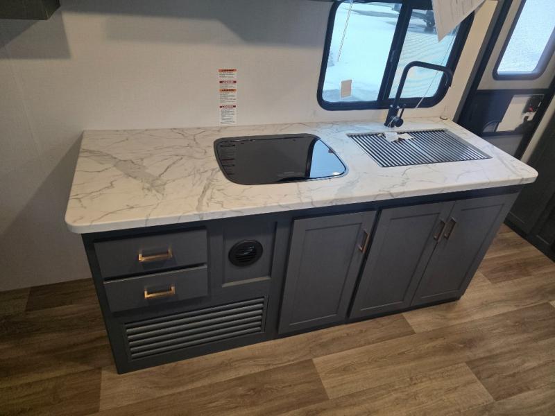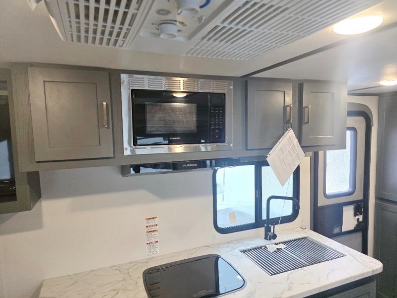 Lightweight camping doesn't have to mean small living spaces, and this travel trailer proves that. You'll be pleasantly surprised by the amount of space you have thanks to the tri-fold sofa slide out with a folding table, and there is a queen bed up front just like at home. The convenient laundry chute goes straight to the exterior pass-through storage to make wash day easier than ever, plus there is a full bath to stay clean throughout your trip. And don't overlook the kitchen that is equipped with everything you need, including a two burner gas range, a 10 cu. ft. 12V refrigerator, plus a pantry for snacks!