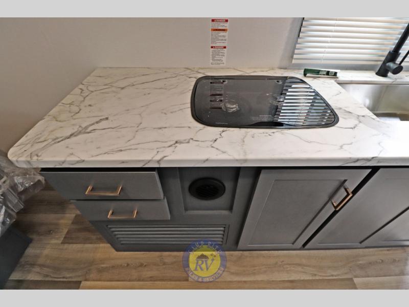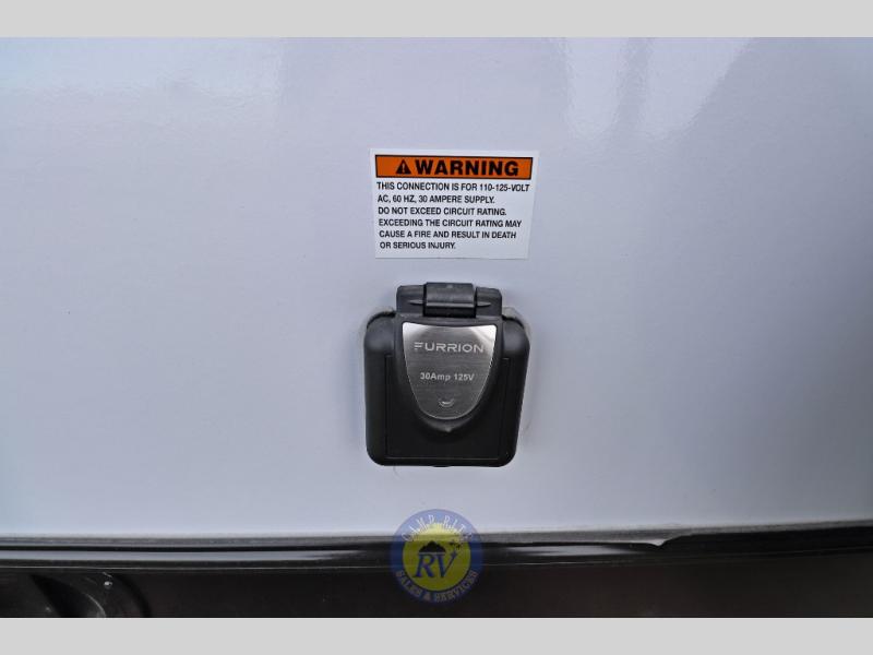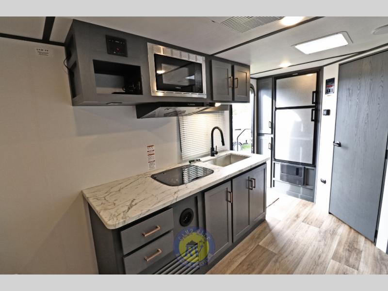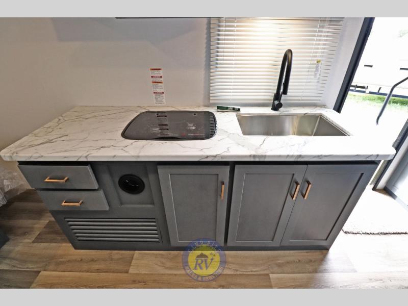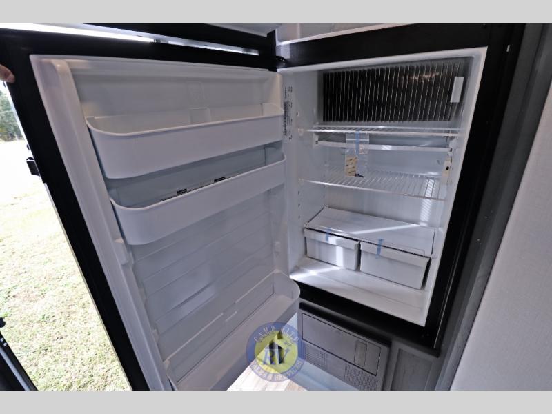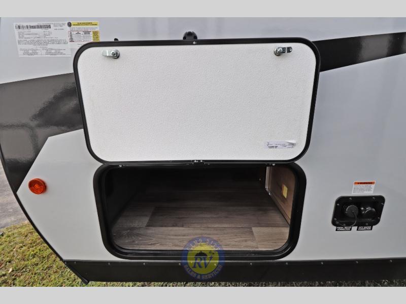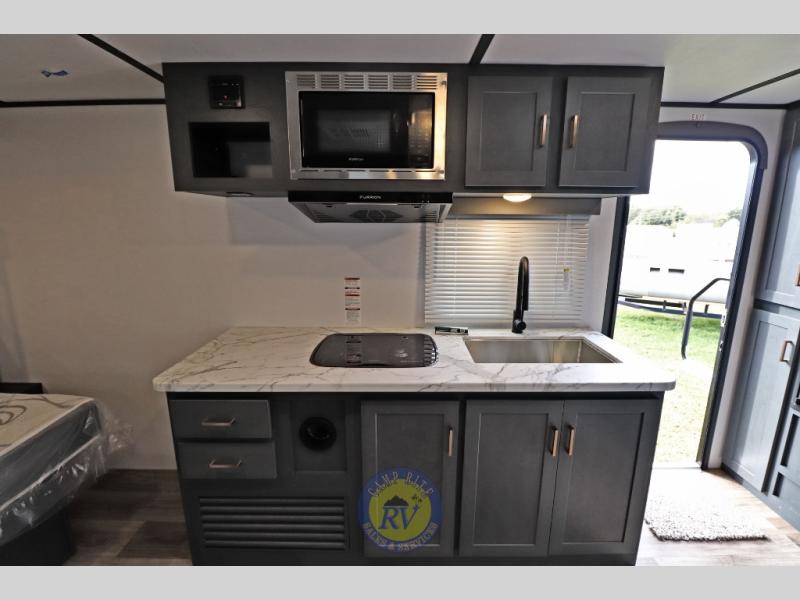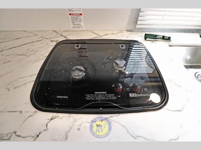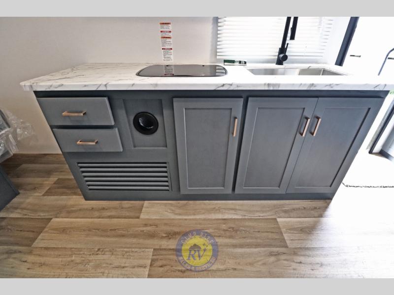 Lightweight camping doesn't have to mean small living spaces, and this travel trailer proves that. You'll be pleasantly surprised by the amount of space you have thanks to the tri-fold sofa slide out with a folding table, and there is a queen bed up front just like at home. The convenient laundry chute goes straight to the exterior pass-through storage to make wash day easier than ever, plus there is a full bath to stay clean throughout your trip. And don't overlook the kitchen that is equipped with everything you need, including a two burner gas range, a 10 cu. ft. 12V refrigerator, plus a pantry for snacks!