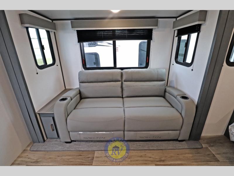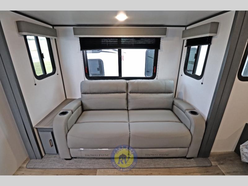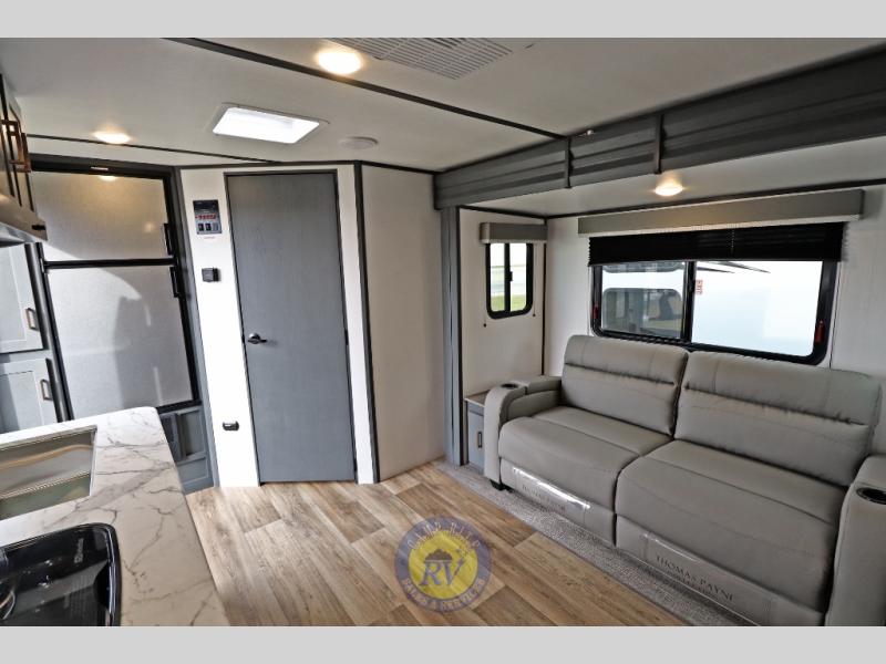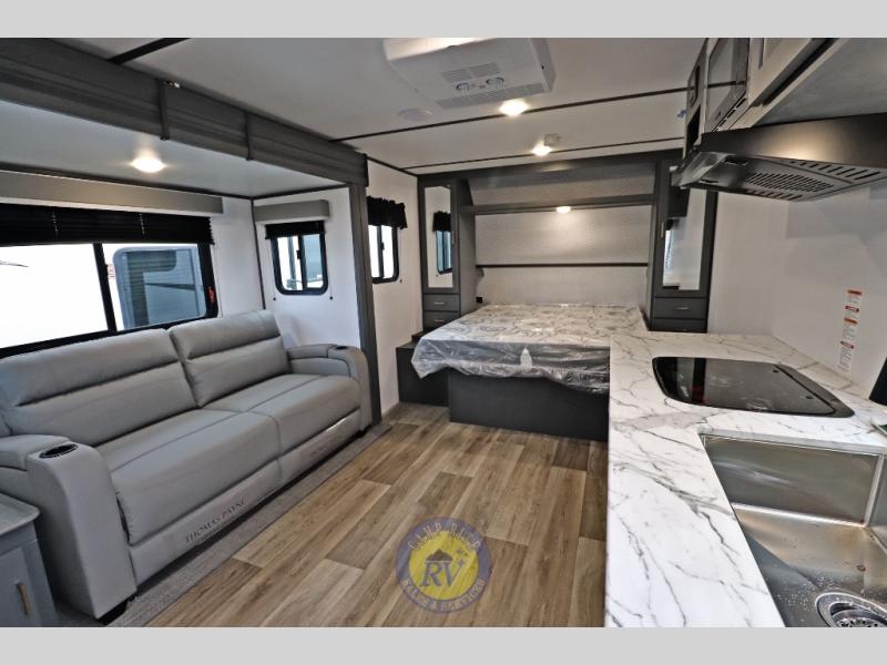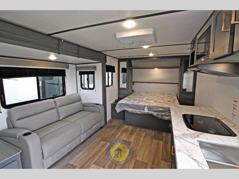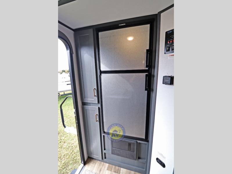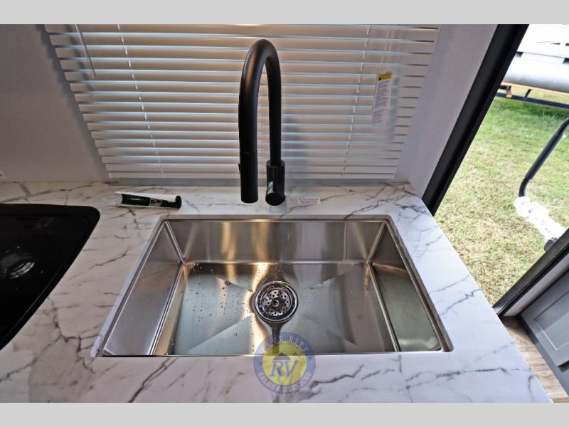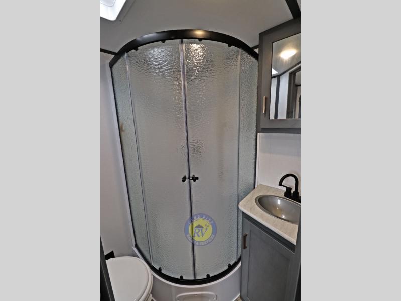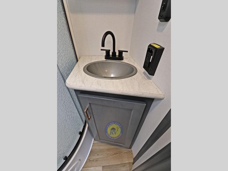 Lightweight camping doesn't have to mean small living spaces, and this travel trailer proves that. You'll be pleasantly surprised by the amount of space you have thanks to the tri-fold sofa slide out with a folding table, and there is a queen bed up front just like at home. The convenient laundry chute goes straight to the exterior pass-through storage to make wash day easier than ever, plus there is a full bath to stay clean throughout your trip. And don't overlook the kitchen that is equipped with everything you need, including a two burner gas range, a 10 cu. ft. 12V refrigerator, plus a pantry for snacks!