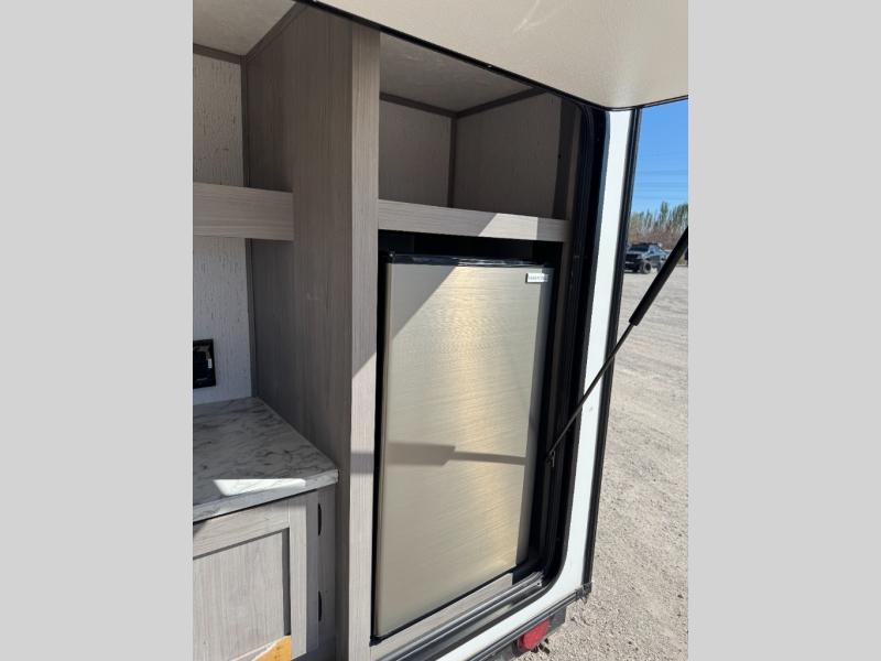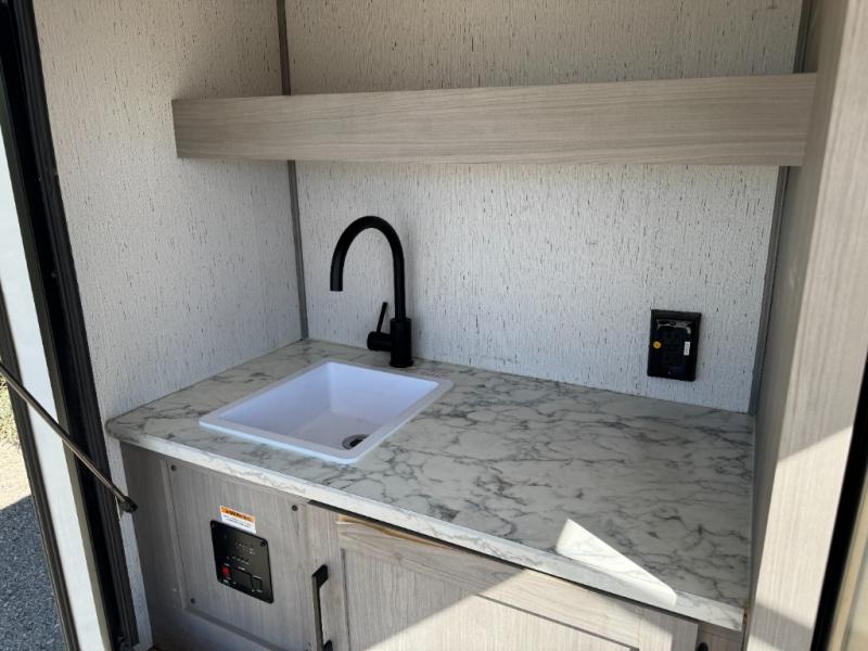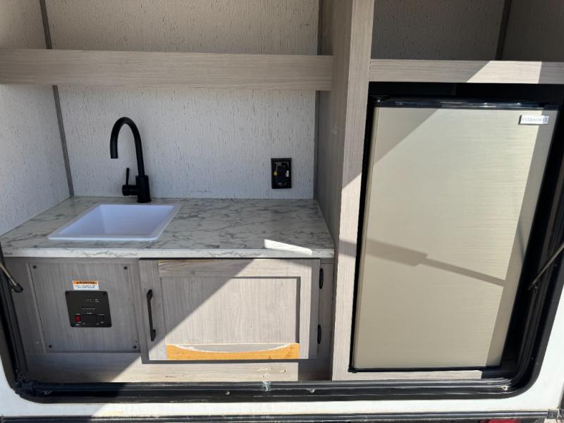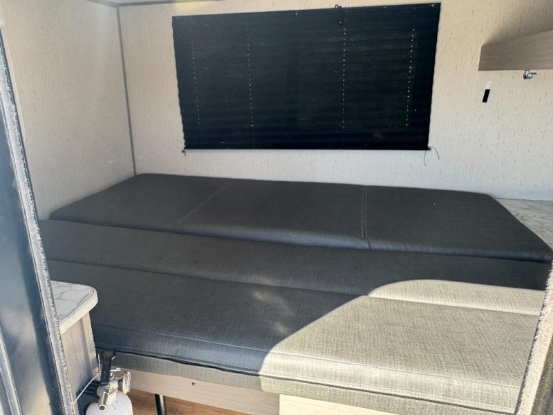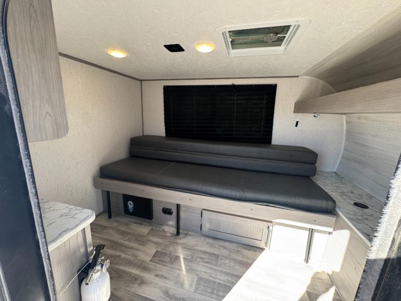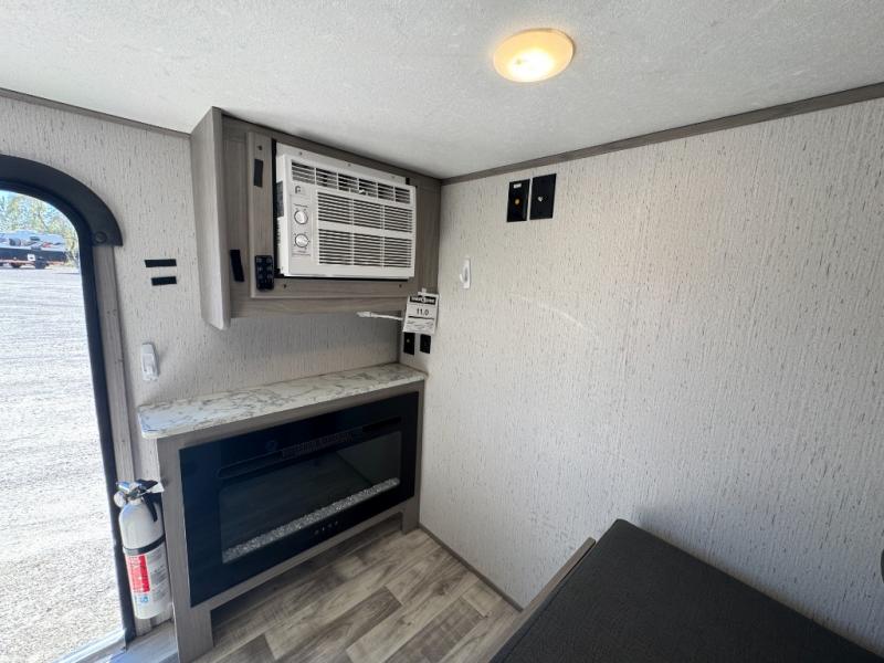 If you are looking to transition from tent camping to a trailer, take your adventures up a notch with this cozy couples unit featuring dry sleeping every night and a hatch back kitchen will be great for all of your cooking needs thanks to the sink and refrigerator, storage cabinets and shelves, plus an exterior side mount griddle for bacon and eggs in the morning and burgers in the afternoon. Inside, a fireplace to take the chill out when it's cold, and a 74" gaucho sofa for seating during the day, then easily converts to a comfortable bed at night.