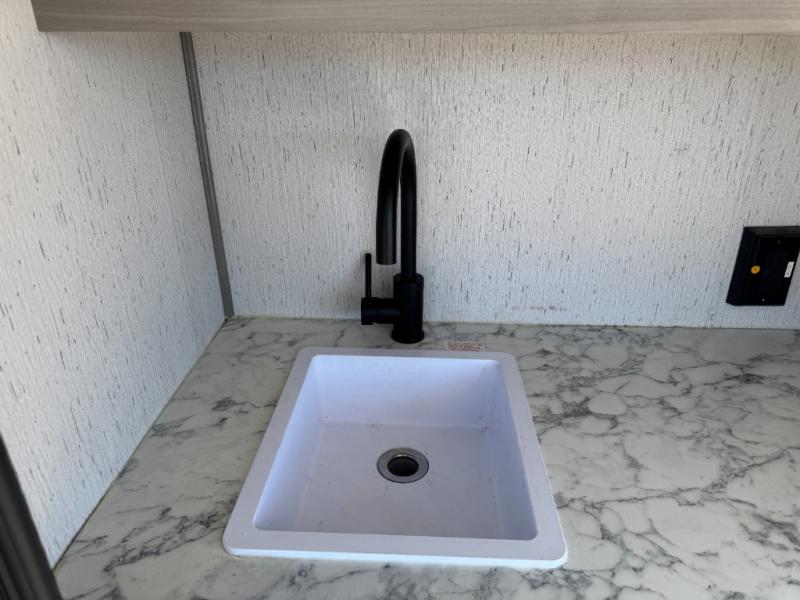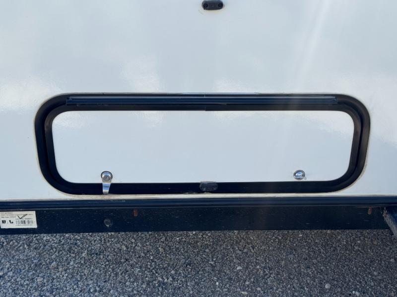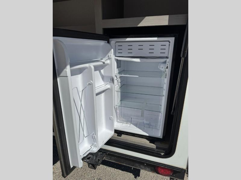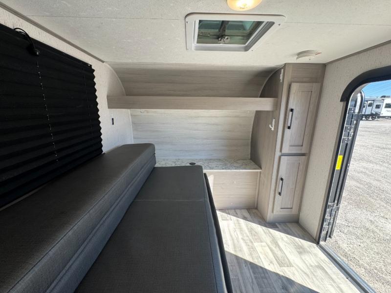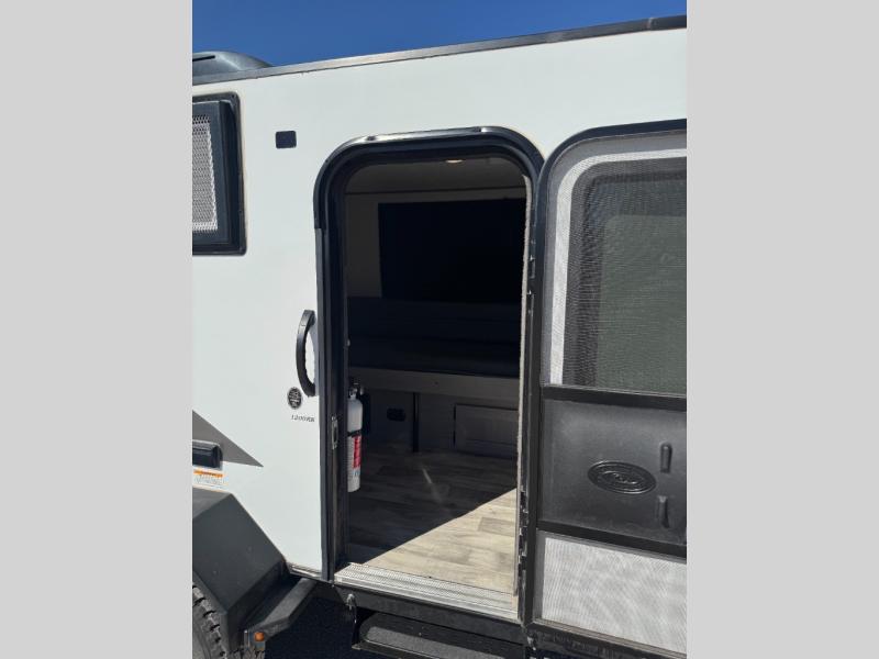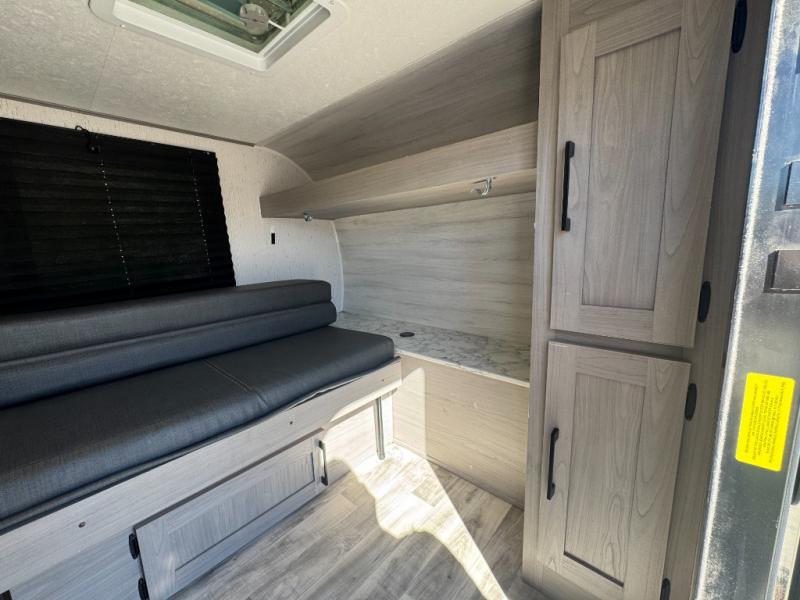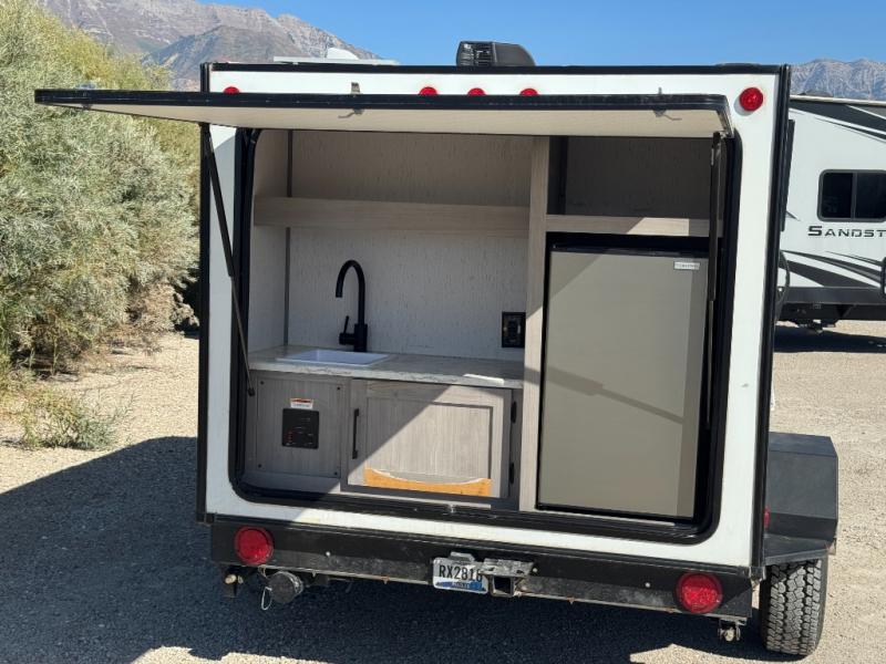 If you are looking to transition from tent camping to a trailer, take your adventures up a notch with this cozy couples unit featuring dry sleeping every night and a hatch back kitchen will be great for all of your cooking needs thanks to the sink and refrigerator, storage cabinets and shelves, plus an exterior side mount griddle for bacon and eggs in the morning and burgers in the afternoon. Inside, a fireplace to take the chill out when it's cold, and a 74" gaucho sofa for seating during the day, then easily converts to a comfortable bed at night.