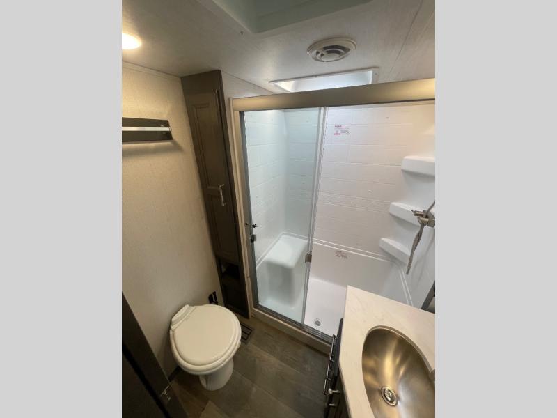If you are looking for a fifth wheel that sleeps 4-6 with inside and outside cooking then check this unit out! This unit offers a short, mid-living layout with a bedroom wardrobe slide and combined 12 volt refrigerator and 68" tri-fold sofa sleeper slide for added floorspace to move about. Up front, you will enjoy a private bedroom with a queen bed and bedside wardrobe/nightstands as well as a larger wardrobe that slides out along the curbside wall. A complete bath provides a large shower, toilet and sink, plus linen storage which you are sure to appreciate as you travel. There are plenty of options for this unit making it easy to customize to your use and style. The theater seating and free standing dinette options can be selected in place of the sleeper sofa and booth dinette if you prefer, as well as an 8 cu. ft. RV refrigerator instead of the 12 volt that comes standard. If you enjoy spending time outdoors, imagine making breakfast for your friends and family using the outside griddle. There is also a 16' awning to create even more living space to enjoy, and the unobstructed pass-through storage compartment can easily house all of your outdoor camping gear like lawn chairs and yard games.