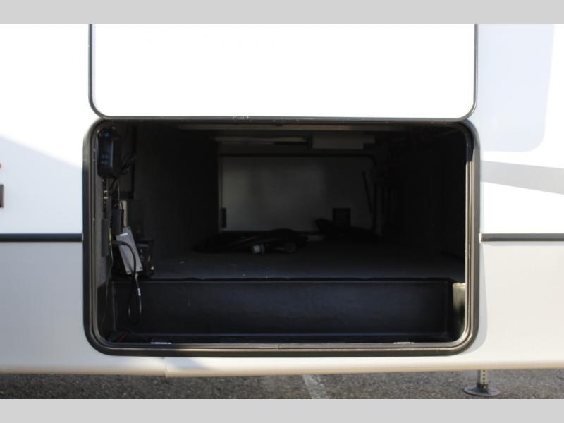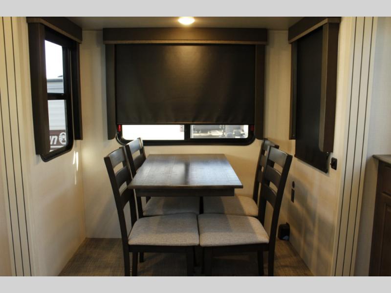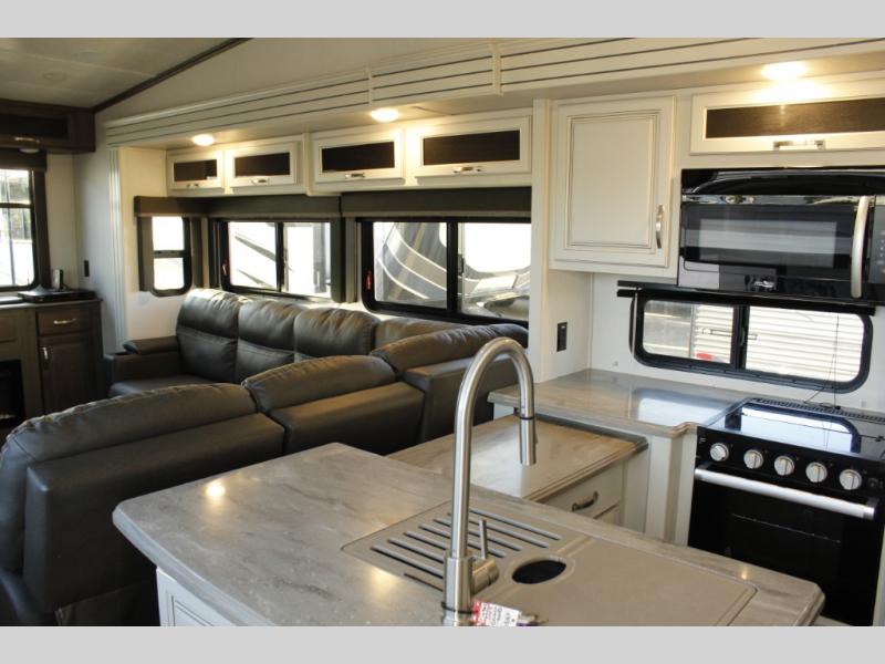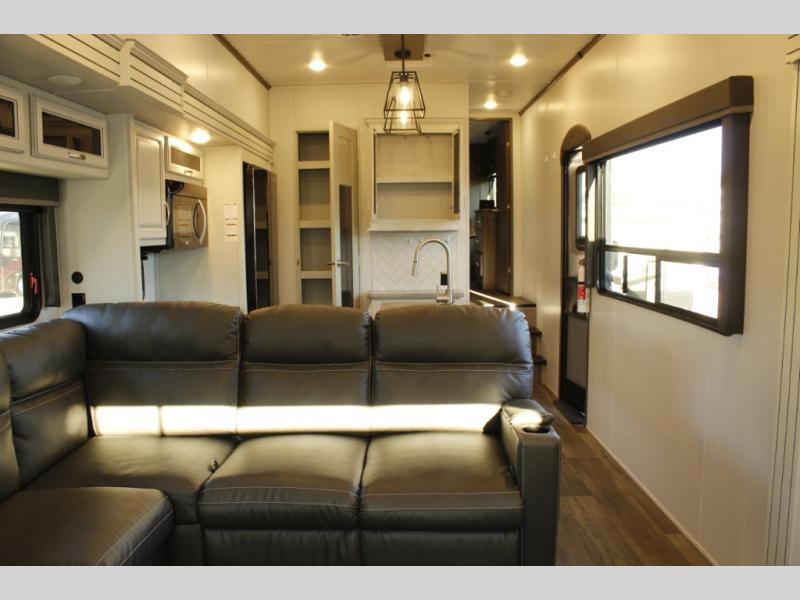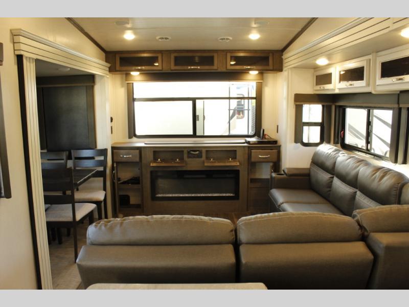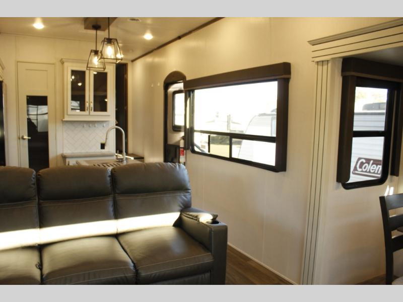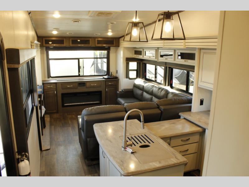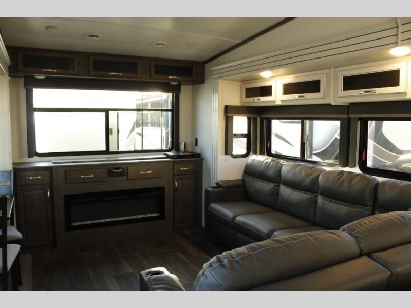 Time at the campground will be spent in comfort thanks to this fifth wheel that can sleep four to six people comfortably. The rear living area/den includes a huge L-shaped sofa with theater seats and a king tri-fold sofa, plus a free-standing dinette, a fireplace, and an LED HDTV for movie nights. The chef of your group will love the additional counter space in the kitchen, along with a 21" Furrion range, a pantry, plus bar stool seating. The full bath allows you to clean up each day and the front private bedroom will provide you with your own space at night. Here, you'll find a queen bed slide out that can optioned out for a king bed, plus a full height wardrobe, a second wardrobe with washer and dryer prep, and a dresser for tons of storage space! And don't overlook the exterior with its LCI solid steps and 17' electric awning!