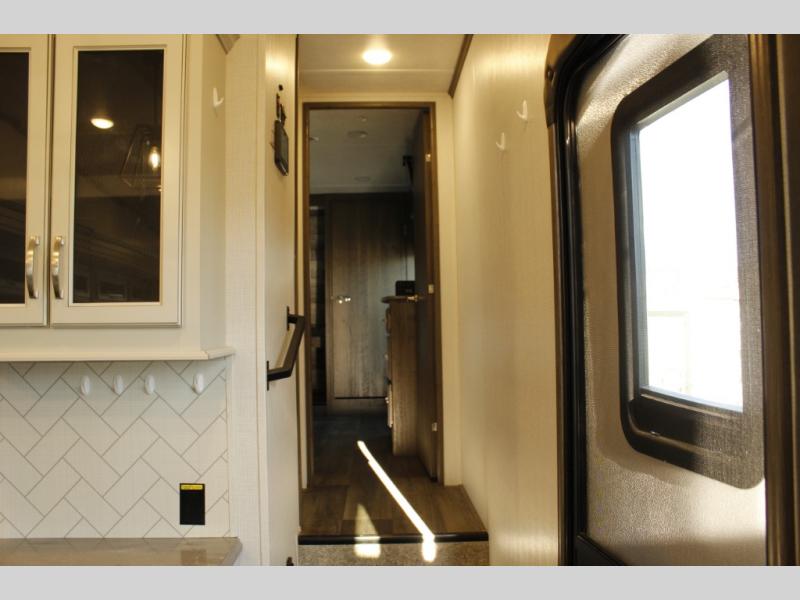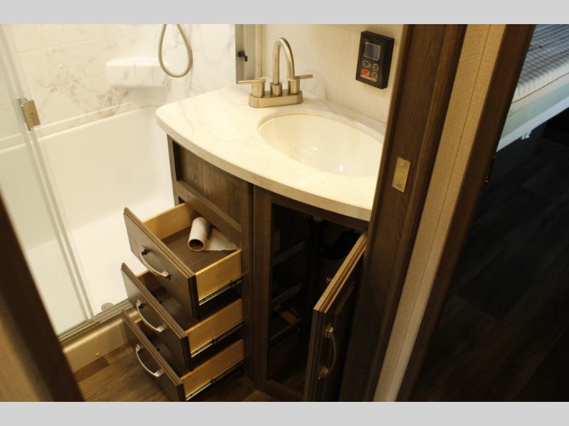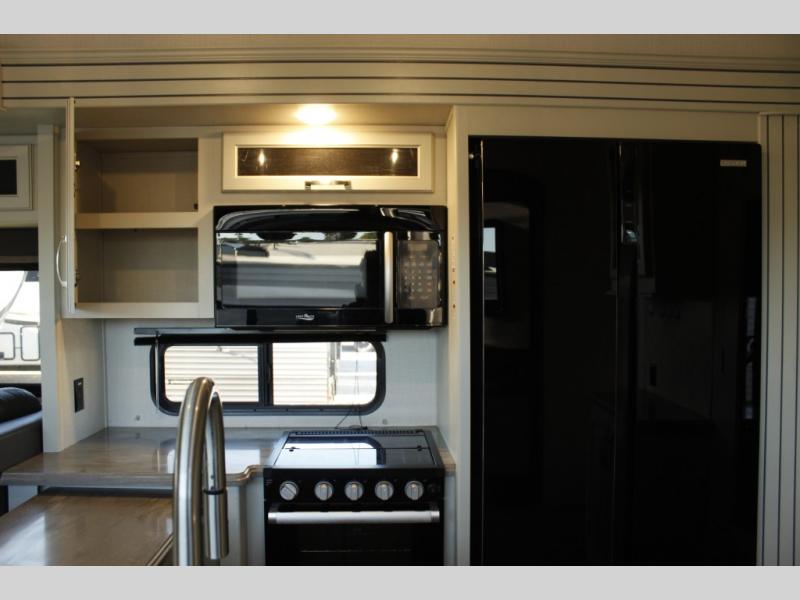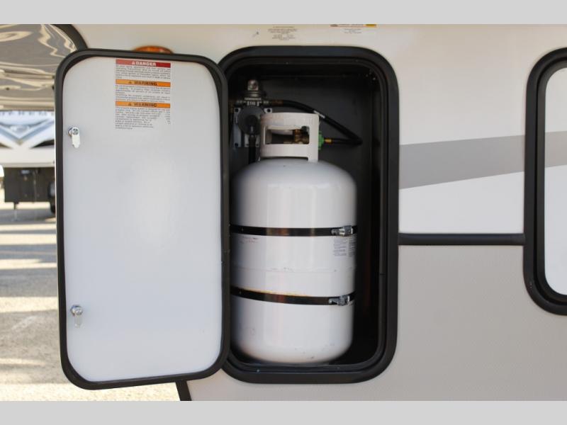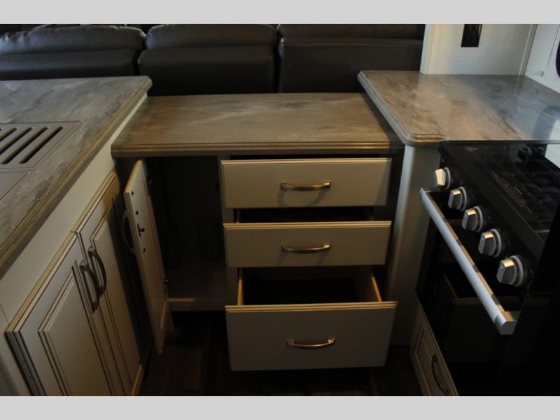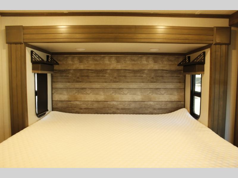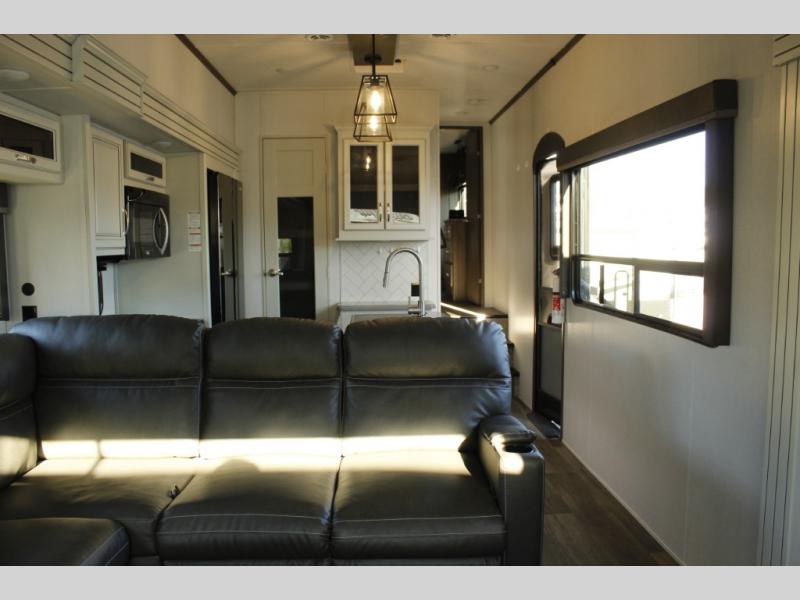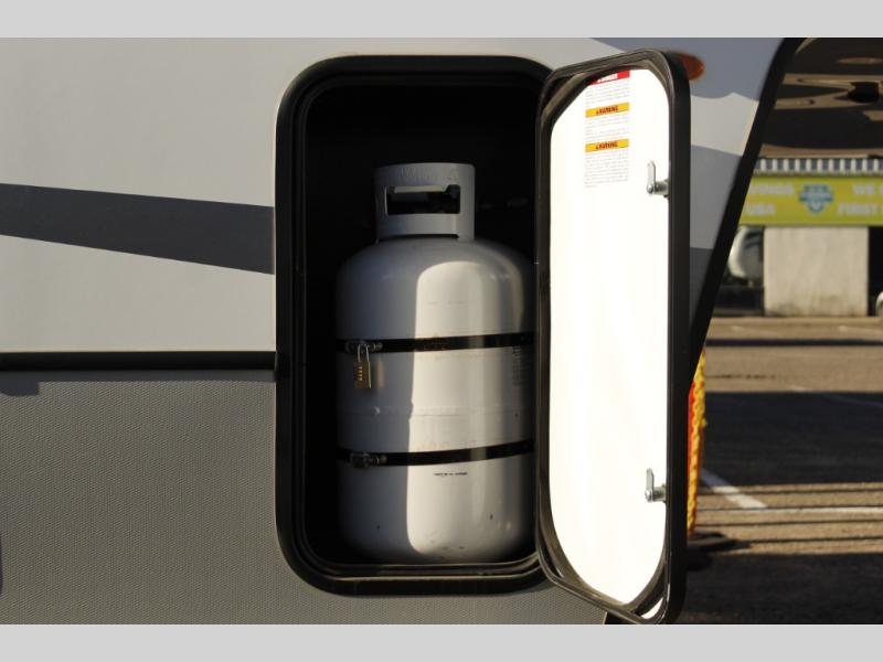 Time at the campground will be spent in comfort thanks to this fifth wheel that can sleep four to six people comfortably. The rear living area/den includes a huge L-shaped sofa with theater seats and a king tri-fold sofa, plus a free-standing dinette, a fireplace, and an LED HDTV for movie nights. The chef of your group will love the additional counter space in the kitchen, along with a 21" Furrion range, a pantry, plus bar stool seating. The full bath allows you to clean up each day and the front private bedroom will provide you with your own space at night. Here, you'll find a queen bed slide out that can optioned out for a king bed, plus a full height wardrobe, a second wardrobe with washer and dryer prep, and a dresser for tons of storage space! And don't overlook the exterior with its LCI solid steps and 17' electric awning!