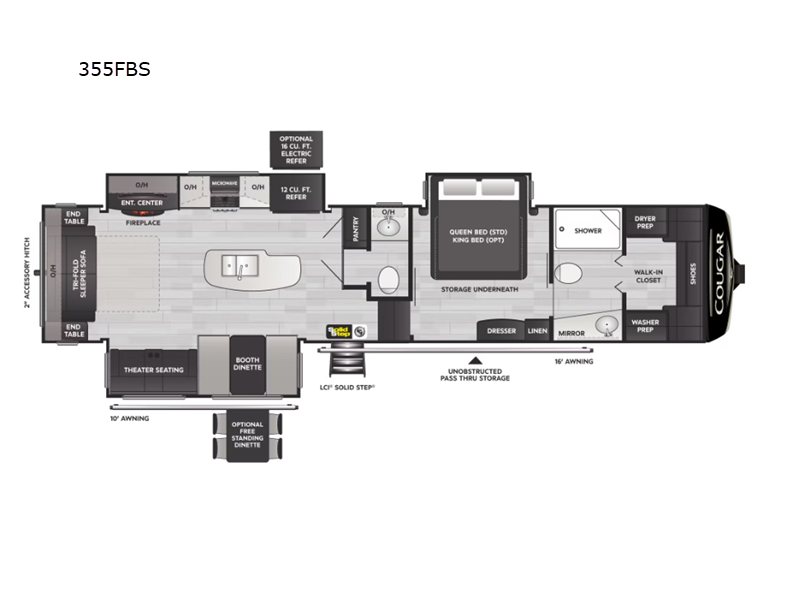 Spend more time having fun and less time worrying about your RV with the Keystone Cougar fifth wheel! These units have all that you will need for excellent vacations. The interior comes with 5/8" one-piece DynaSpan® flooring, tall slide outs for added comfort and head room, night roller shades throughout, and residential, raised-panel hardwood cabinet doors and drawers. You will also enjoy decorative crown molding, a 5,500 BTU electric fireplace with thermostat control and remote, and a Max Air exhaust fan with rain sensor. The exterior is also fully outfitted with a convenience center, friction-hinge entry door, electric four-point auto leveling system, and LCI® SolidStep® on the main entry. There is a full pass-through storage with slam-latch baggage doors, an industry-best 80-gallon fresh tank capacity, a 2" accessory hitch with 300-LB storage capacity, and an outside shower.