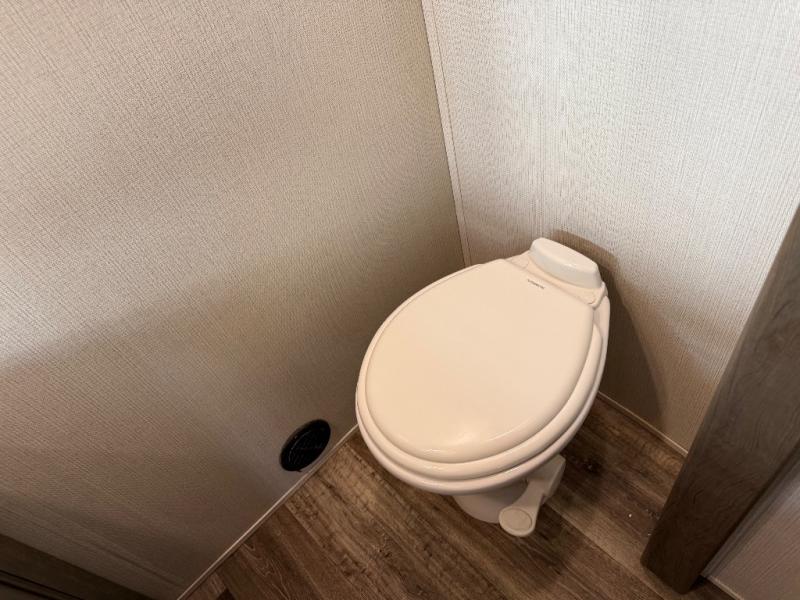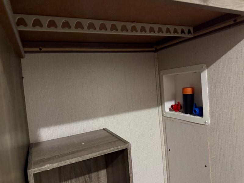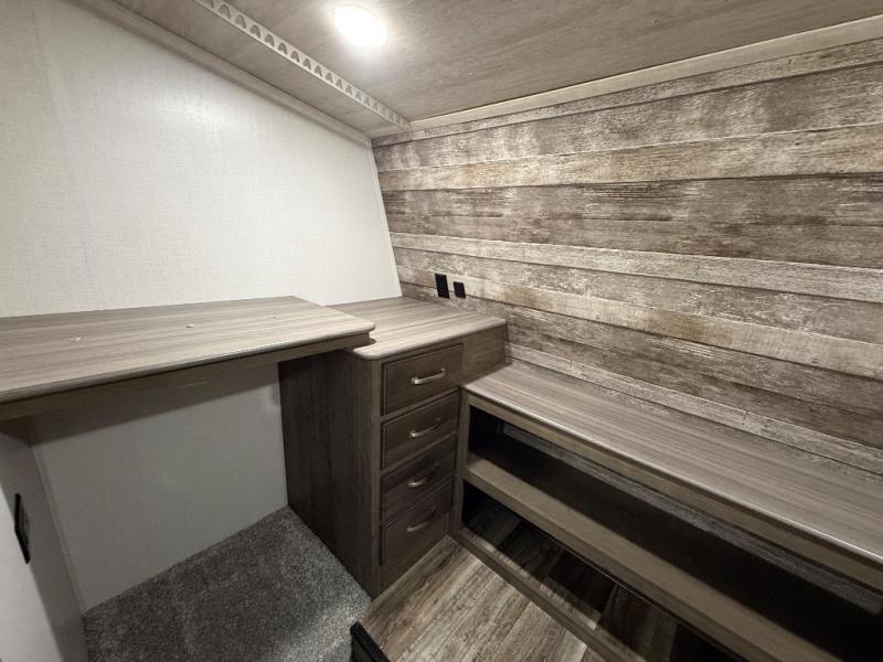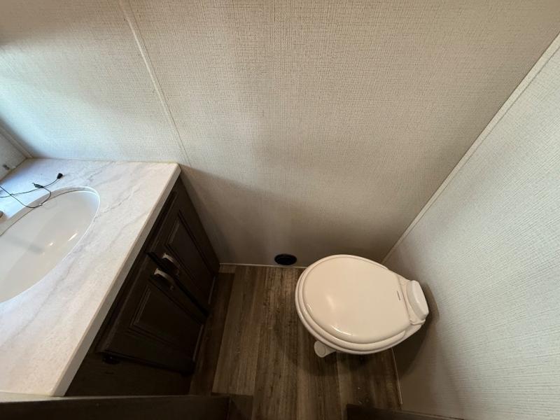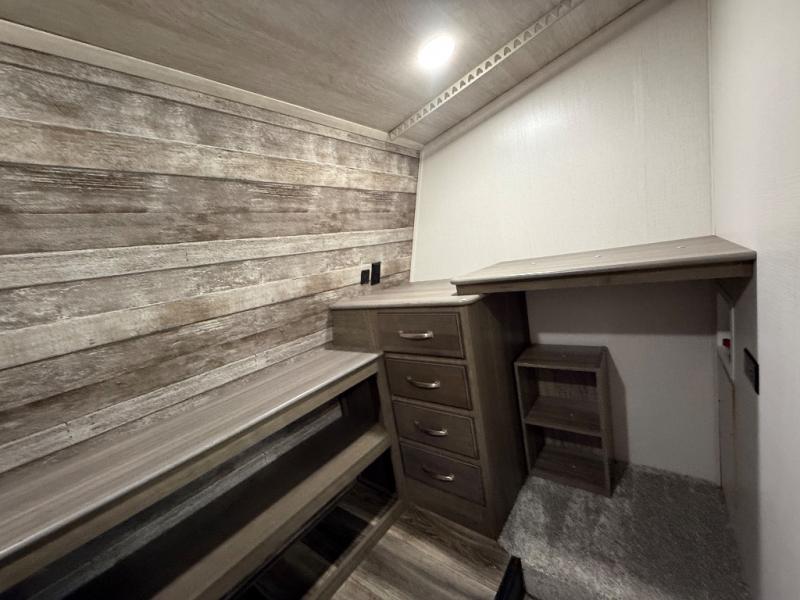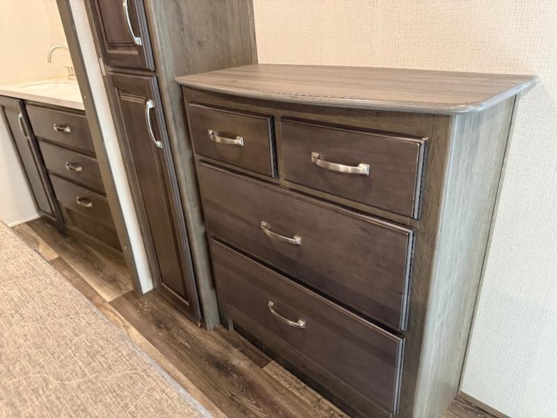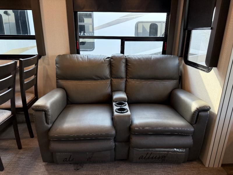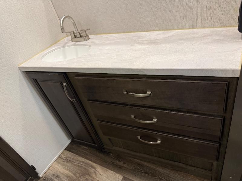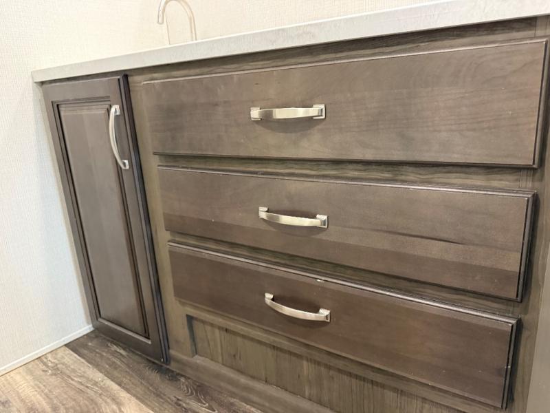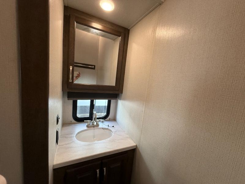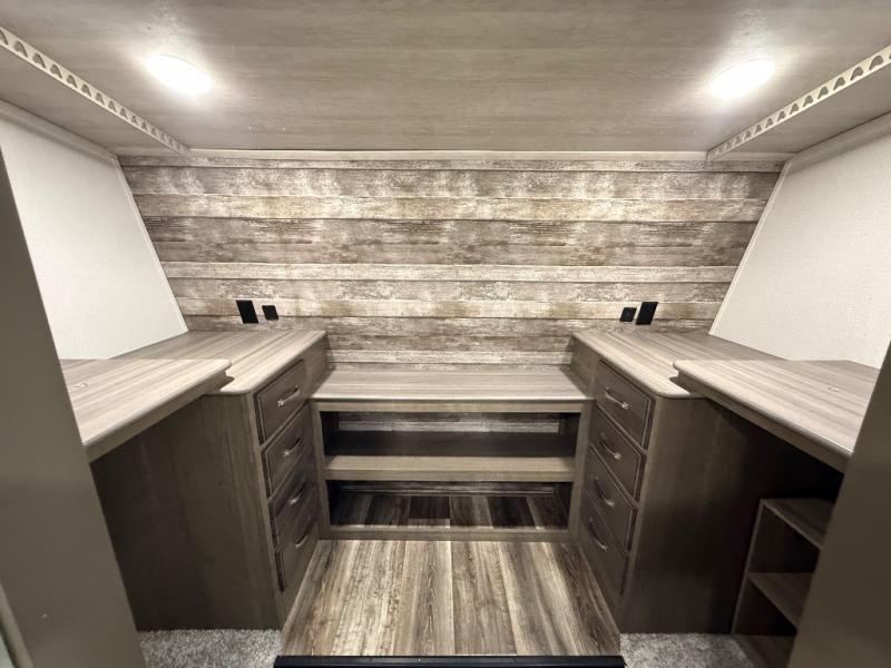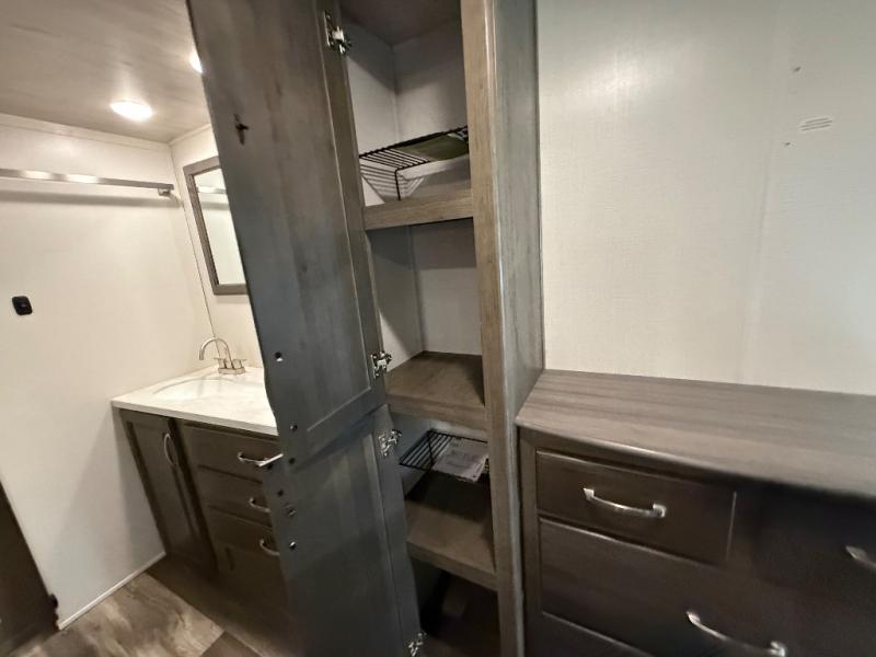 You will be so excited to take this Cougar fifth wheel out for the first time! Because of its secluded and fully stocked master suite at the front, this unit is perfect for a couple who wants to see the country or visit family. The master bathroom has a wonderful walk-in closet that has shoe storage and preparations for a washer/dryer. There is also under-bed storage in the bedroom portion, and the queen bed slide gives you a little more space to get to the dresser and linen closet. The half bathroom is located out in the main living area so that your friends will have a place to go when they visit. Opposing slides keep this living area open for lounging comfortably on the tri-fold sleeper sofa and theater seating, and you can get everyone together for a board game at the booth dinette.