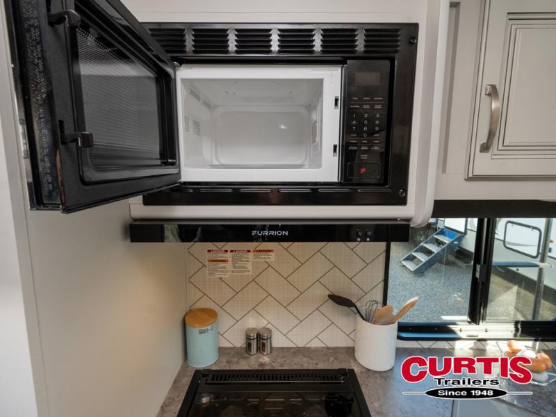 Get to your favorite places with this accommodating and stylish Cougar Half-Ton travel trailer! The single slide holds the 68" tri-fold sleeper sofa so that you can have enough room to spread out and relax at night, and if you want a little snack while you play some games, you can heat up some popcorn in the microwave. After the night has ended, nothing will feel better than snuggling into the king-size bed up front in the master suite.