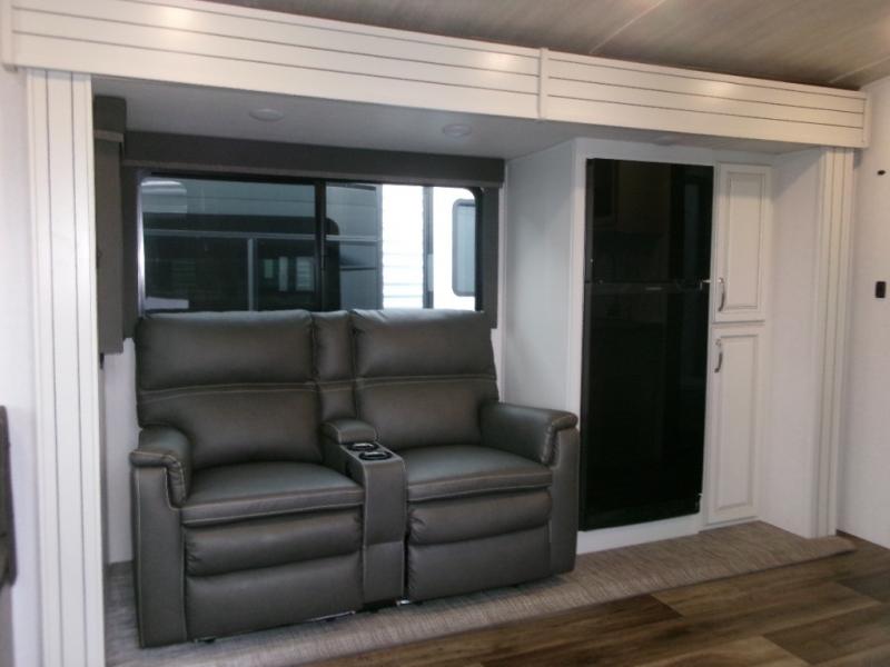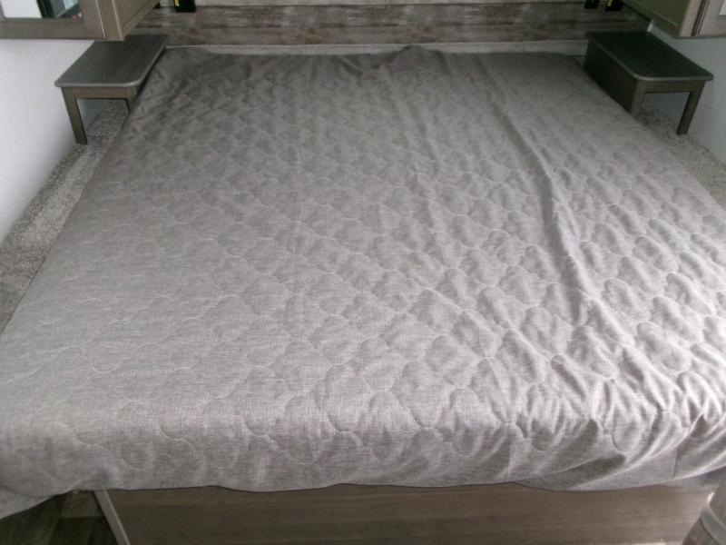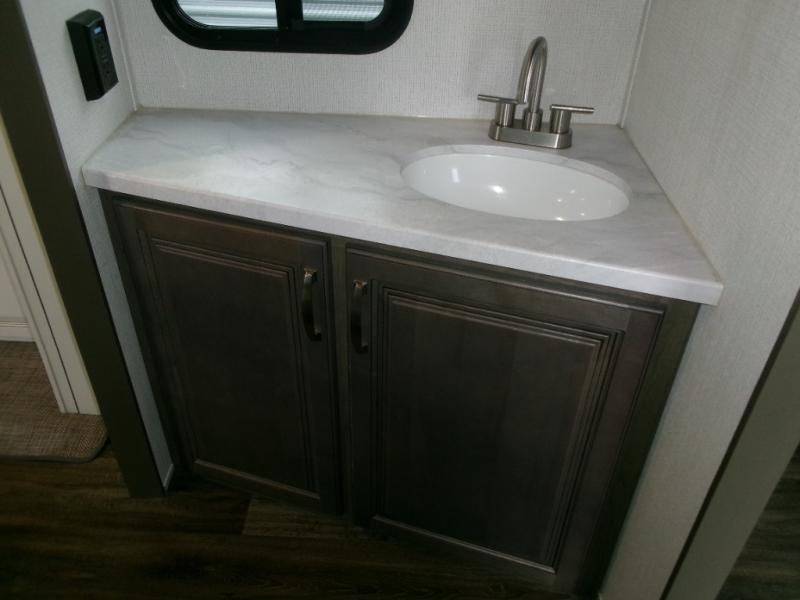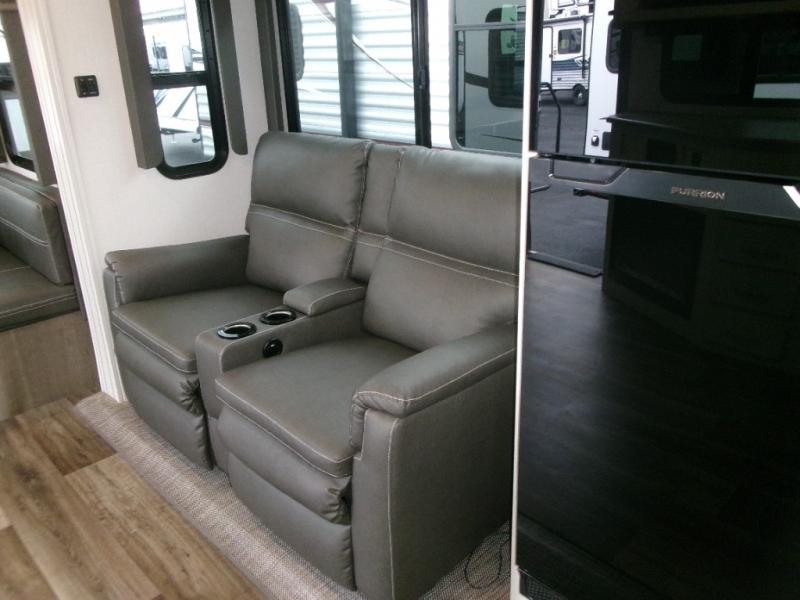 This Cougar Half-Ton travel trailer has an excellent dining area with its huge rear U-shaped dinette! Right next to the dinette is a large slide out that holds the 68" tri-fold sleeper sofa, 10.4 cu. ft. refrigerator, and a pantry. The kitchen has been excellently appointed with a Furrion range, foil-wrapped seamless countertops, a stainless steel undermount sink, and a microwave, and you will be grateful that you can access both sides of the walk-through bathroom. The private bedroom is ultra convenient with its exterior entrance, king-size bed, and wardrobe/nightstands on either side of the bed.