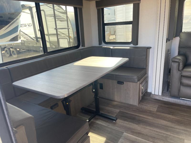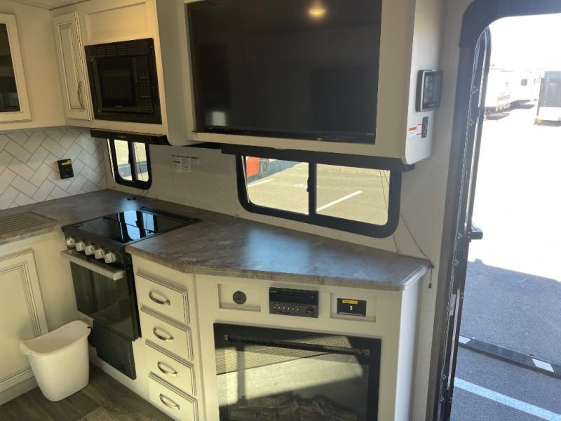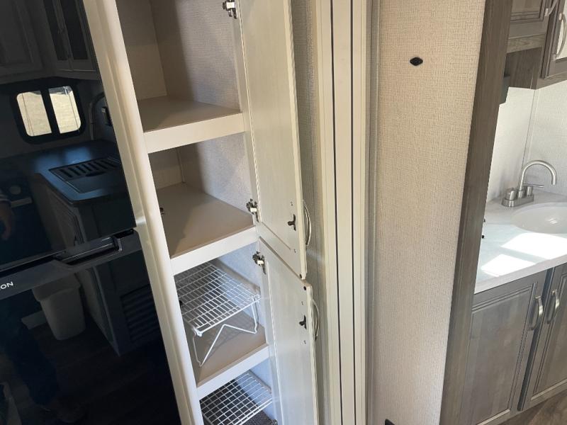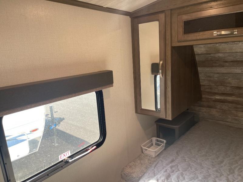 You will enjoy all of your adventures with this Cougar Half-Ton travel trailer in tow! Inside, you will find ample space and seating with a large slide that includes a tri-fold sofa sleeper along one side and a U-shaped dinette across the entire back of the unit making mealtime and game time loads of fun. These features will allow you to easily entertain your RV park friends and overnight guests too. The tri-fold sofa sleeper can comfortably sleep two guests who will also enjoy the cozy electric fireplace on a cool chilly night. A private front bedroom including a king-size bed will ensure that you have a great night's rest, and the private second entry door into the front bedroom makes it easy to slip out for a morning walk before your guests awake. This unit also features ample storage both inside and out with a front pass-through compartment, wardrobes and overhead cabinetry throughout, and a pantry for your non-perishables.