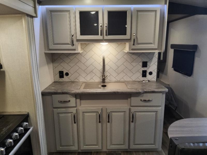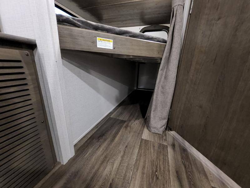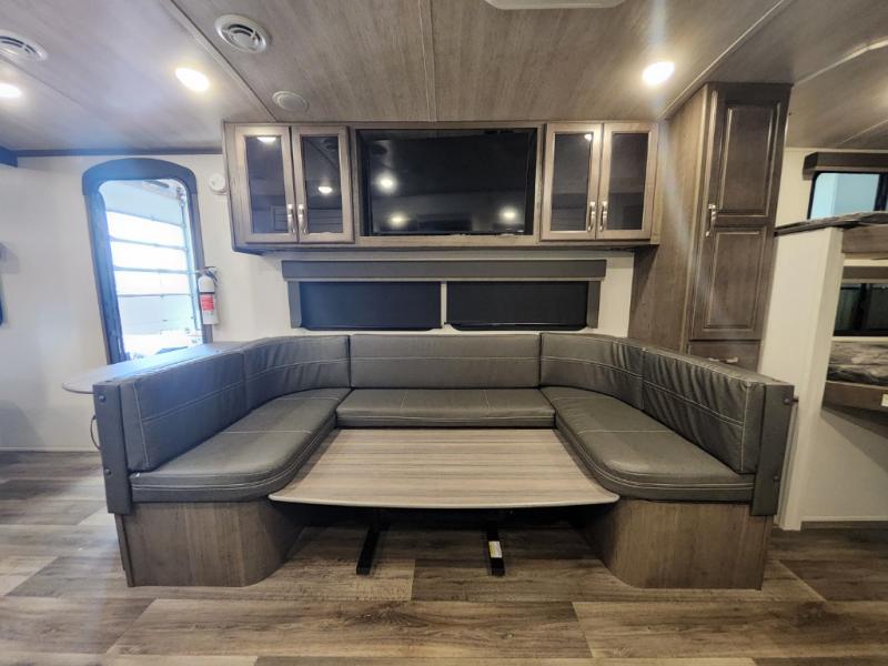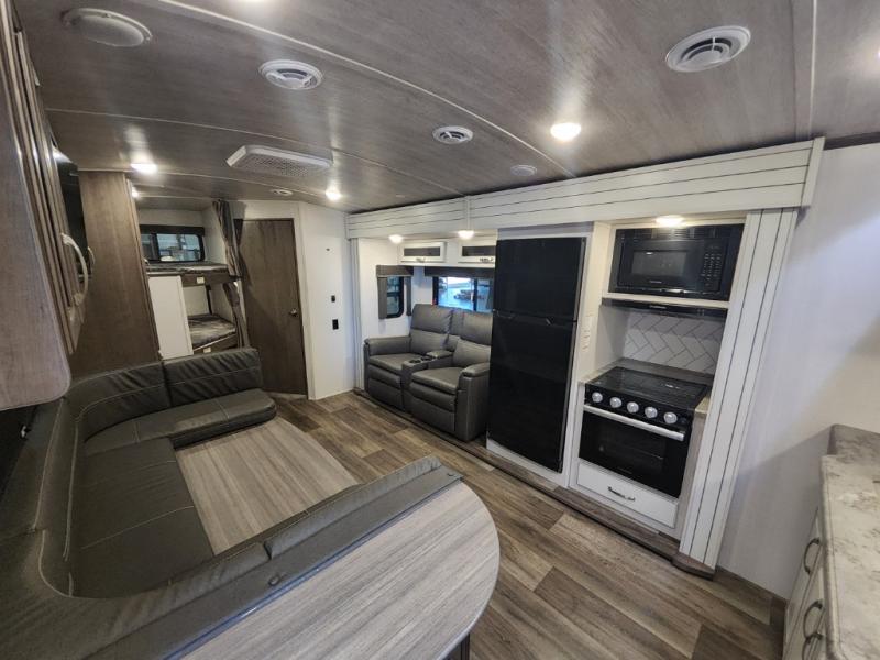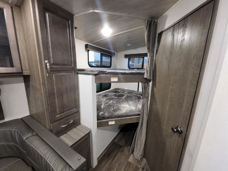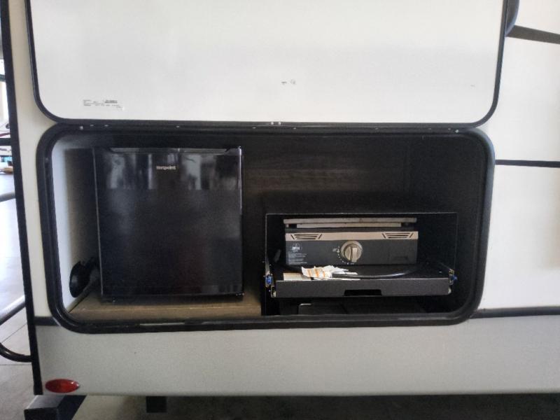 Your whole crew will feel at home in this spacious trailer that can sleep ten people each night. Your guest will enjoy the double-size bunks, and since the lower bunk flips up for storage and there is a rear cargo door, you can bring along the kayaks! Other guests can make their bed on the tri-fold sleeper sofa and U-shaped dinette when they're not being used as seating space, and there is plenty of storage throughout for everyone's belongings. The full kitchen includes a 12V refrigerator, a microwave oven, plus a 21" Furrion range to cook meals at, plus there is an outdoor kitchen with a Capital griddle and a mini refrigerator. When you're ready to call it a night, head to the front private bedroom for a great night's rest on the walk-around king bed!