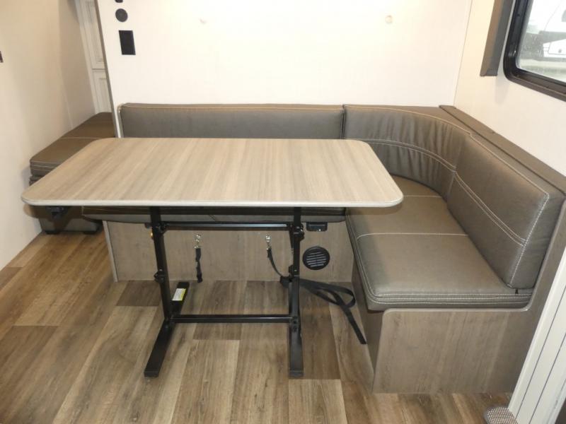 If you're needing additional sleeping space or a place to work on the road, take a look at this fifth wheel! The bunkhouse includes three bunks, and the lower bunk can swing up so you can work at the desk. There is also an exterior cargo door here so you can pack luggage right into the bunkhouse. You will have your own private bedroom up front with a walk-around queen bed, a wardrobe slide, plus dual wardrobes and nightstands. The main living area will be a favorite hangout spot with its theater seats, L-shaped sofa with a table dinette and an ottoman, plus an LED HDTV. This model also includes a 20' power awning, LCI solid steps, and an exterior mini refrigerator and Capital griddle for breakfast outdoors!