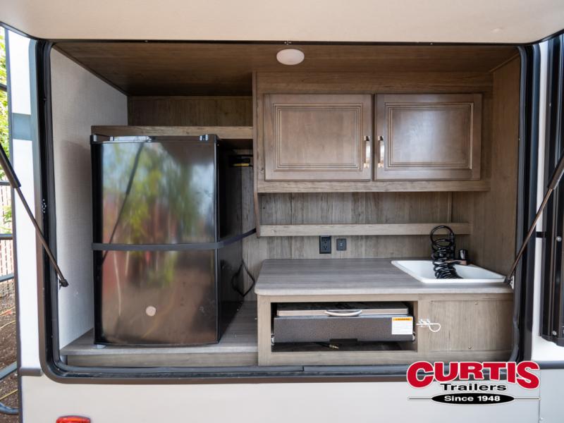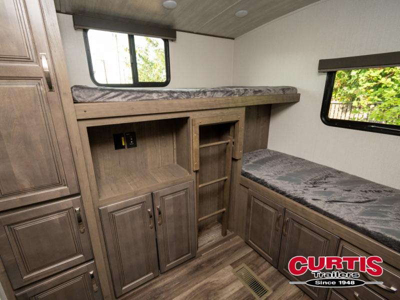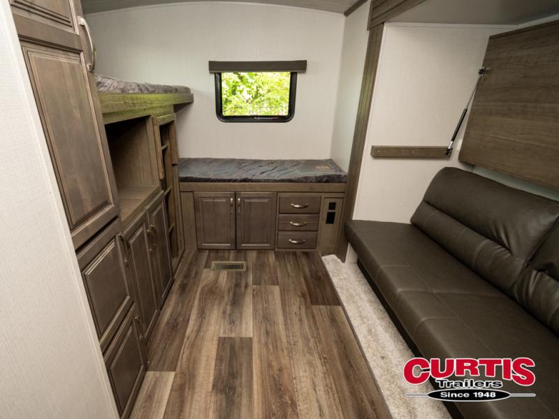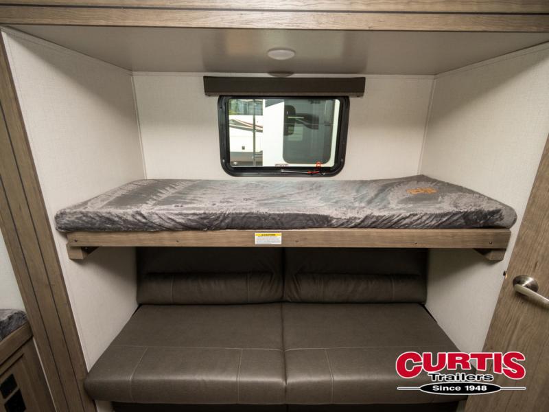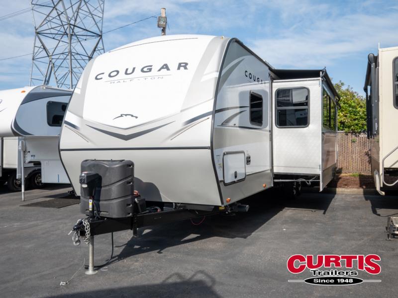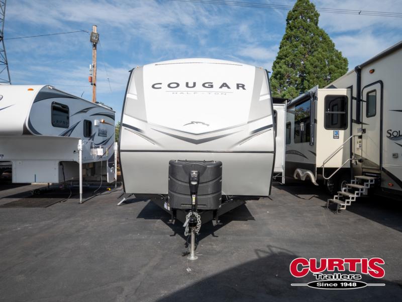 Imagine loading up the family and heading out in this Cougar Half-Ton travel trailer to your favorite campground. If you enjoy the great outdoors, the capital grill, mini refrigerator, and sink provide an outside cooking spot you are sure to use often. Inside the rear bunkhouse, you will find sleeping space and a hangout room for the kiddos and their friends. There are triple bunks and a sofa in this private room. You can access the full bath just outside of the bunkhouse or from outside of this trailer thanks to the two entry doors into the trailer. You will find plenty of space to relax inside this trailer with the two slide outs, and you can also relax outside underneath the power awning.