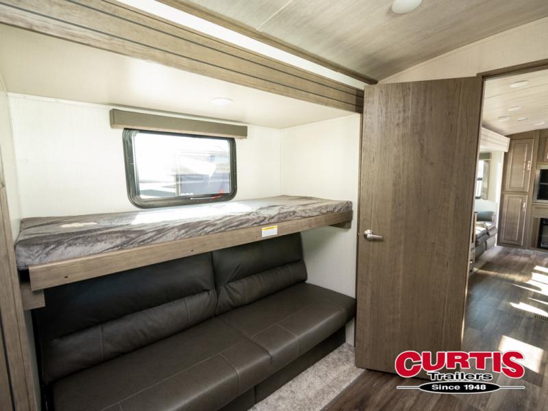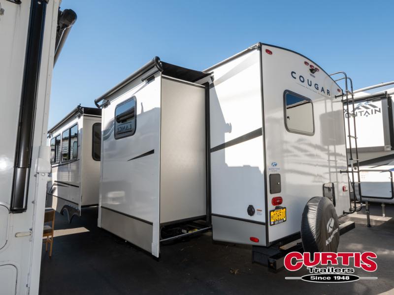 Imagine loading up the family and heading out in this Cougar Half-Ton travel trailer to your favorite campground. If you enjoy the great outdoors, the capital grill, mini refrigerator, and sink provide an outside cooking spot you are sure to use often. Inside the rear bunkhouse, you will find sleeping space and a hangout room for the kiddos and their friends. There are triple bunks and a sofa in this private room. You can access the full bath just outside of the bunkhouse or from outside of this trailer thanks to the two entry doors into the trailer. You will find plenty of space to relax inside this trailer with the two slide outs, and you can also relax outside underneath the power awning.