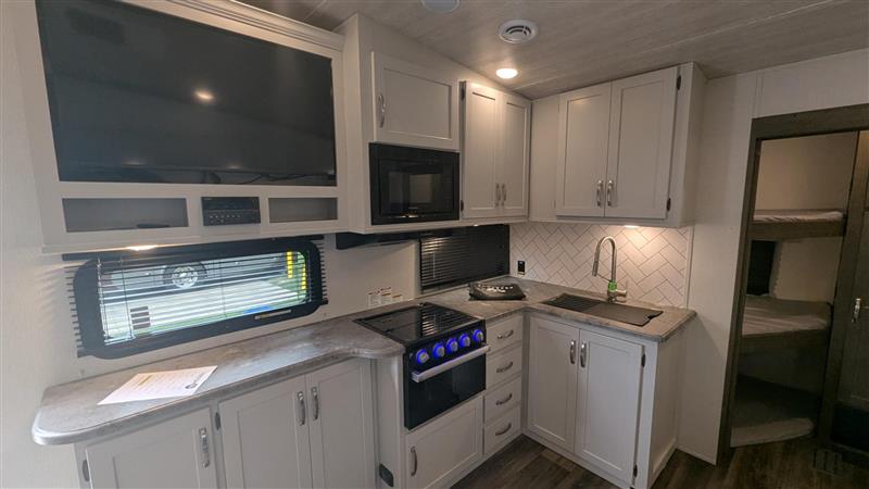 This limited edition lightweight Cougar Sport bunk model features sleeping for ten or more with triple stacked double bed bunks in the rear bunk room, a large u-shaped dinette that can be transformed into sleep space, as well as a tri-fold sofa sleeper and a queen bed in the private bedroom up front. So, tell the kiddos that they can invite a few friends because there is room for everyone! The u-shaped dinette will seat quite a few of you for meals and even game time, plus the sofa is nearby for even more to kick back on. A fully equipped kitchen with overhead microwave, a three burner range w/oven, and large sink plus storage will make it easy to keep everyone fed and happy. A 10 Cu. Ft. 12 volt refrigerator will keep all of your perishable items fresh, and there are plenty of cabinets for storing snacks and dry goods as well. Head up the steps to the bathroom featuring a shower with skylight, sink with overhead medicine cabinet, and toilet. The private front bedroom takes you away from the hustle and bustle of the main living area and bunkhouse to provide a relaxing retreat including a comfy queen bed, dual nightstands and shirt wardrobes as well as a wardrobe with two drawers along the interior wall for even more storage.