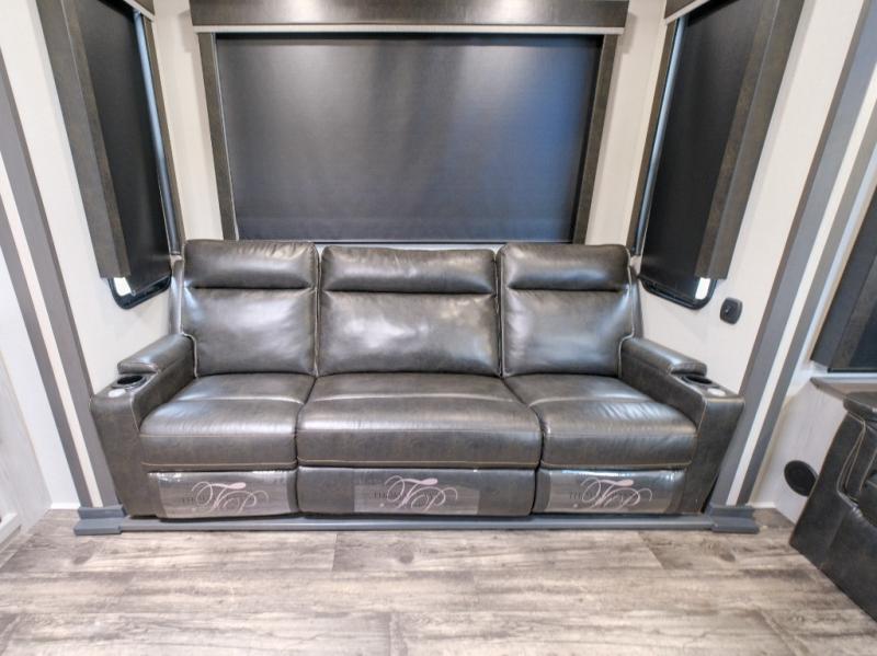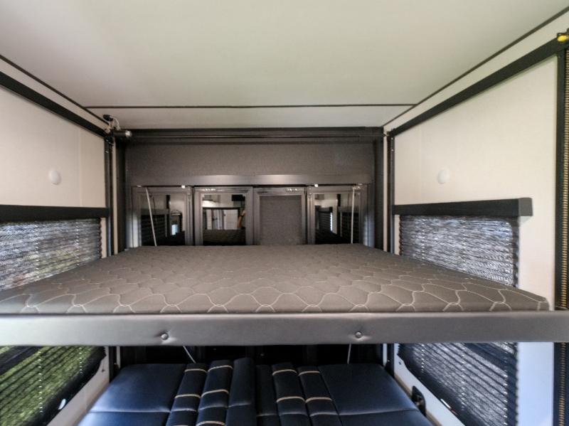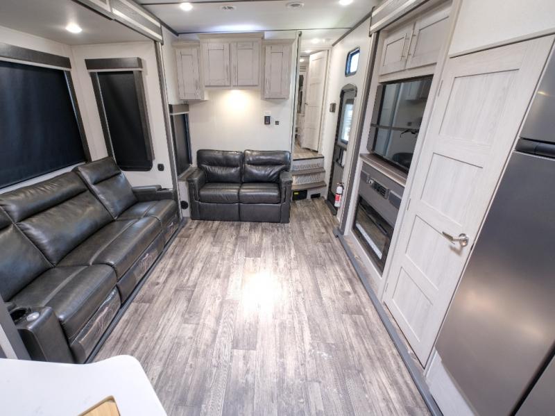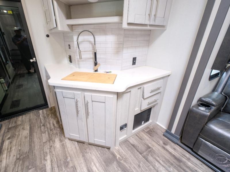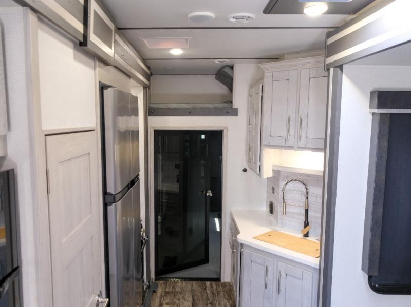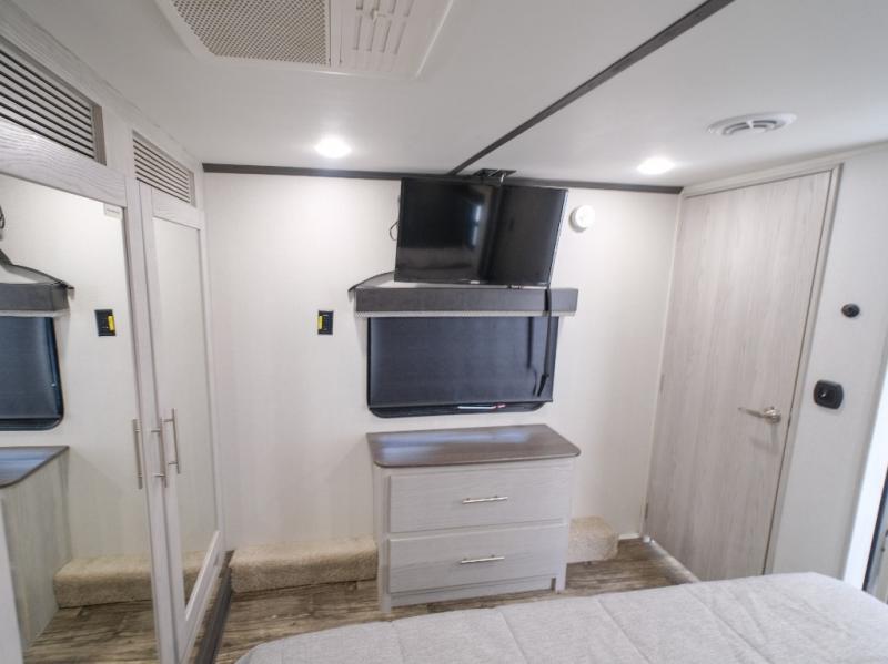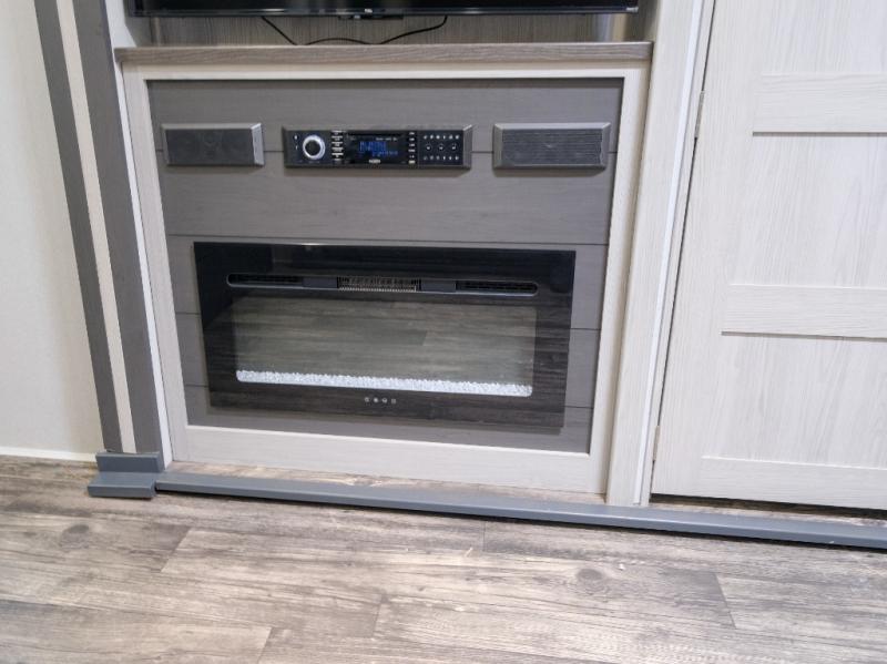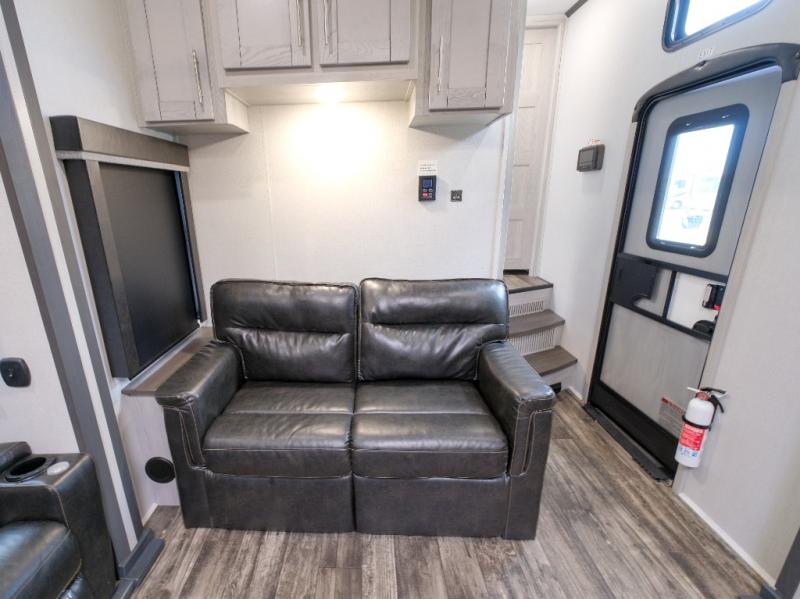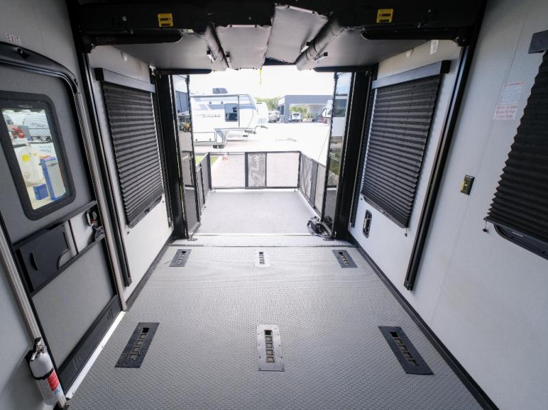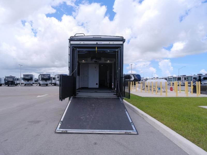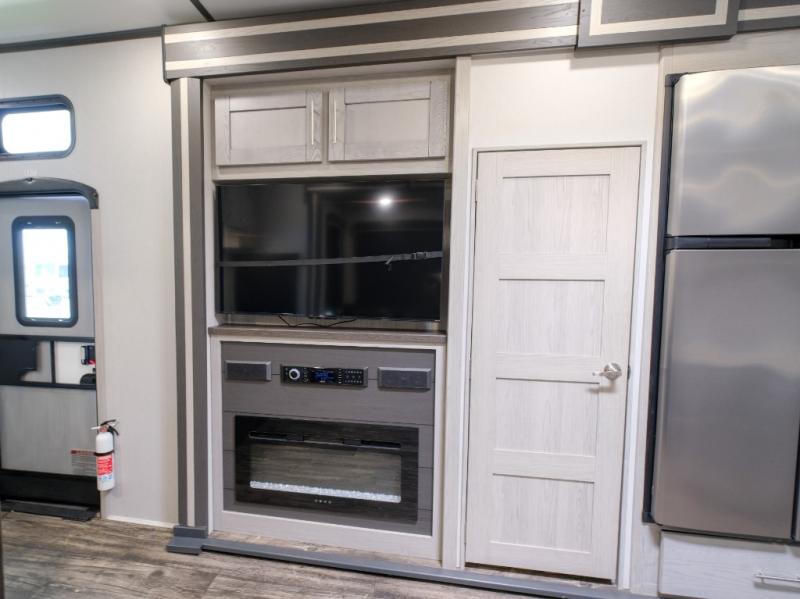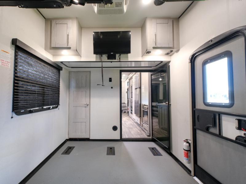 You won't believe what this toy hauler has in store for you! Starting with the dual entry doors for a smooth flow of traffic to the outdoor entertainment center with an LED TV, a pull-out cooktop, and a refrigerator. You can prepare your best meals with the three burner cooktop, store your favorite snacks in the large pantry, and pop a bag of popcorn in the convection microwave for movie night. The sofa slide and hide-a-bed sofa offer comfortable places to sit while you watch your movies on the LED TV with a fireplace below at the entertainment center. With a dual entry bathroom, everyone will be able to easily access it especially those staying in the front private bedroom which has a residential king bed slide, a dresser with LED TV, and a front master closet prepped to add an optional washer and dryer. The 13' garage area not only has dual opposing sofas with a queen bed above them, but also a loft with a bunk mat, a LED TV, and a half bathroom!