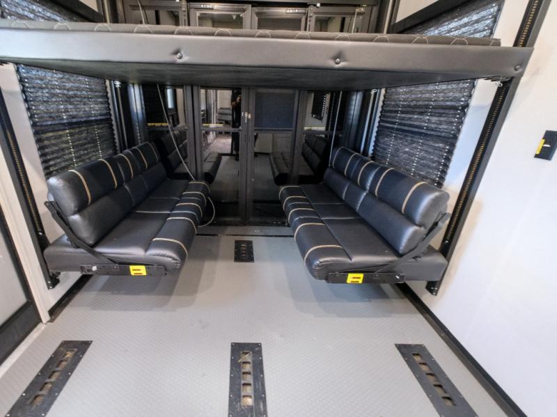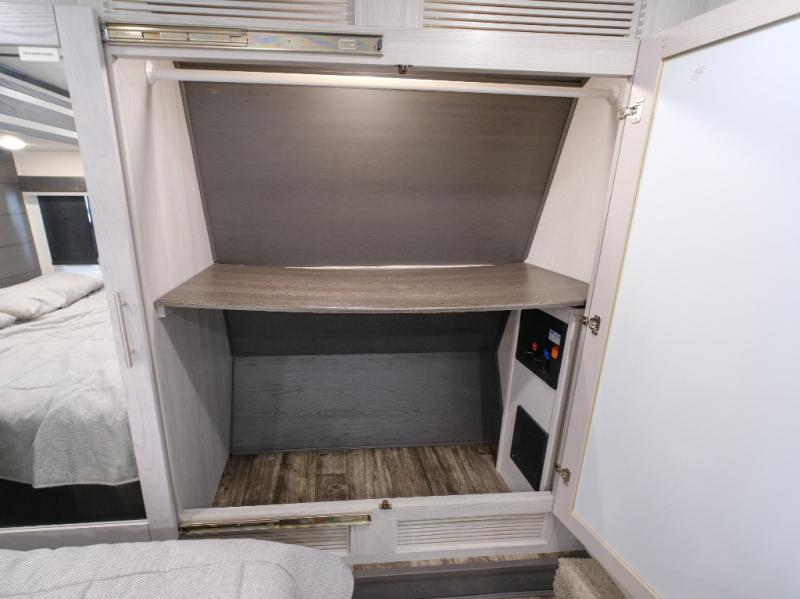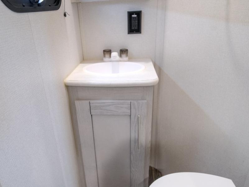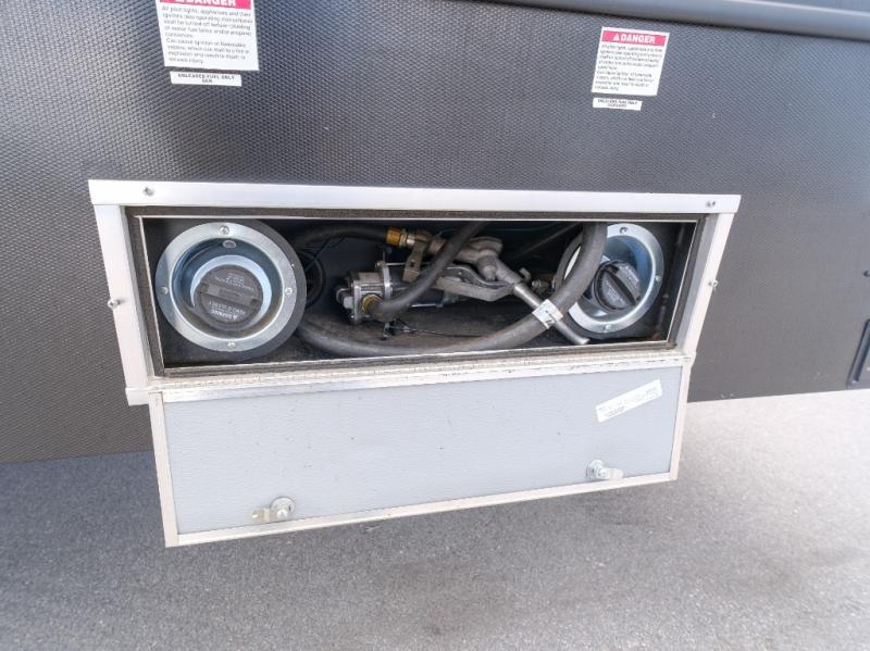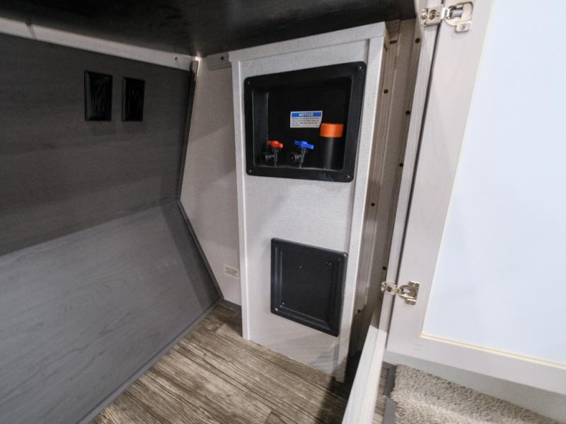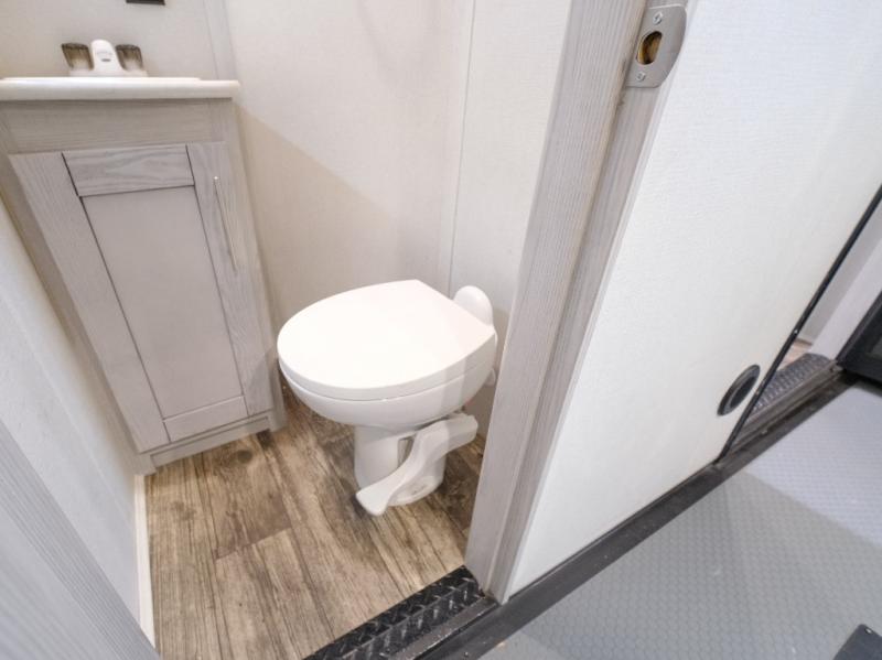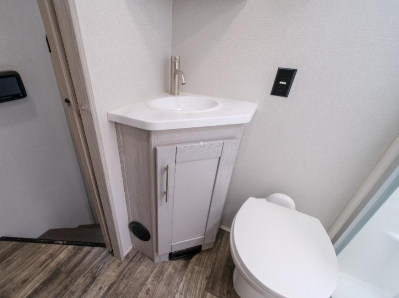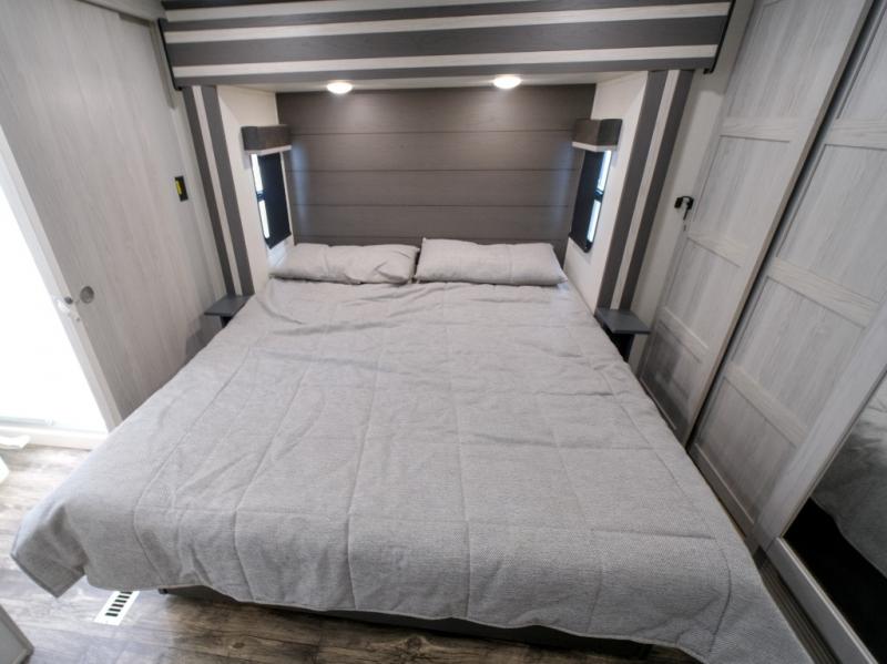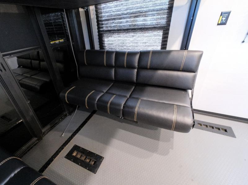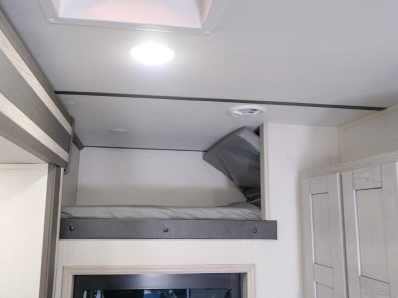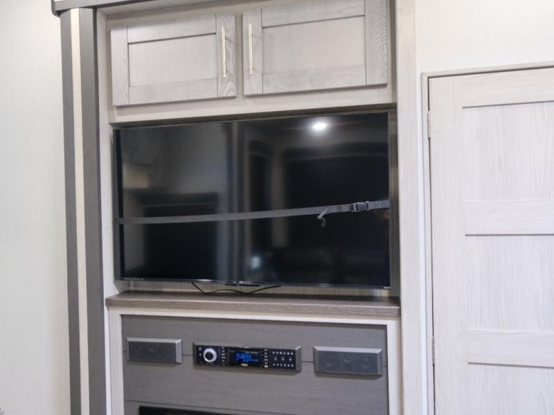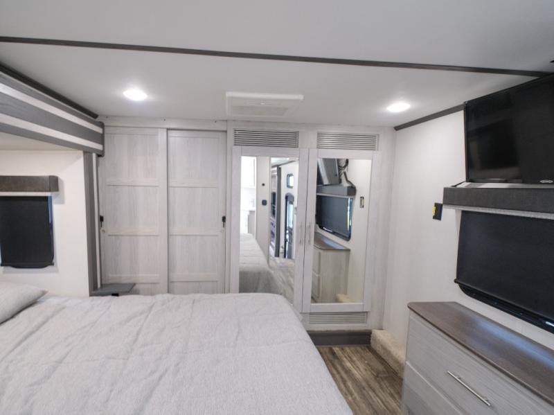 You won't believe what this toy hauler has in store for you! Starting with the dual entry doors for a smooth flow of traffic to the outdoor entertainment center with an LED TV, a pull-out cooktop, and a refrigerator. You can prepare your best meals with the three burner cooktop, store your favorite snacks in the large pantry, and pop a bag of popcorn in the convection microwave for movie night. The sofa slide and hide-a-bed sofa offer comfortable places to sit while you watch your movies on the LED TV with a fireplace below at the entertainment center. With a dual entry bathroom, everyone will be able to easily access it especially those staying in the front private bedroom which has a residential king bed slide, a dresser with LED TV, and a front master closet prepped to add an optional washer and dryer. The 13' garage area not only has dual opposing sofas with a queen bed above them, but also a loft with a bunk mat, a LED TV, and a half bathroom!