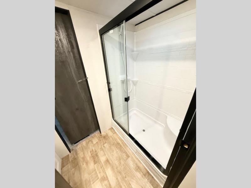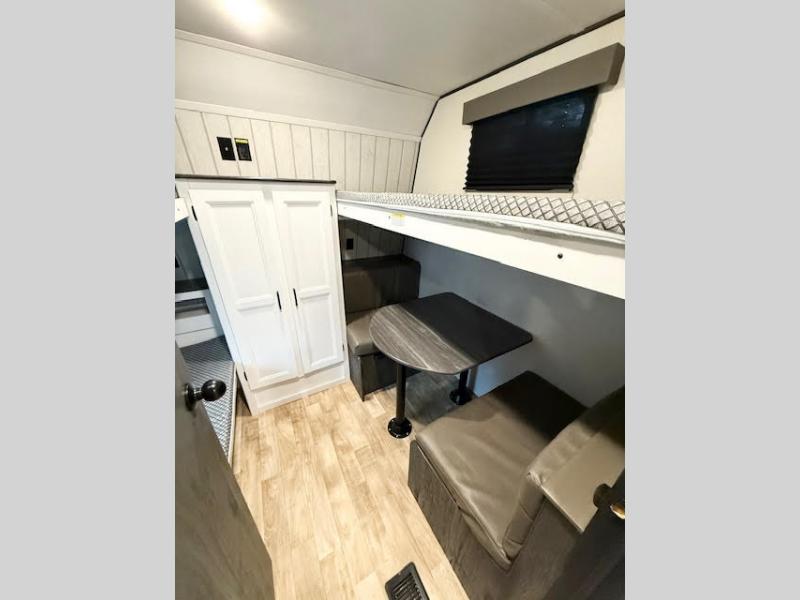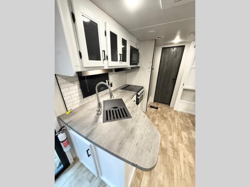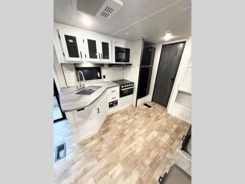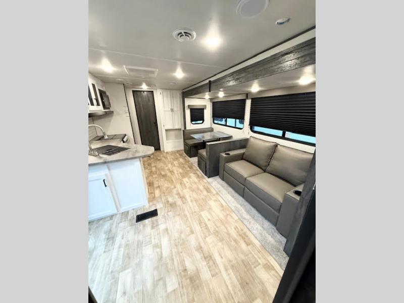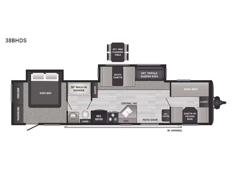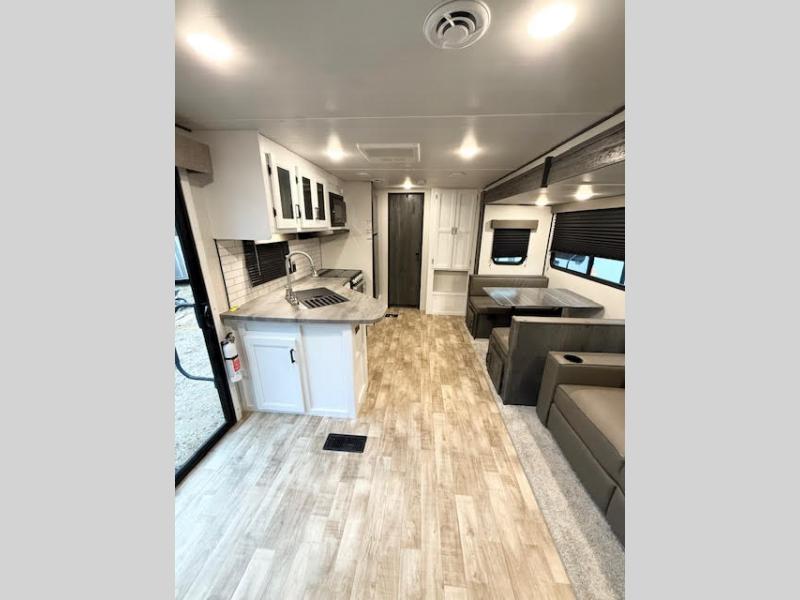 You'll be able to relax in true comfort with this Hideout destination trailer! Head to the private bedroom to get changed into your pajamas which are stored away in the wardrobe and dresser. If you're ready to head straight to bed, you can lie down on the king bed slide, or if you want to head out to the campfire, you can use the second exterior entry door to go right there. A walk-through bathroom connects the bedroom to the rest of the trailer, and it has a 38" walk-in shower. The kitchen's residential refrigerator and pantry will hold your food, and the three-burner range will help you prepare something delicious. You can use the central vacuum whenever you need to clean up a mess too.